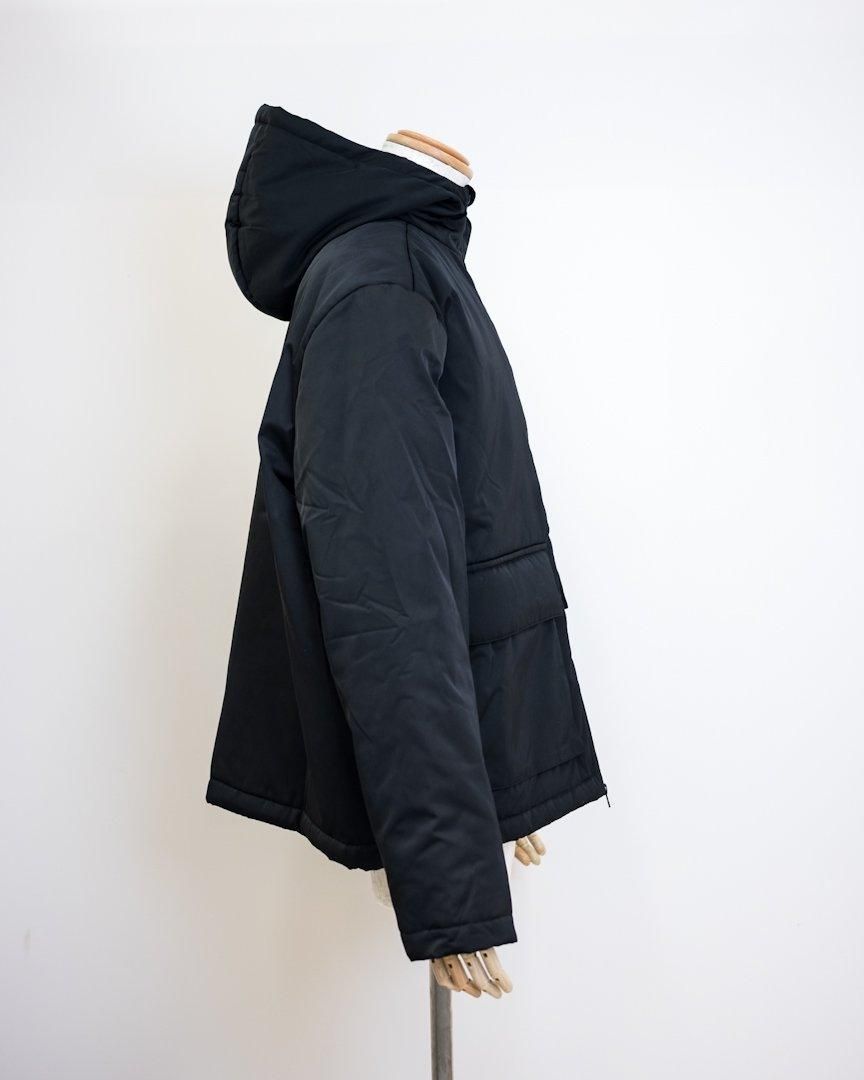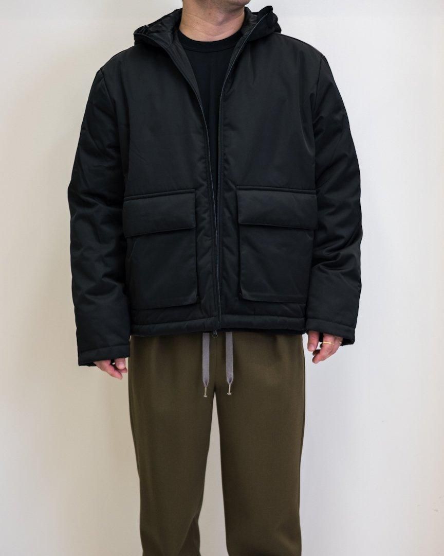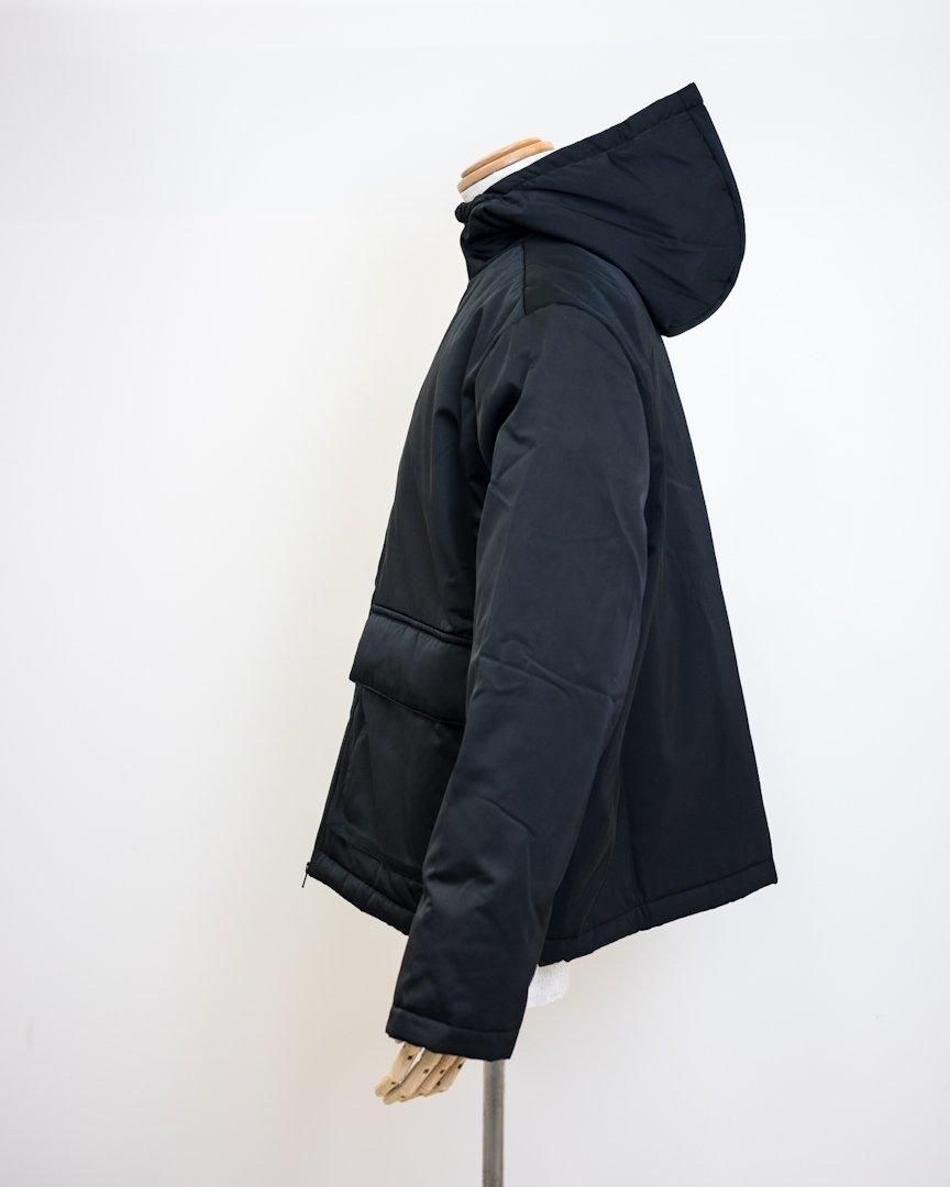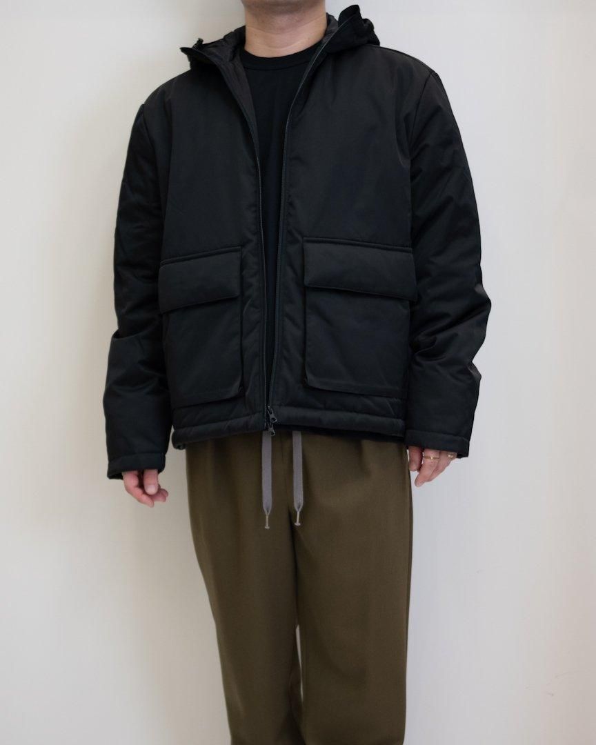 大きめのフラップ付きポケットがポイントのフードブルゾン。フラップは磁石で止められます。ショート丈ボックスシルエット。フラップポケット脇ポケット。左前内側ポケット。フードアジャスター付き。袖口リブ。