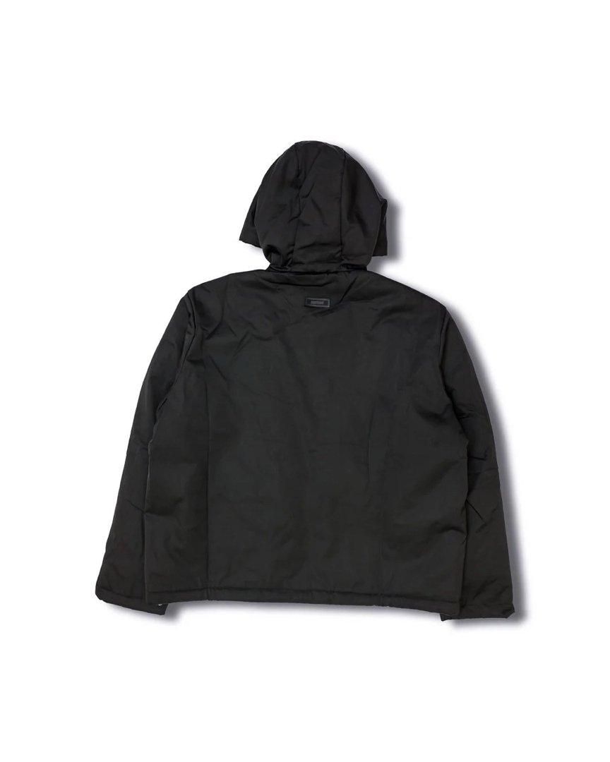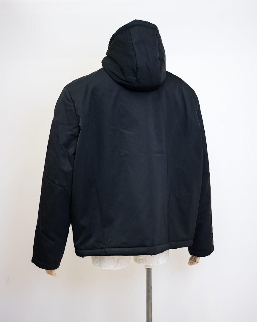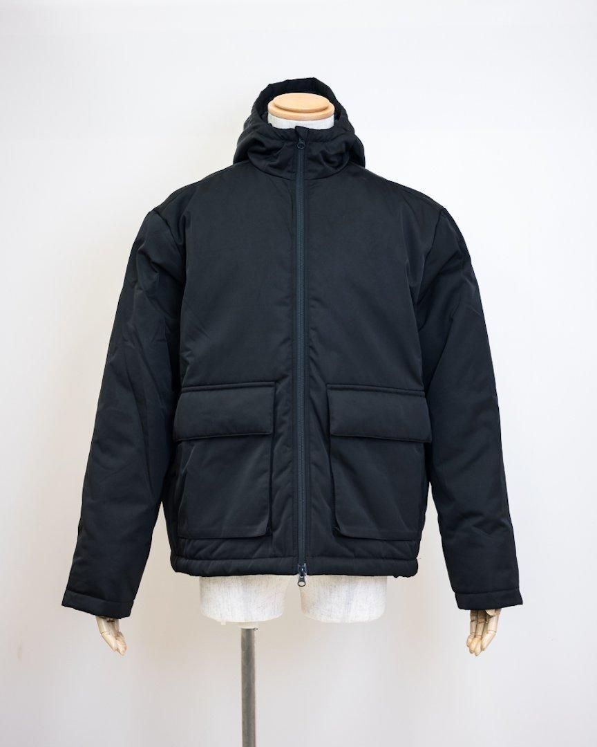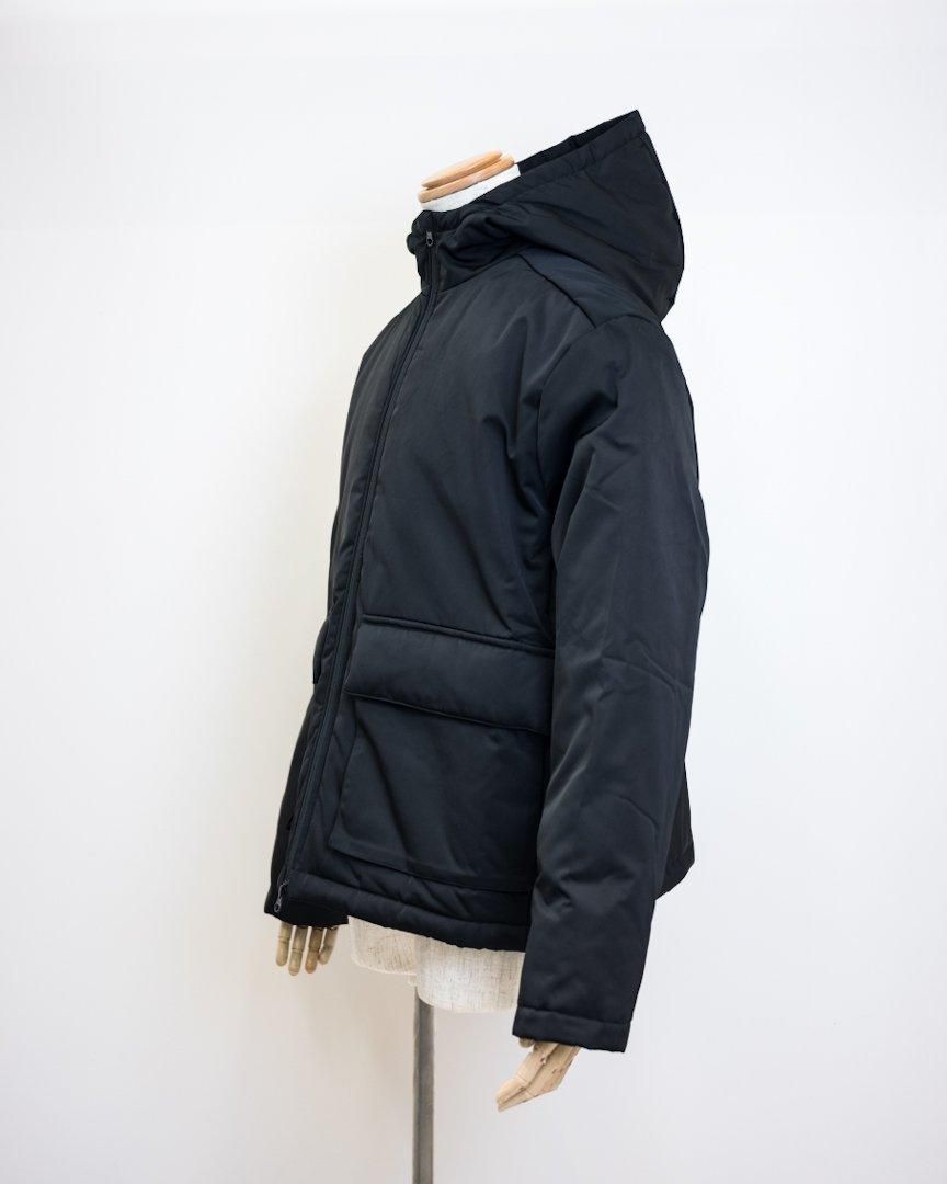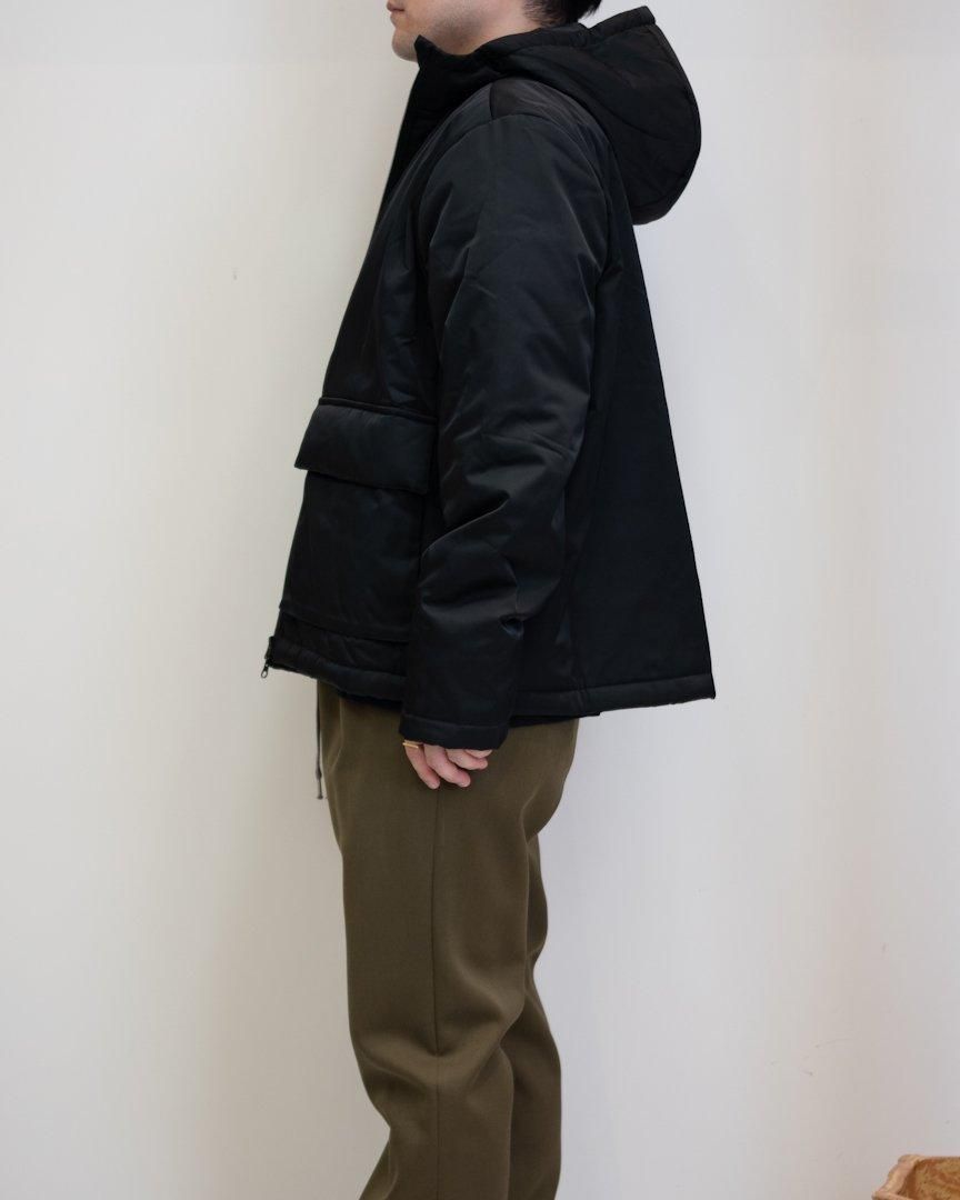 大きめのフラップ付きポケットがポイントのフードブルゾン。フラップは磁石で止められます。ショート丈ボックスシルエット。フラップポケット脇ポケット。左前内側ポケット。フードアジャスター付き。袖口リブ。