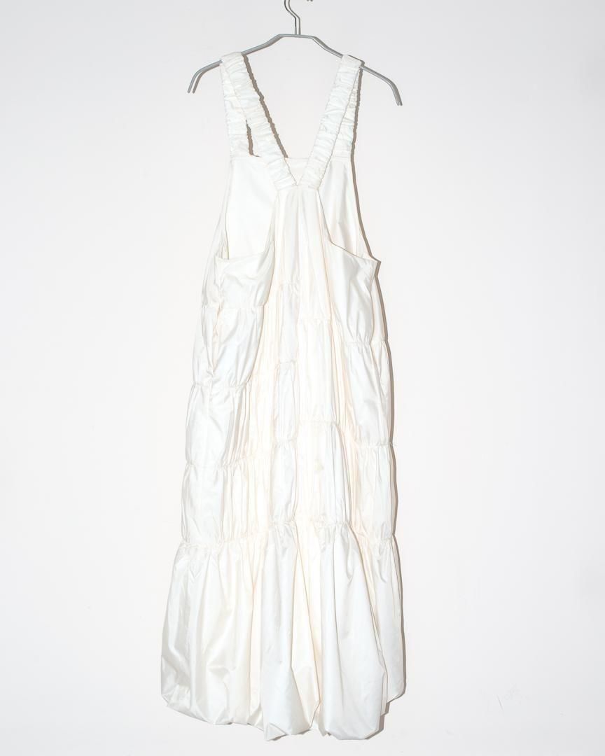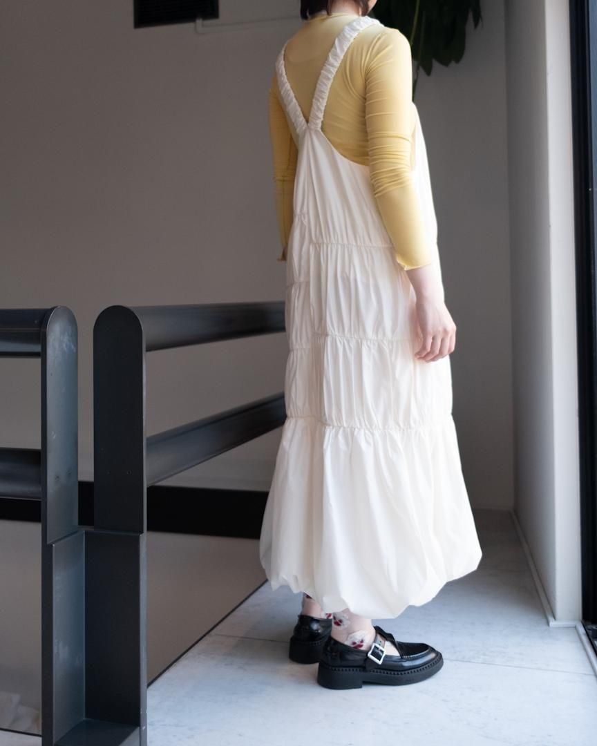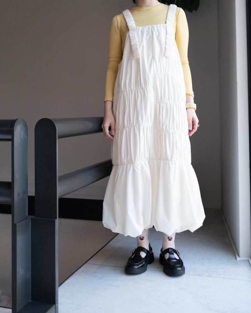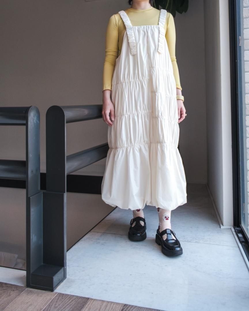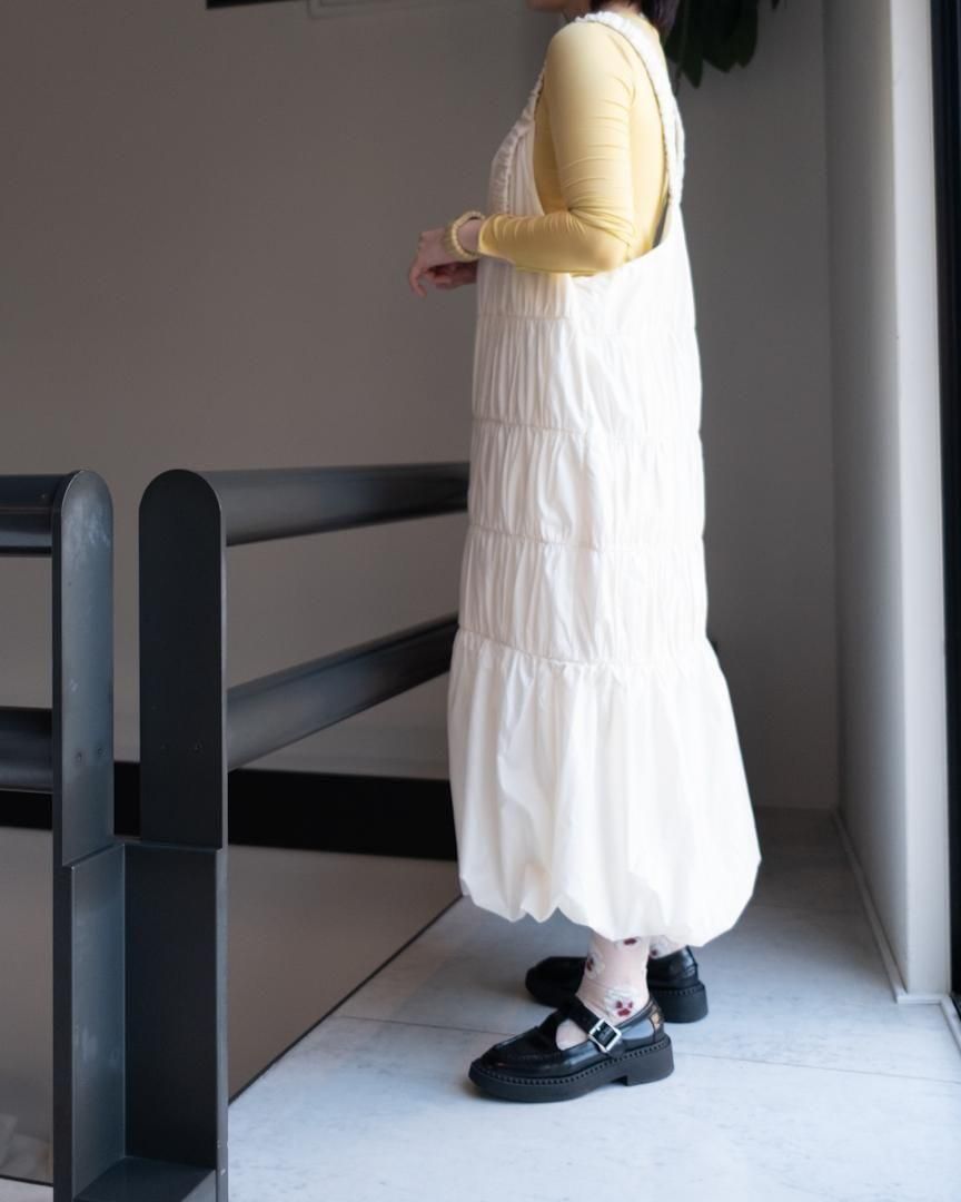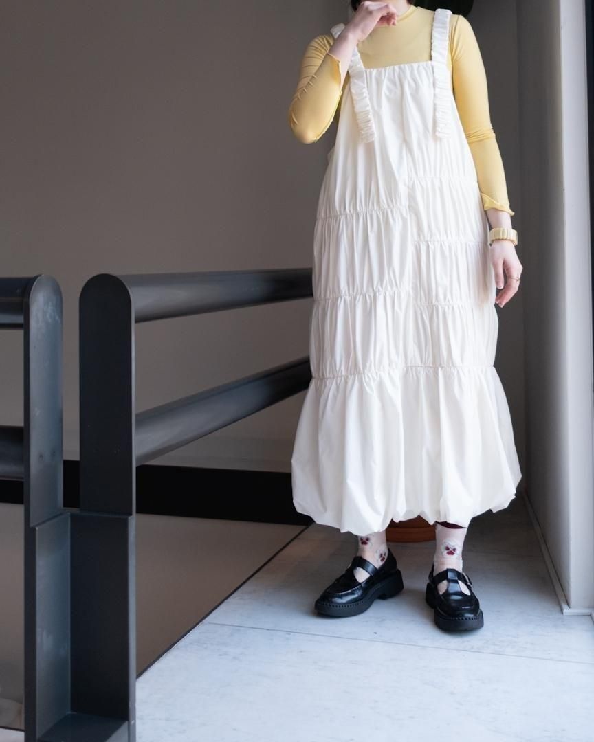 左右異なる切り替え部分にそれぞれあしらわれているギャザーデザインがポイントのジャンパースカート。