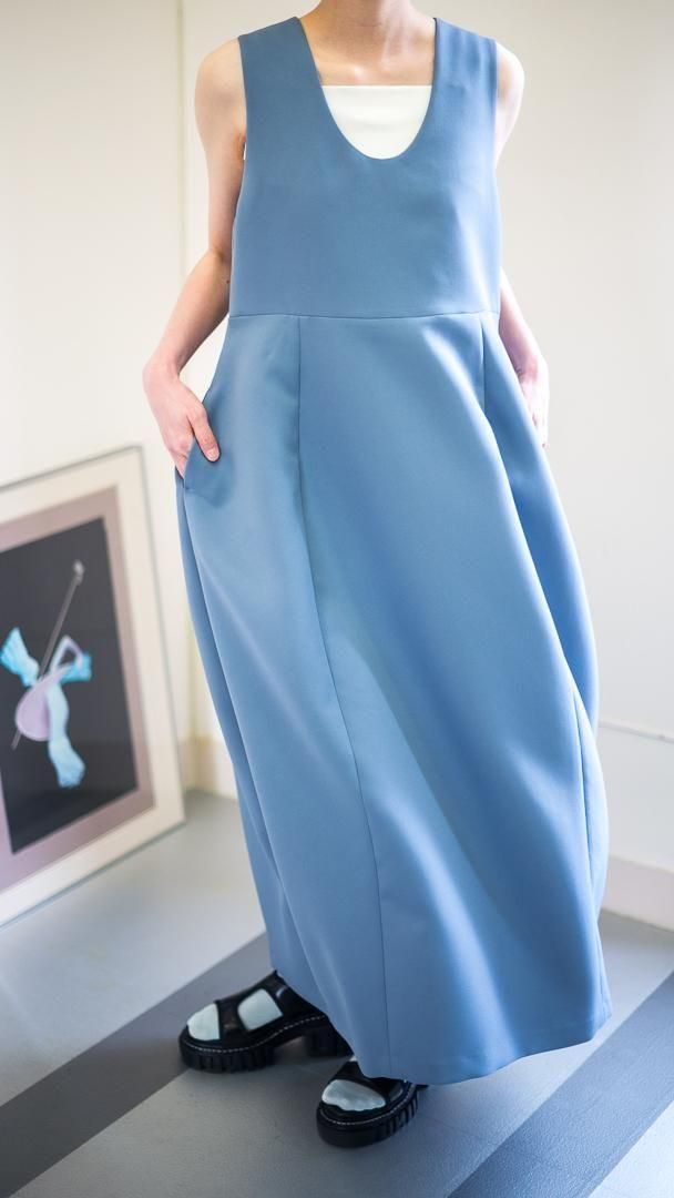 腰回りを膨らませたカーヴィーなフォルムが印象的なドレス。