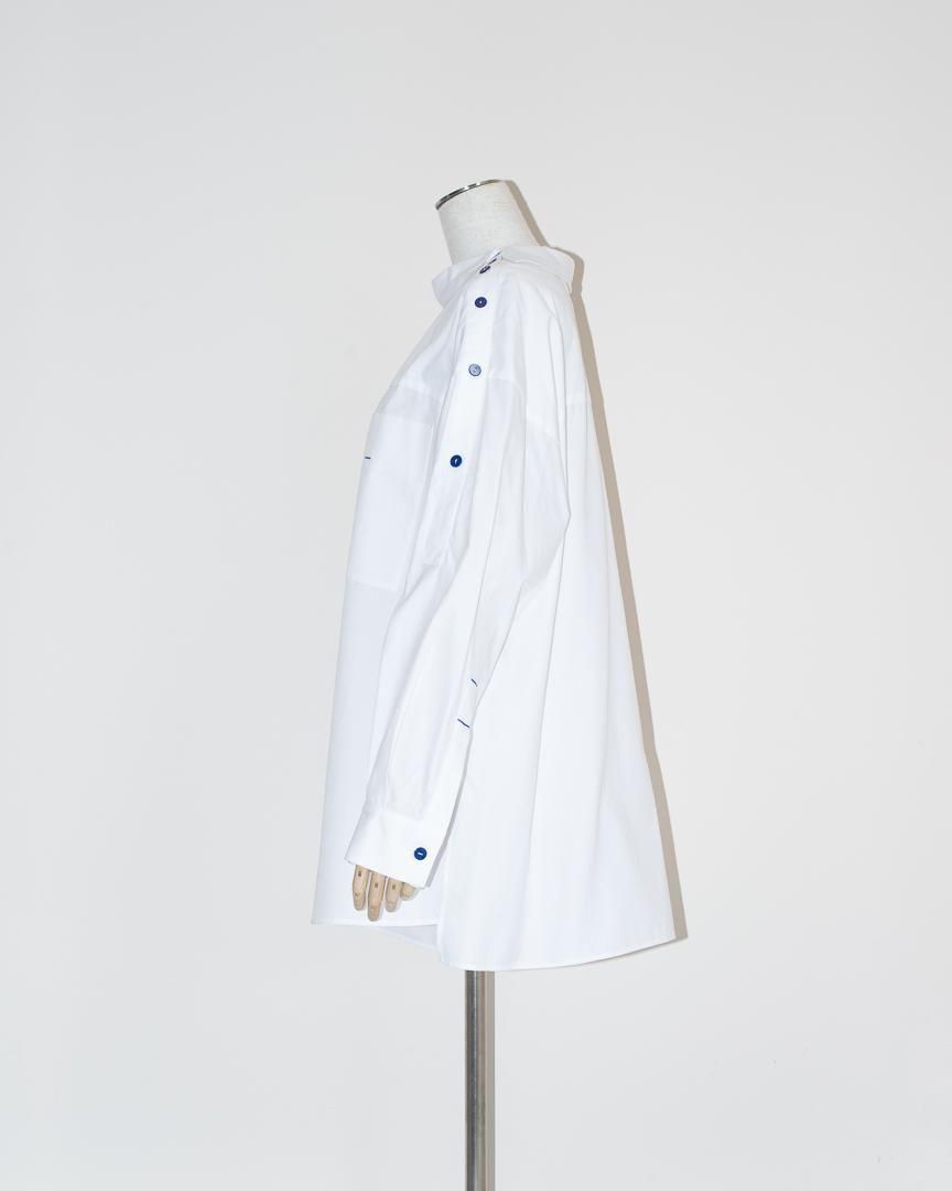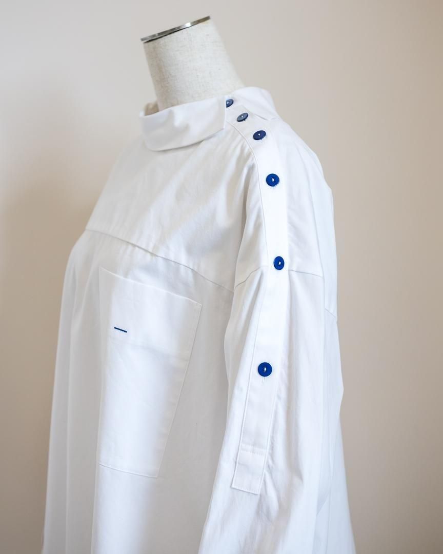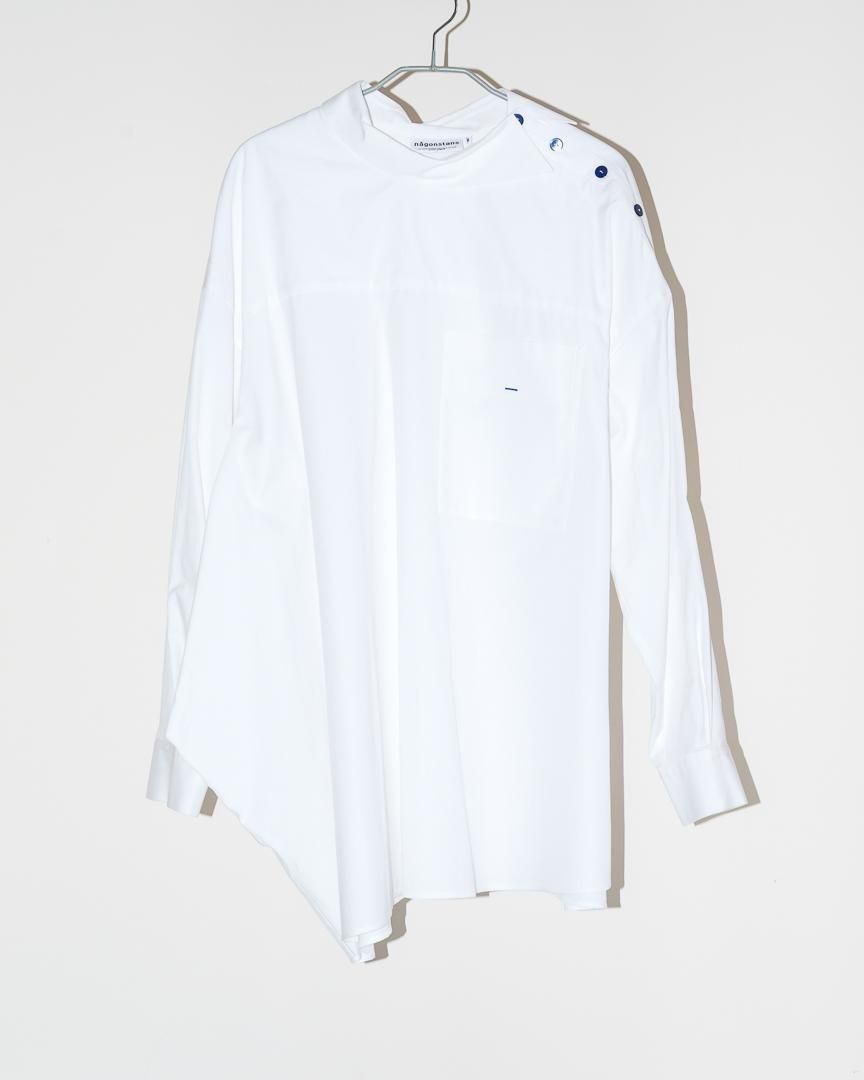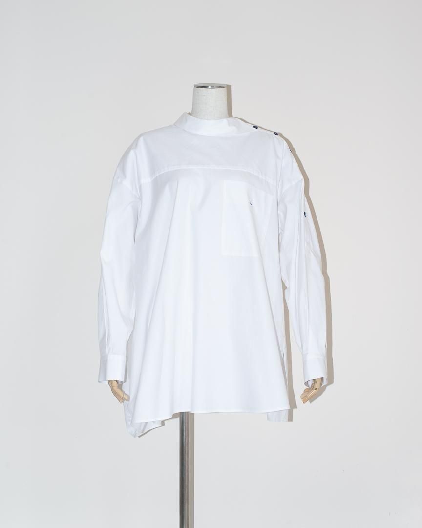 シャツの前開きが肩にずれたようなディティールが特徴的なプルオーバー。