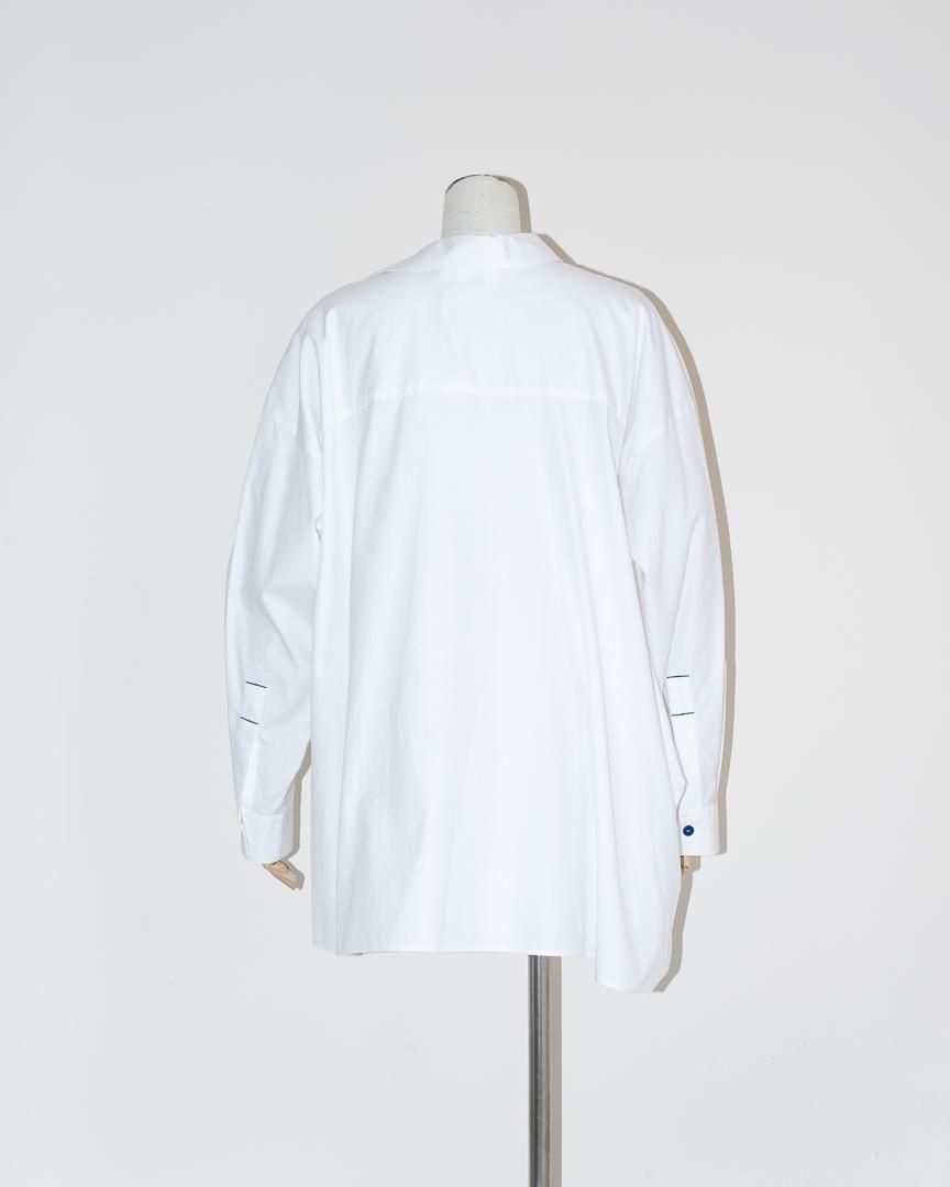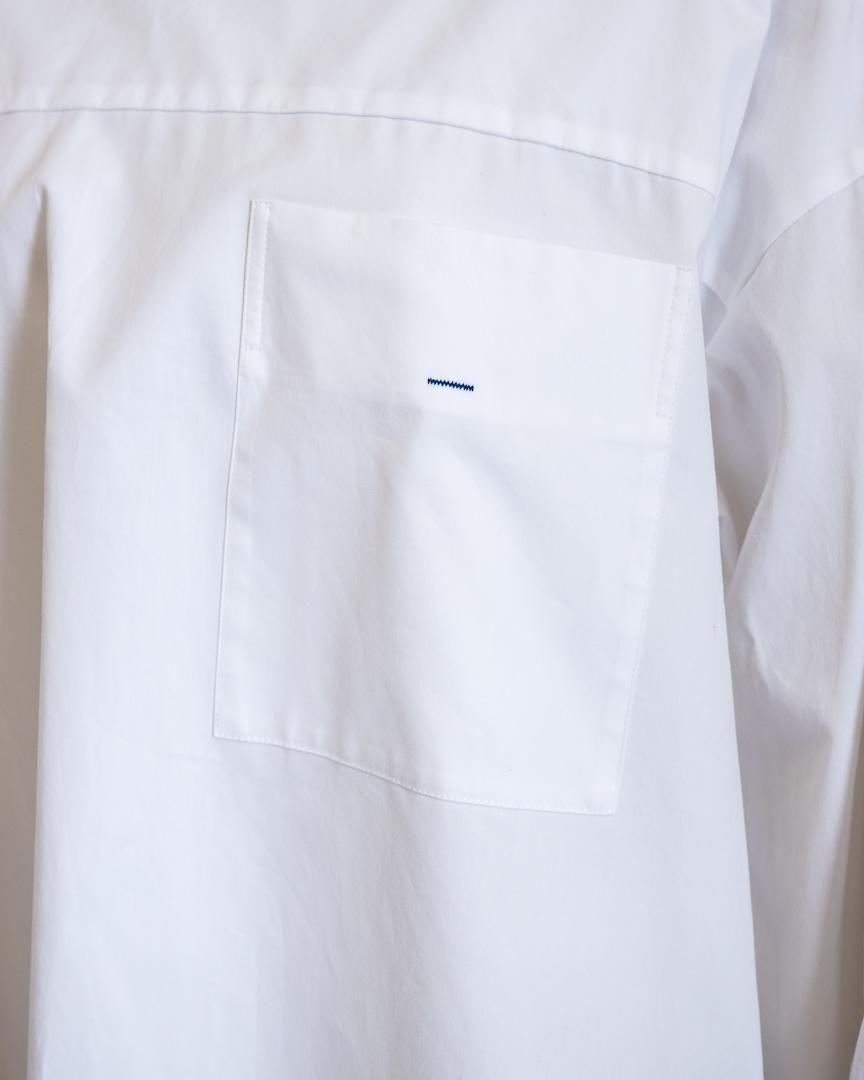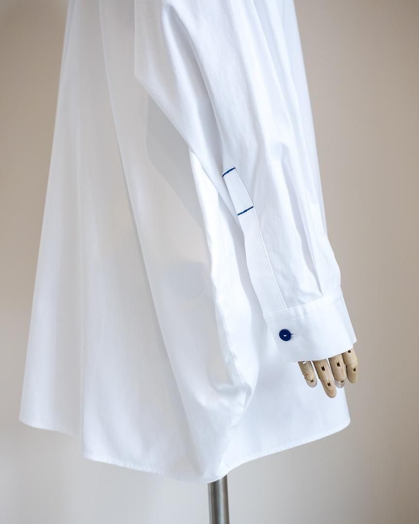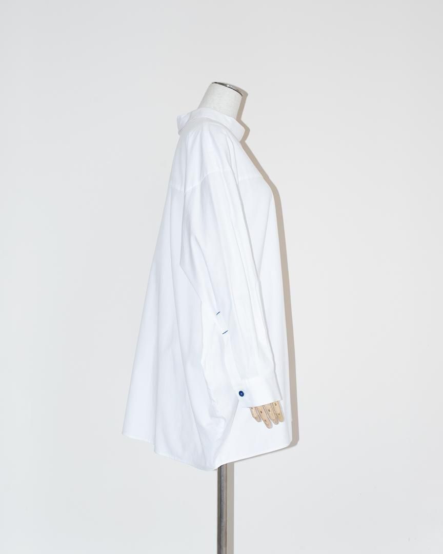 シャツの前開きが肩にずれたようなディティールが特徴的なプルオーバー。