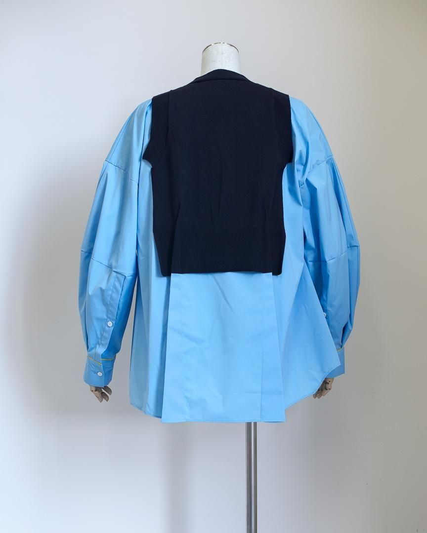 ヘキサゴンシルエットのシャツにベストをレイヤードしているかのようなドッキングデザインのプルオーバー。