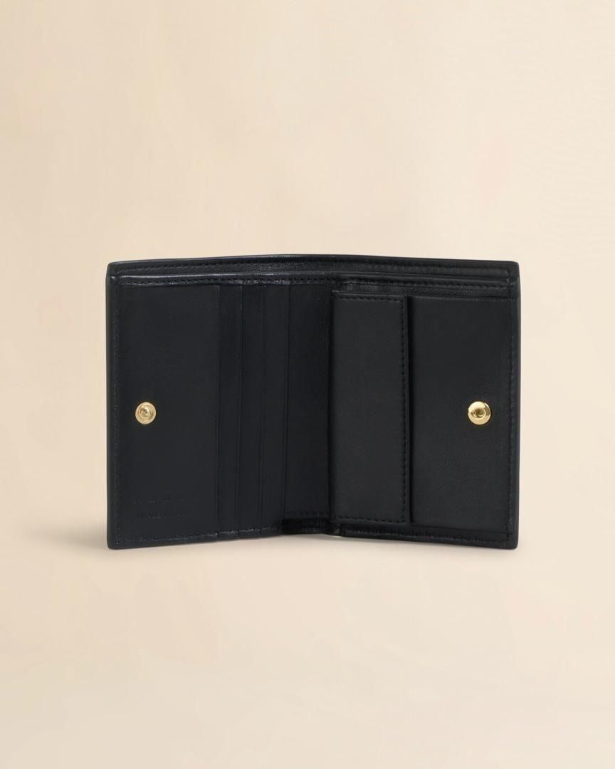 タンブルカーフレザー製二つ折りウォレット。 フロントにハンドメイドのジグザグステッチとマルニシンボルの刺繍。 スナップボタン留め。 スナップボタン開閉式のコインパース、内側には紙幣用スペースと4つのカードスロット。