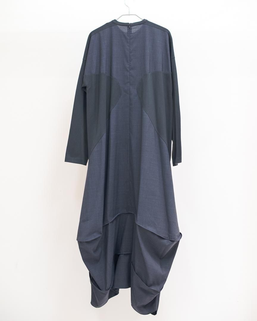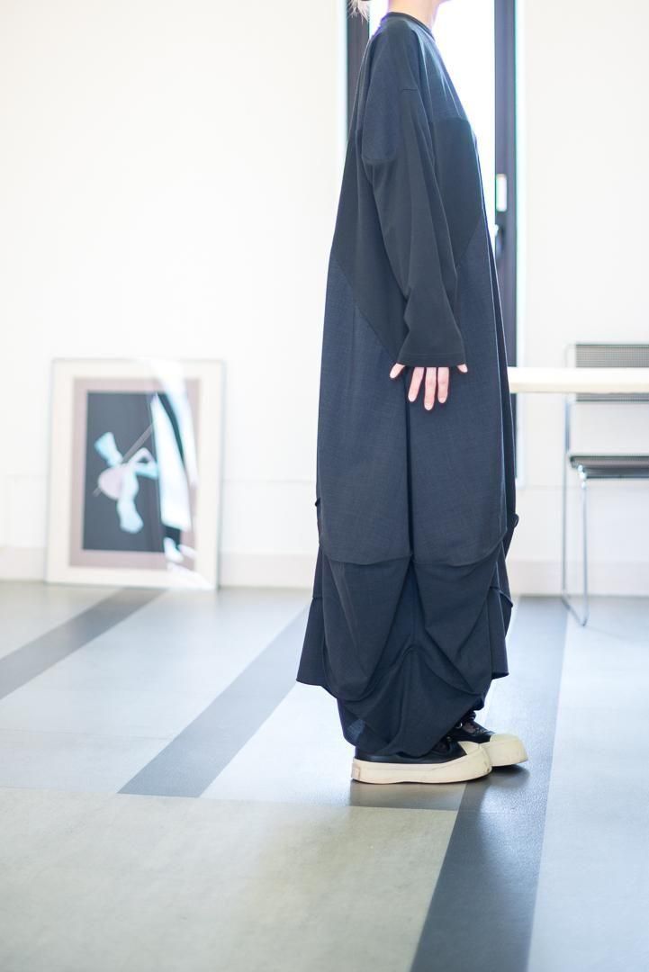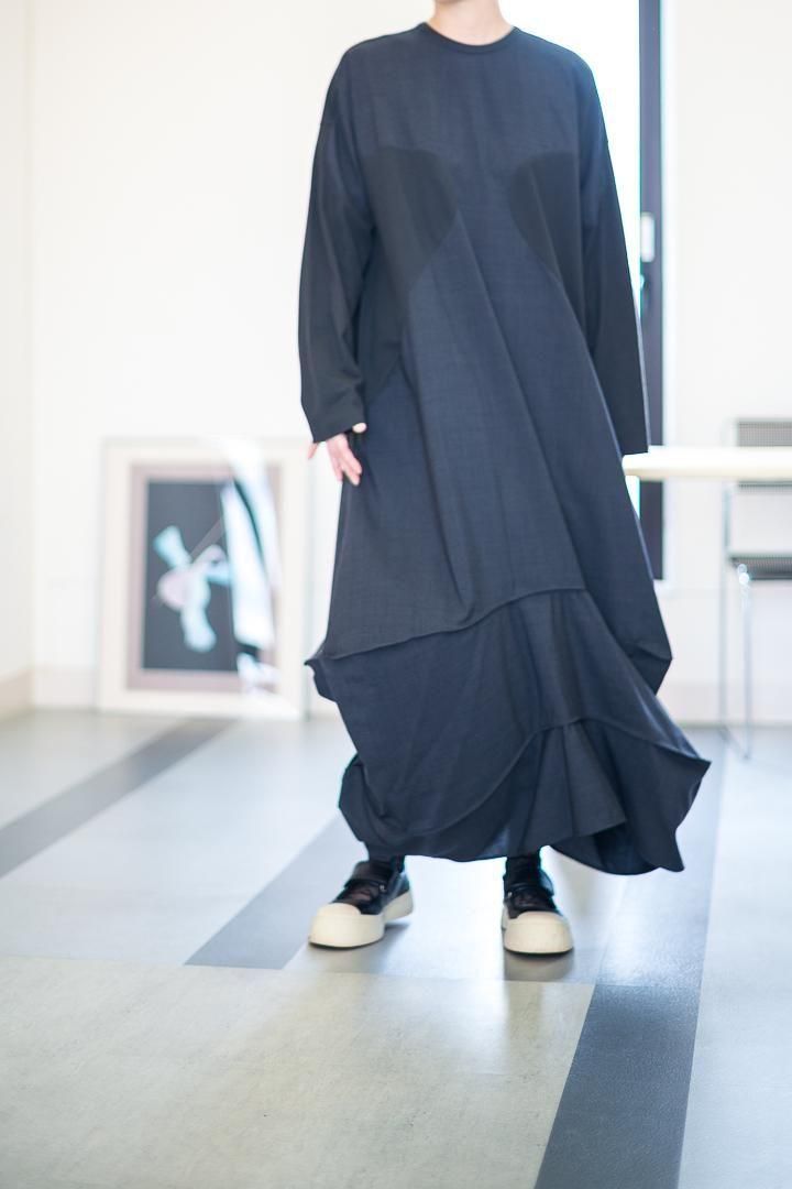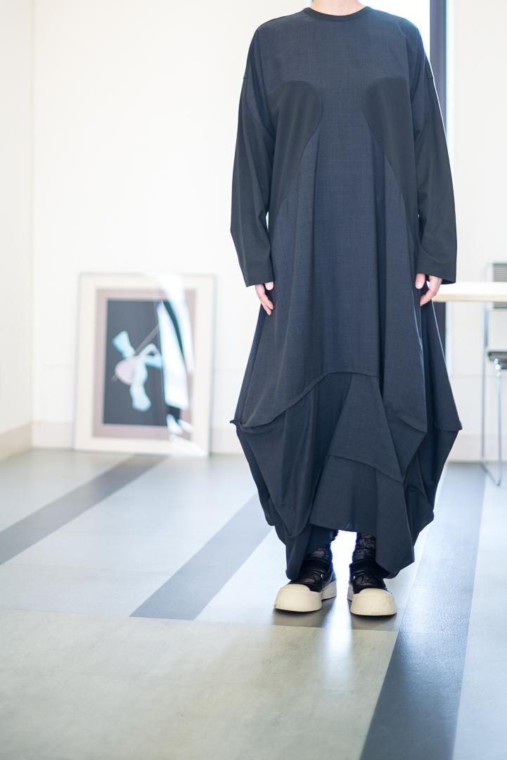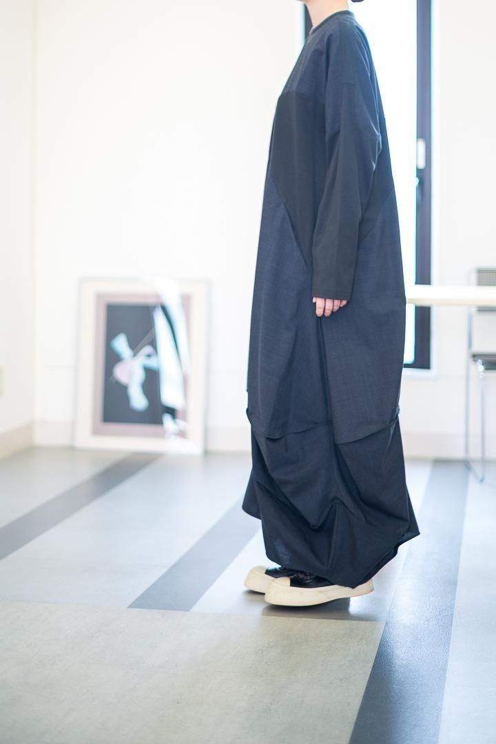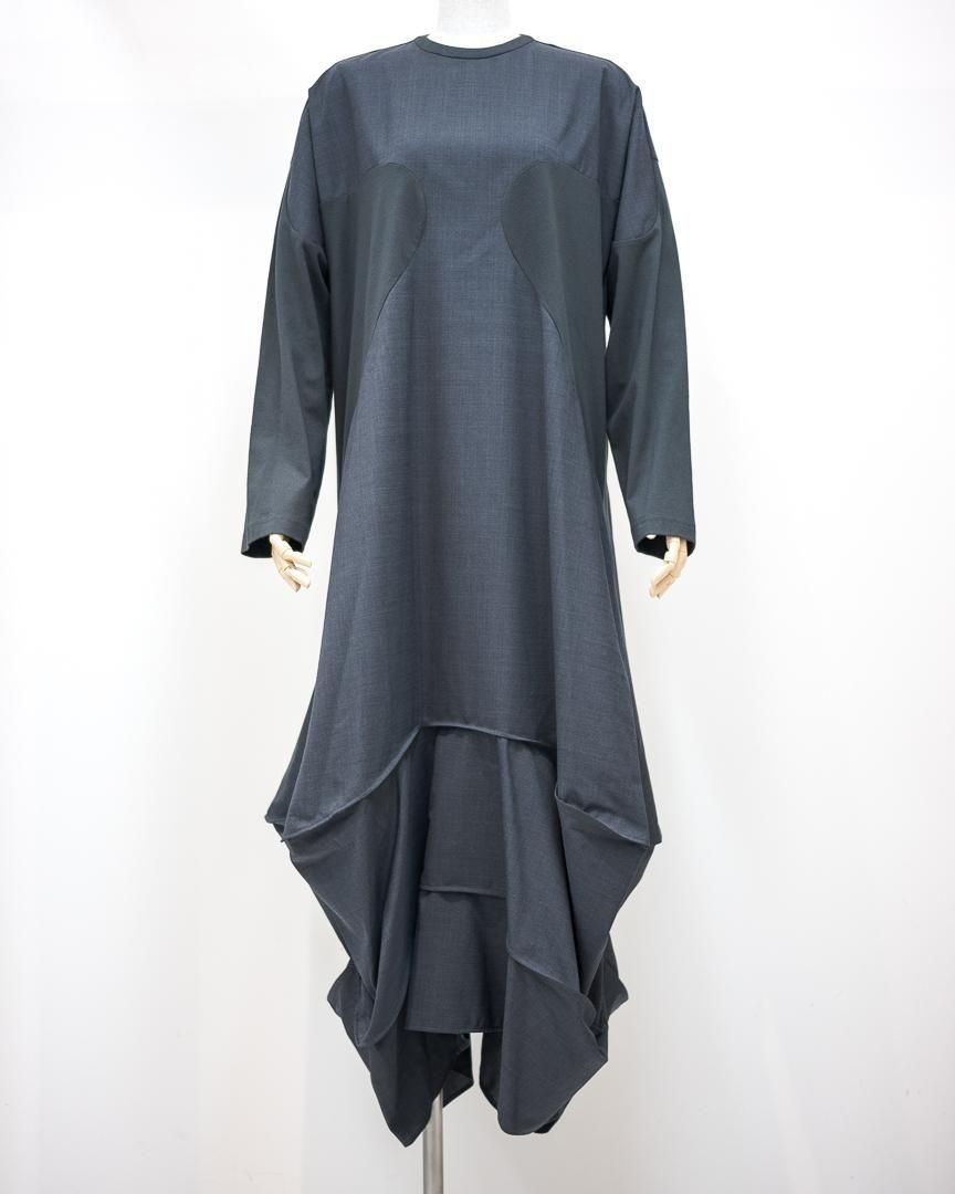 カーブラインが特徴的なシルエットドレスとカットソーをリメイクしたような不思議なドッキングデザインのアイテム。