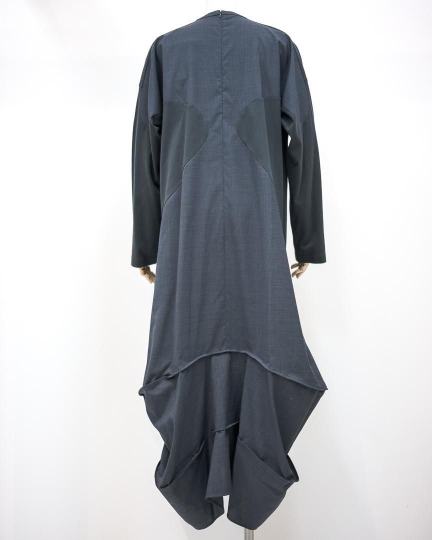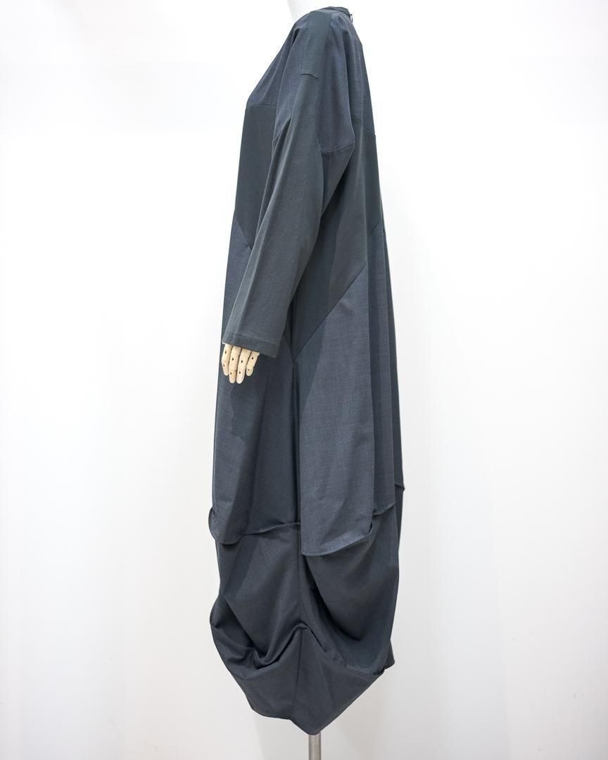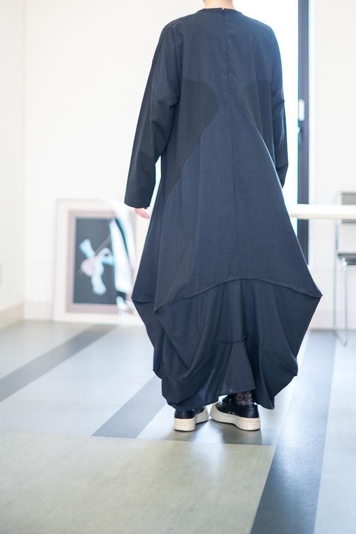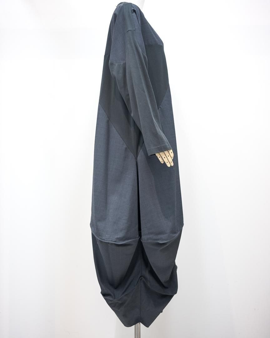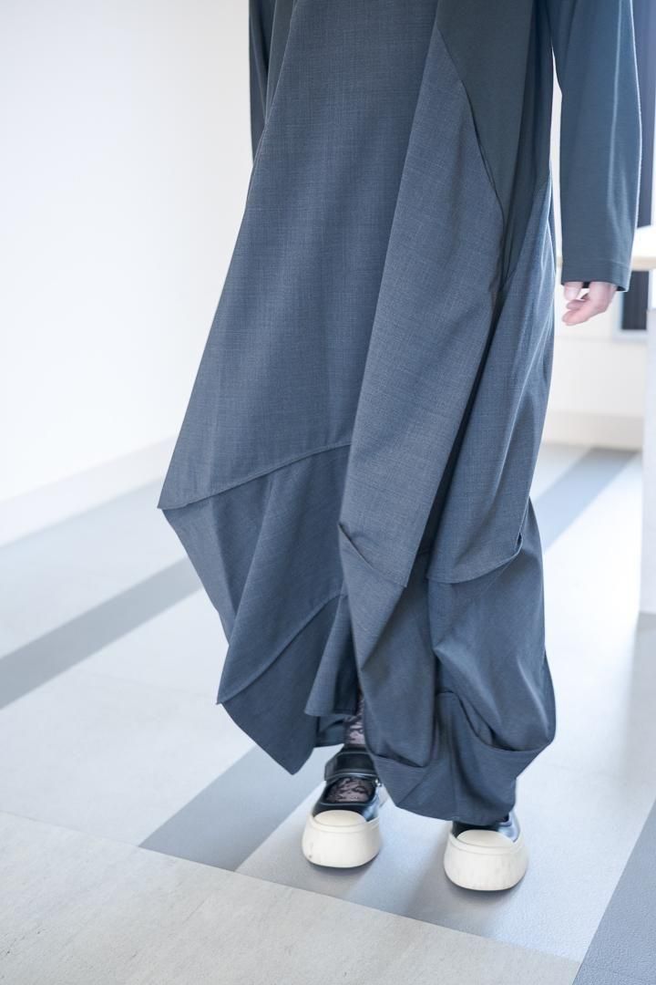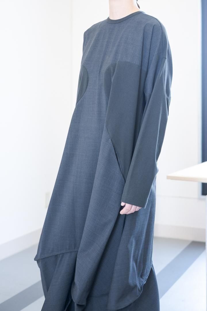 カーブラインが特徴的なシルエットドレスとカットソーをリメイクしたような不思議なドッキングデザインのアイテム。