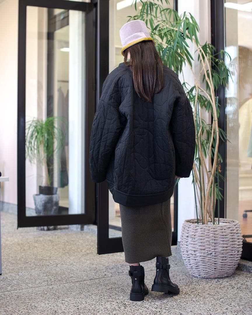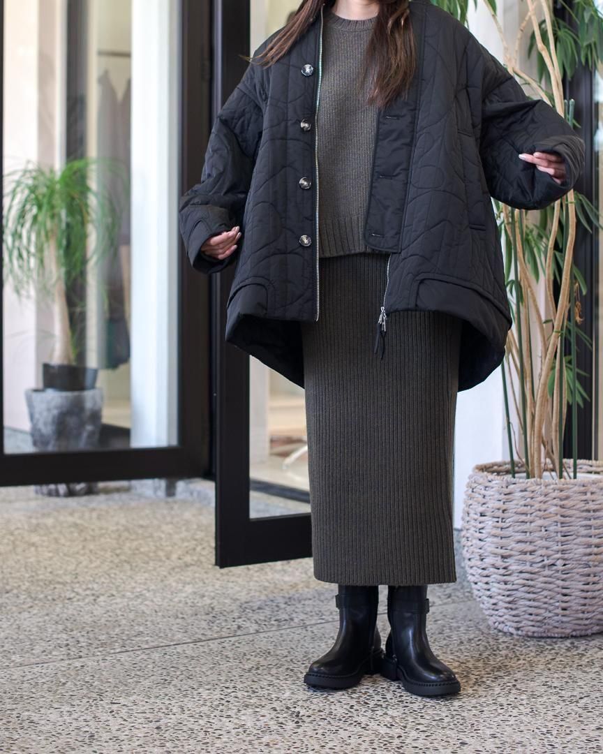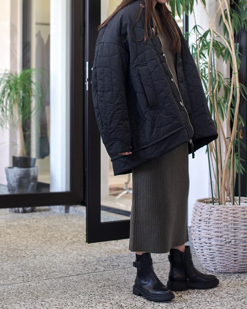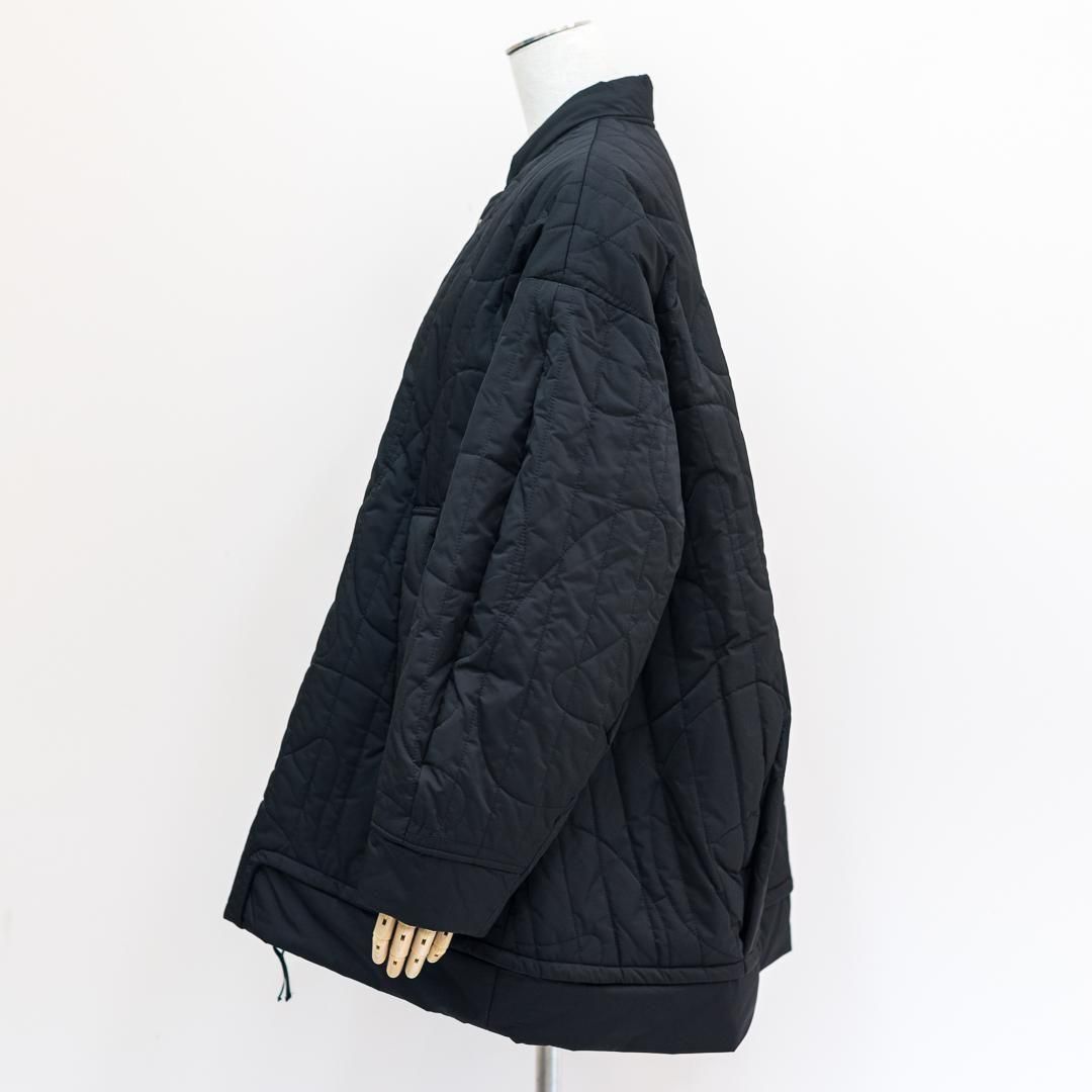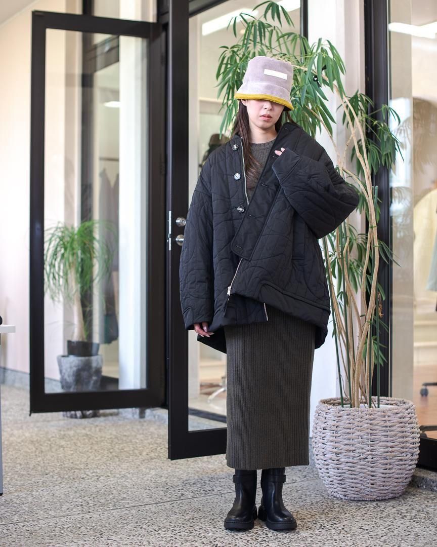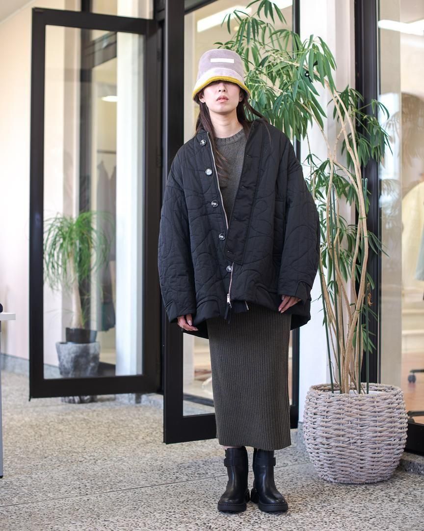 BIGシルエットのMA1を彷彿させるジャケットは、ミリタリーのアウターをベースに考えられているため、スタイリングしやすく着やすいアイテムです。今季のオリジナルキルティング柄は椅子のシルエットをモチーフにしたものです。(アルネ・ヤコブセン「eggチェア」)