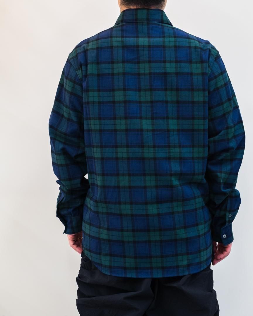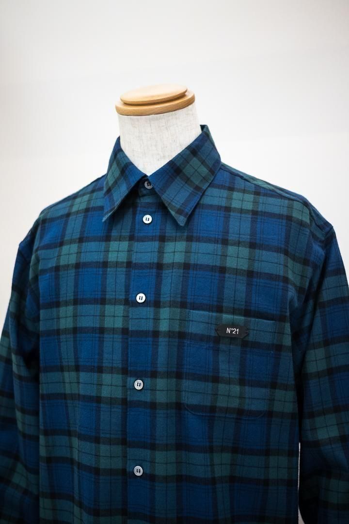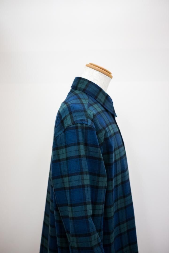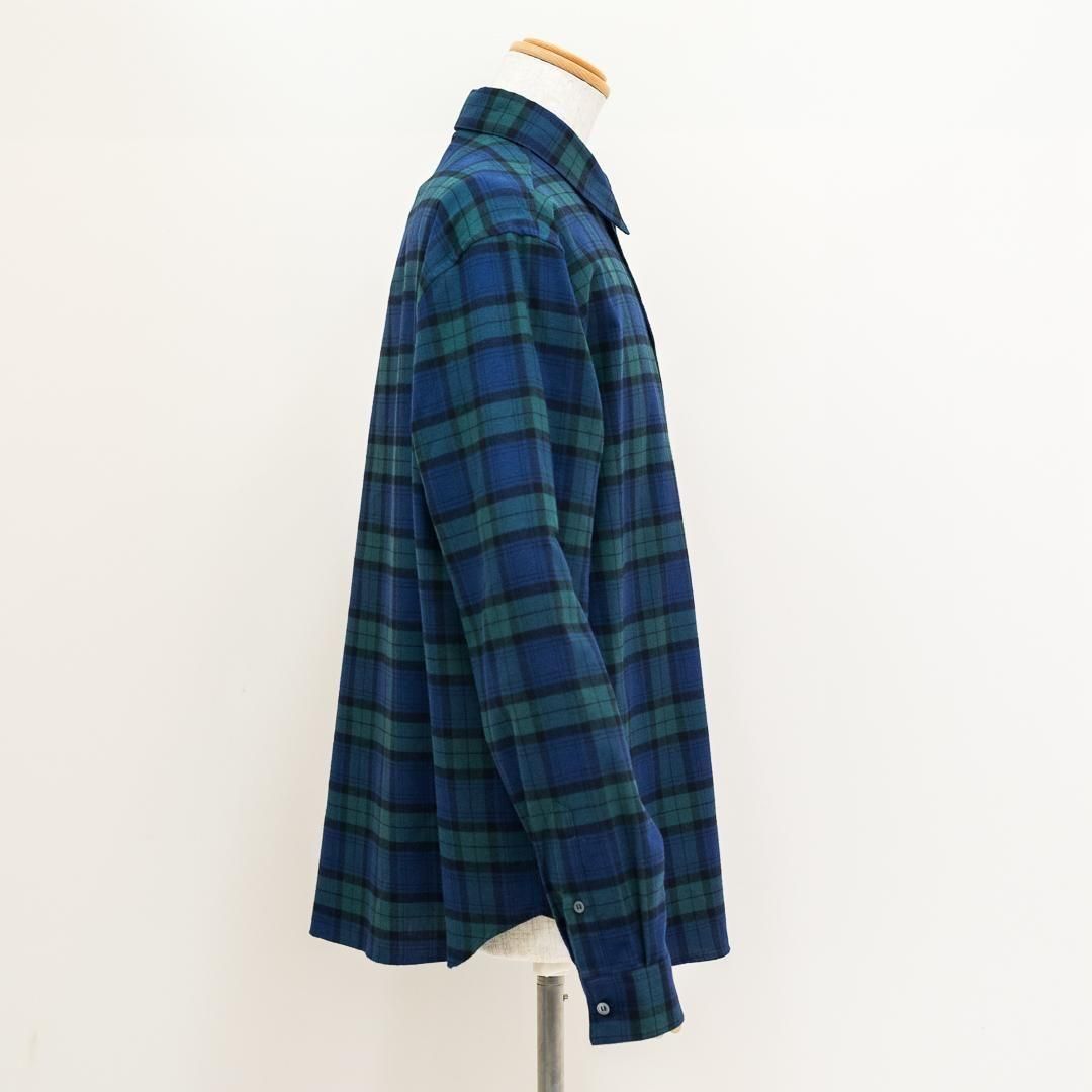 グリーン×ブルーのチェック柄の綿素材シャツ。