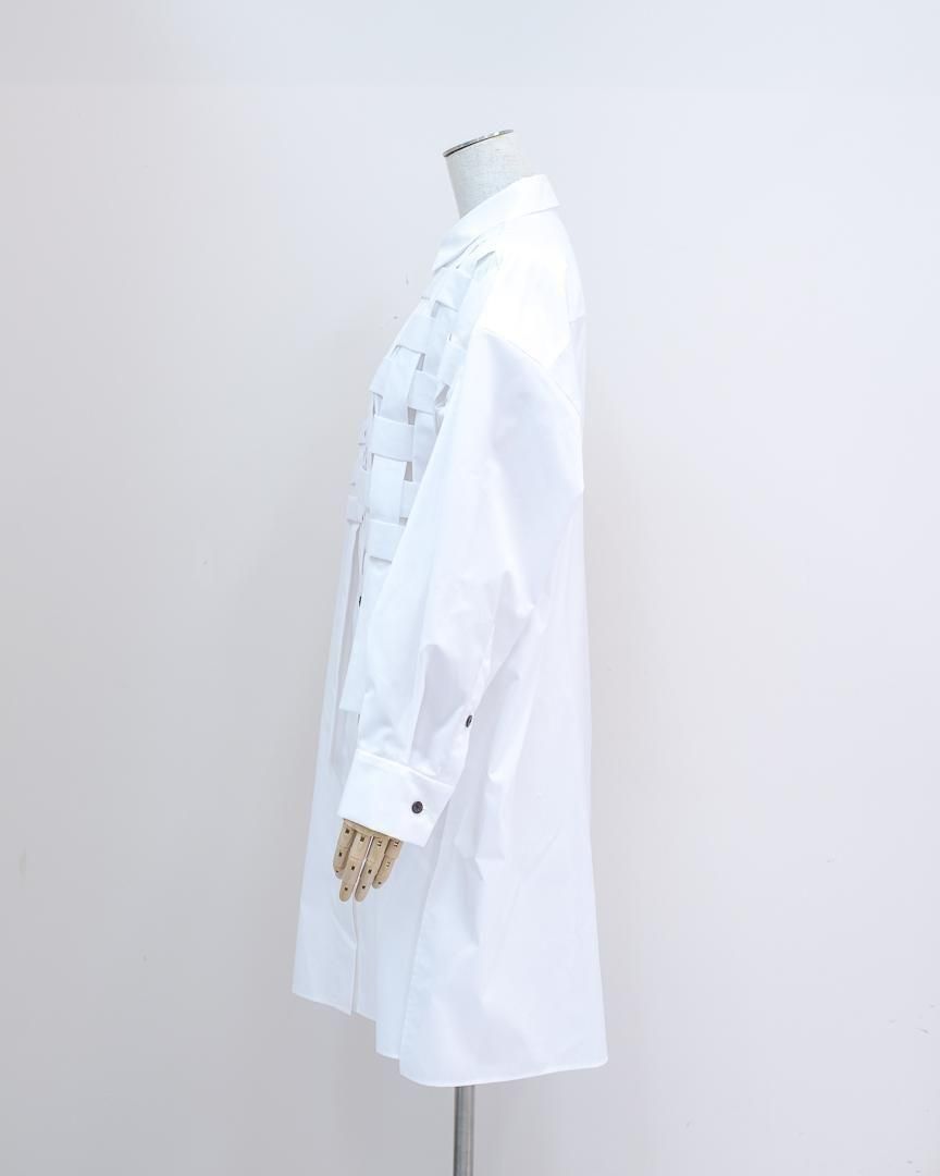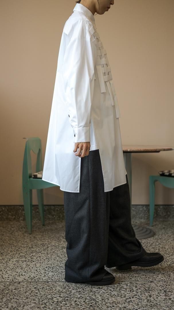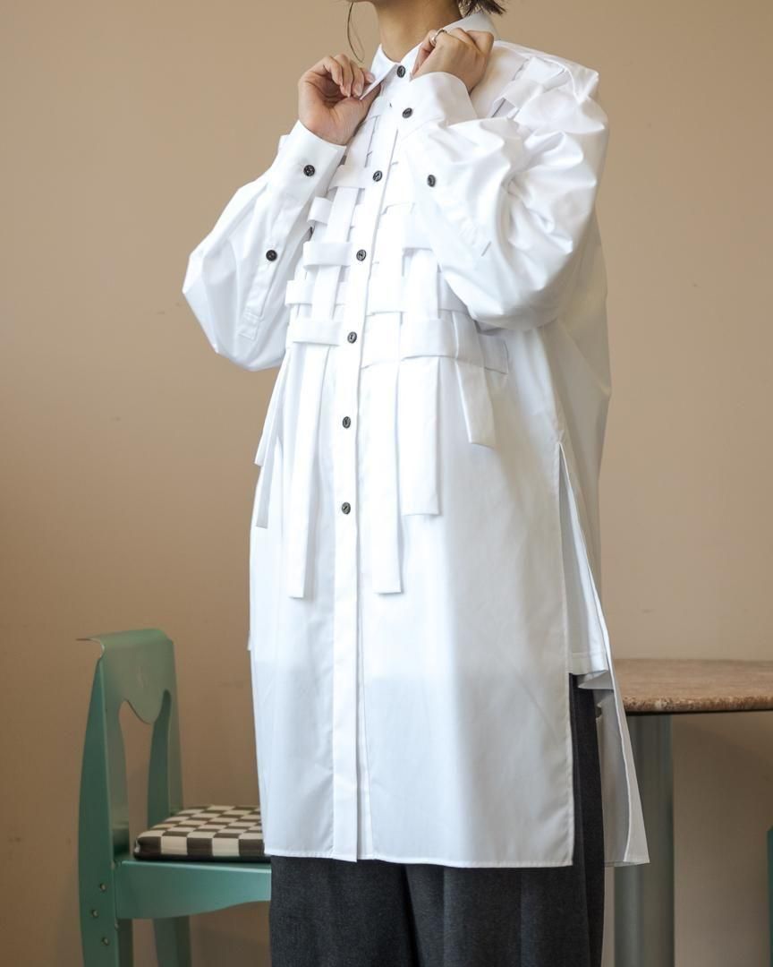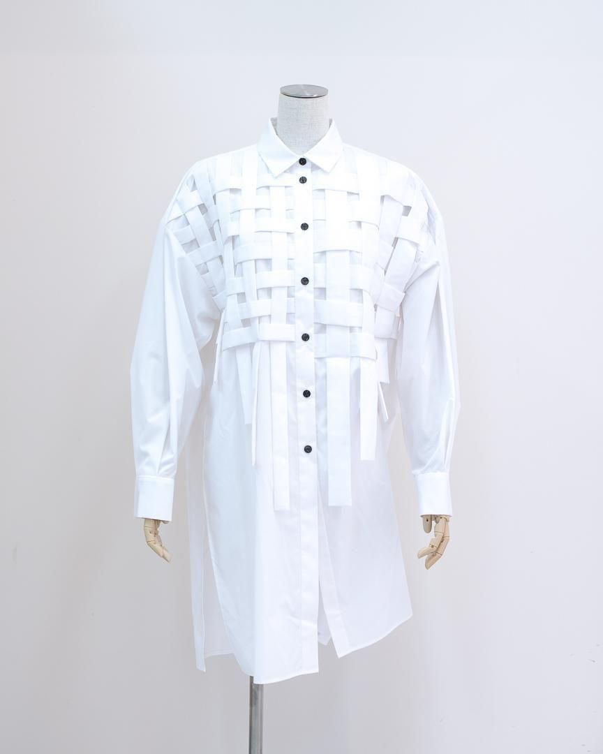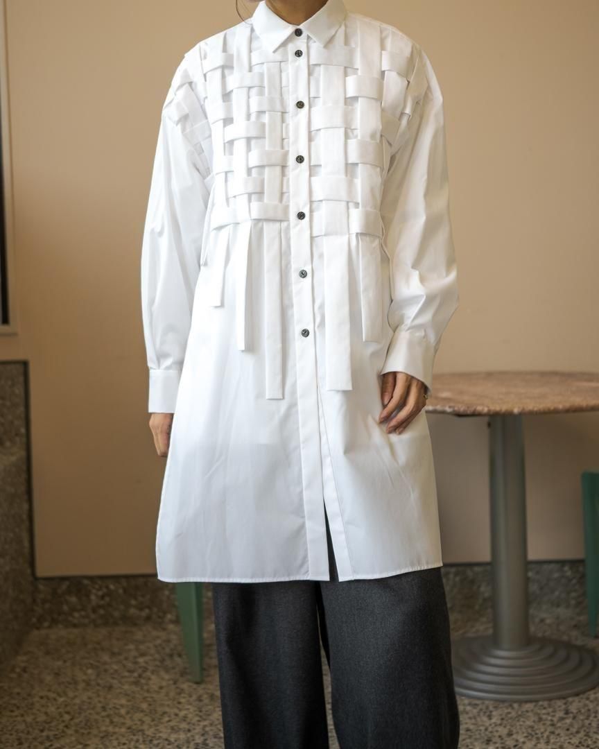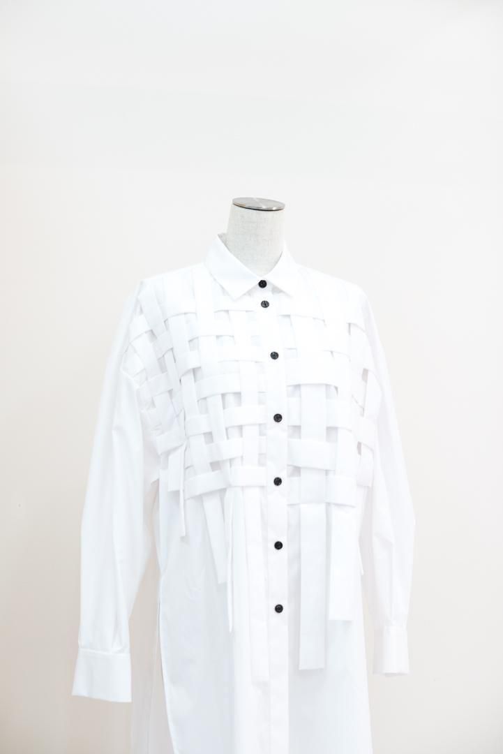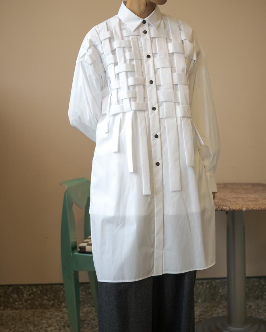 ラタンチェアの編み込んだデザインを発想源にしたロングシャツ。