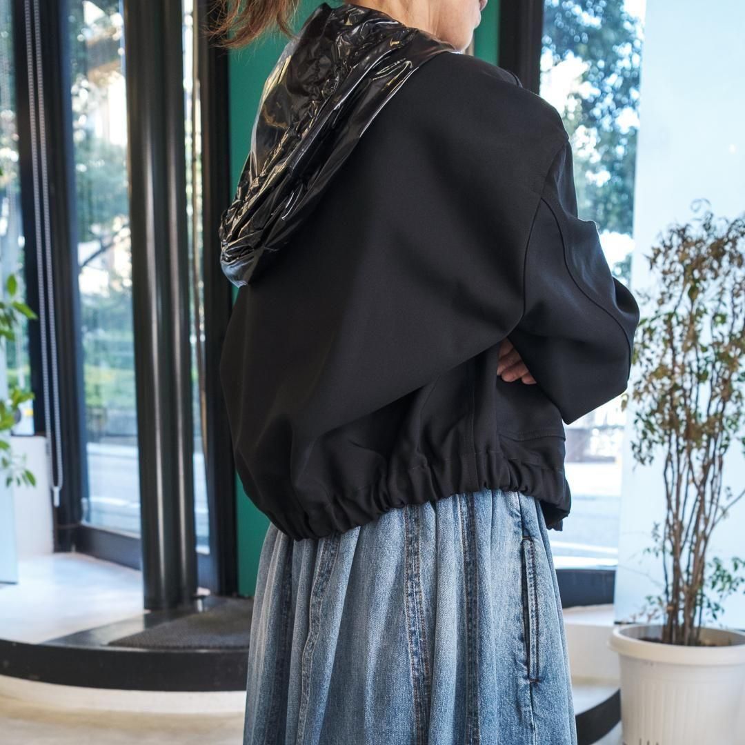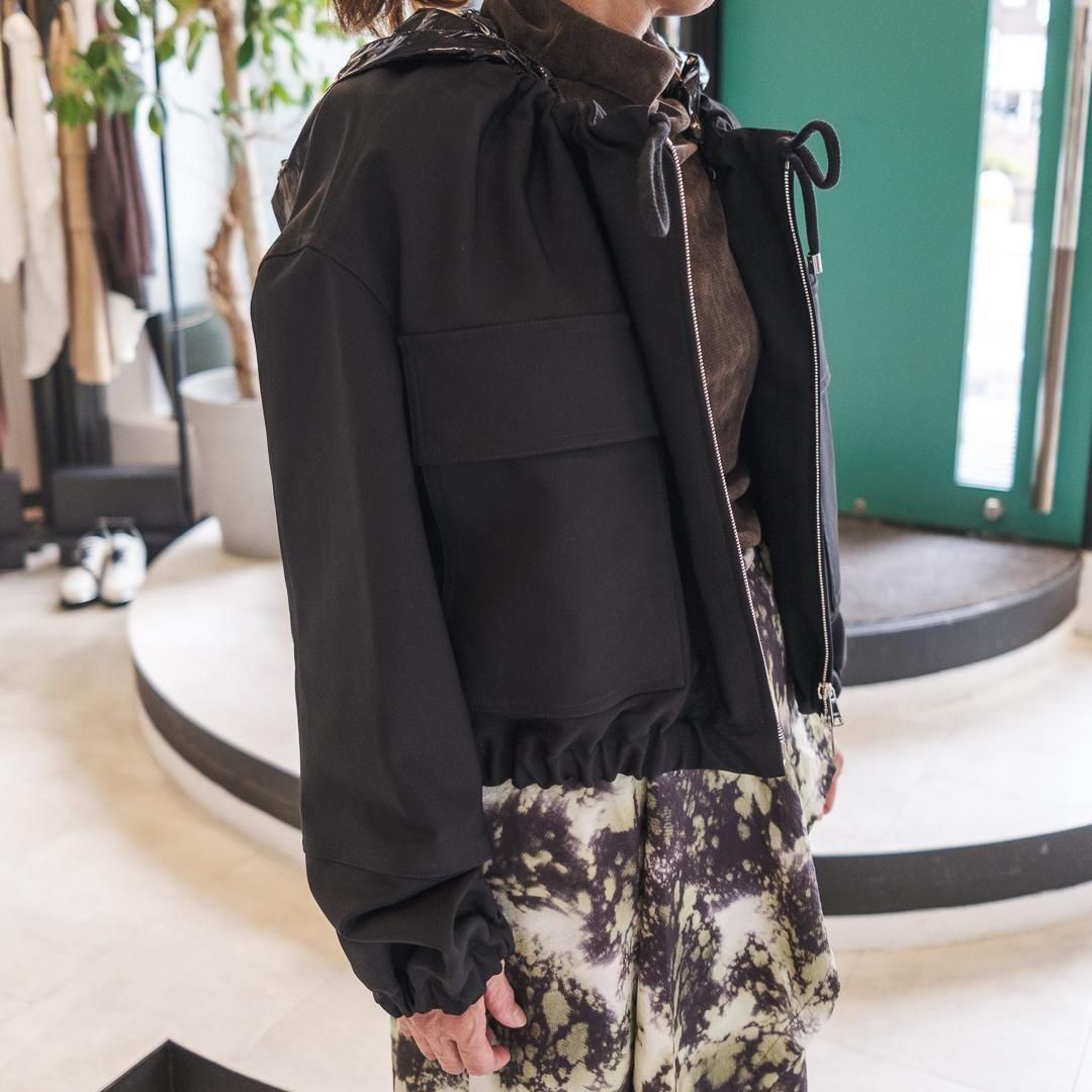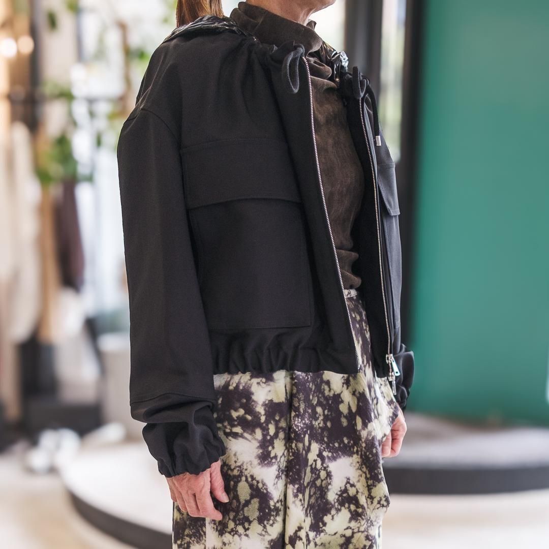 【ポイント】スナップボタン付き取り外し可能なショート丈ブルゾン。スキューバ素材と比較してしっかりめの素材で重厚感があります。
