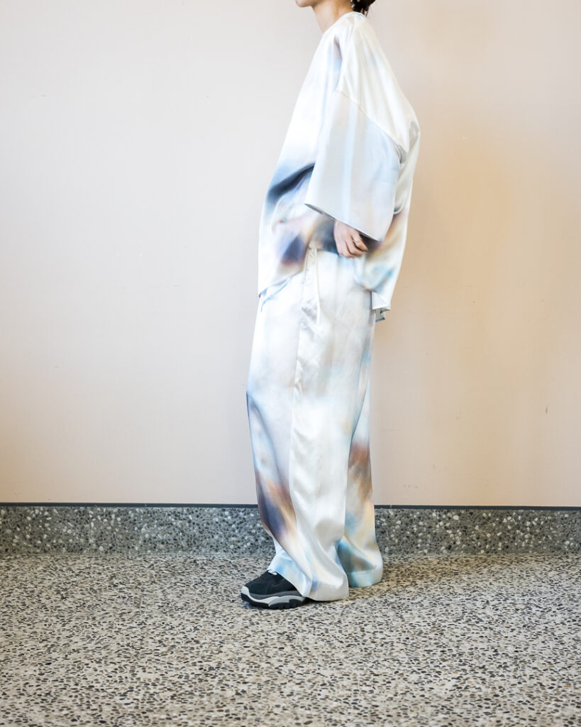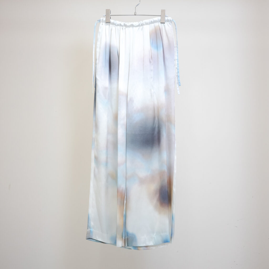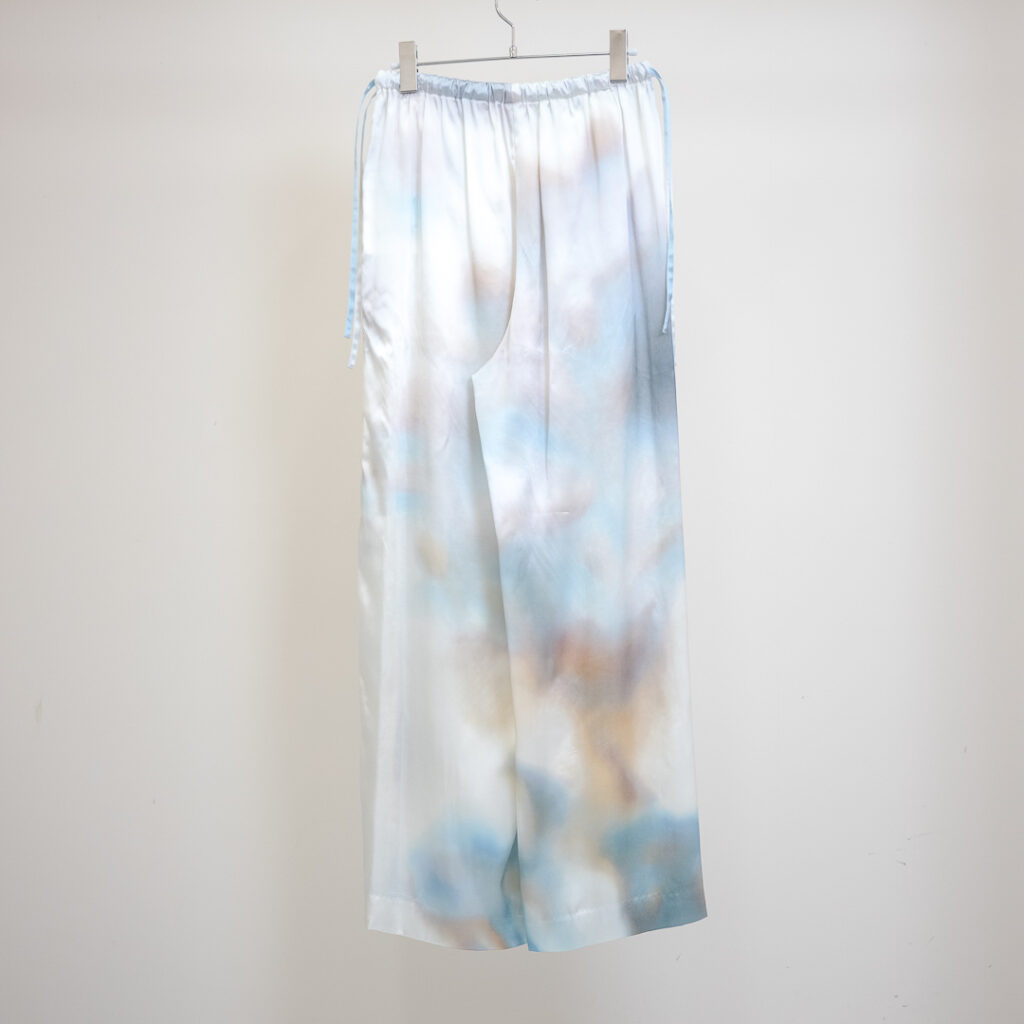 丸山さやか氏とのコラボレーション柄を大胆にプリントした、巾着のようなダブルストラップデザインで合わせやすいが少し新鮮に見えるフレッシュなディティールがポイントのパンツ。