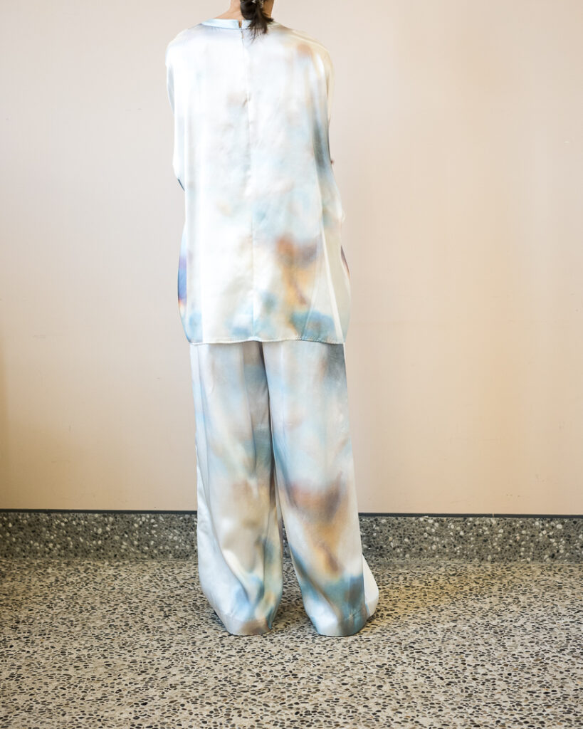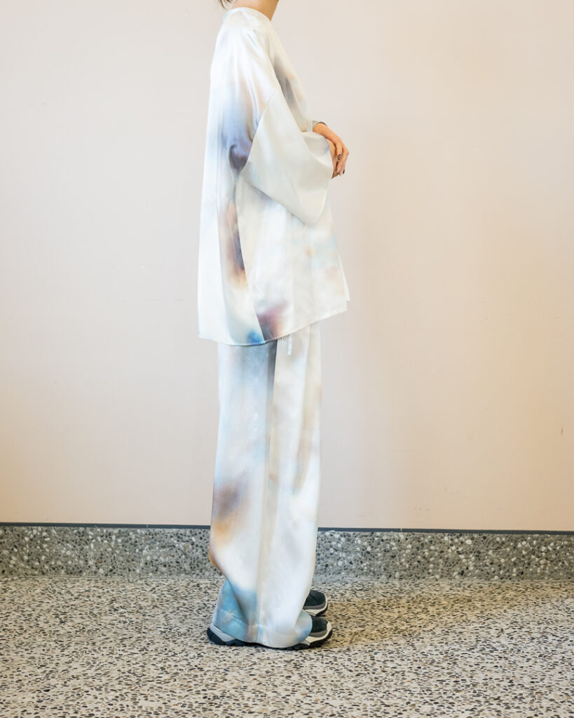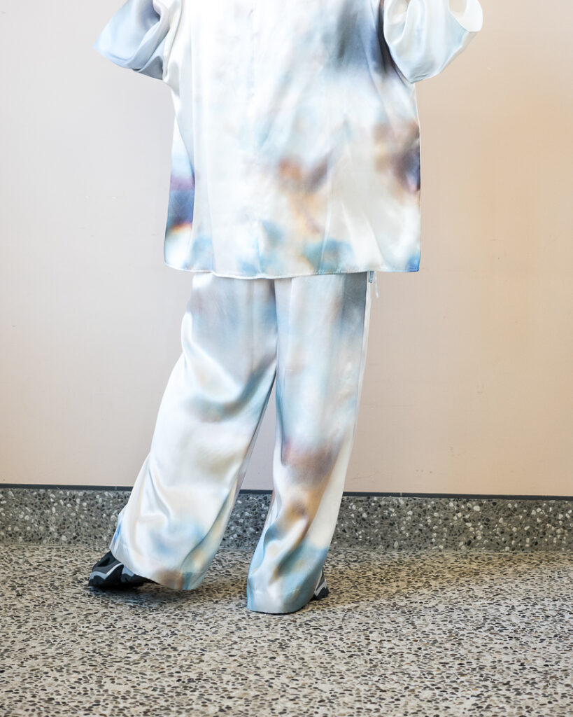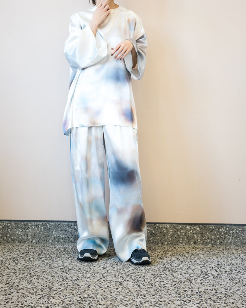 丸山さやか氏とのコラボレーション柄を大胆にプリントした、巾着のようなダブルストラップデザインで合わせやすいが少し新鮮に見えるフレッシュなディティールがポイントのパンツ。