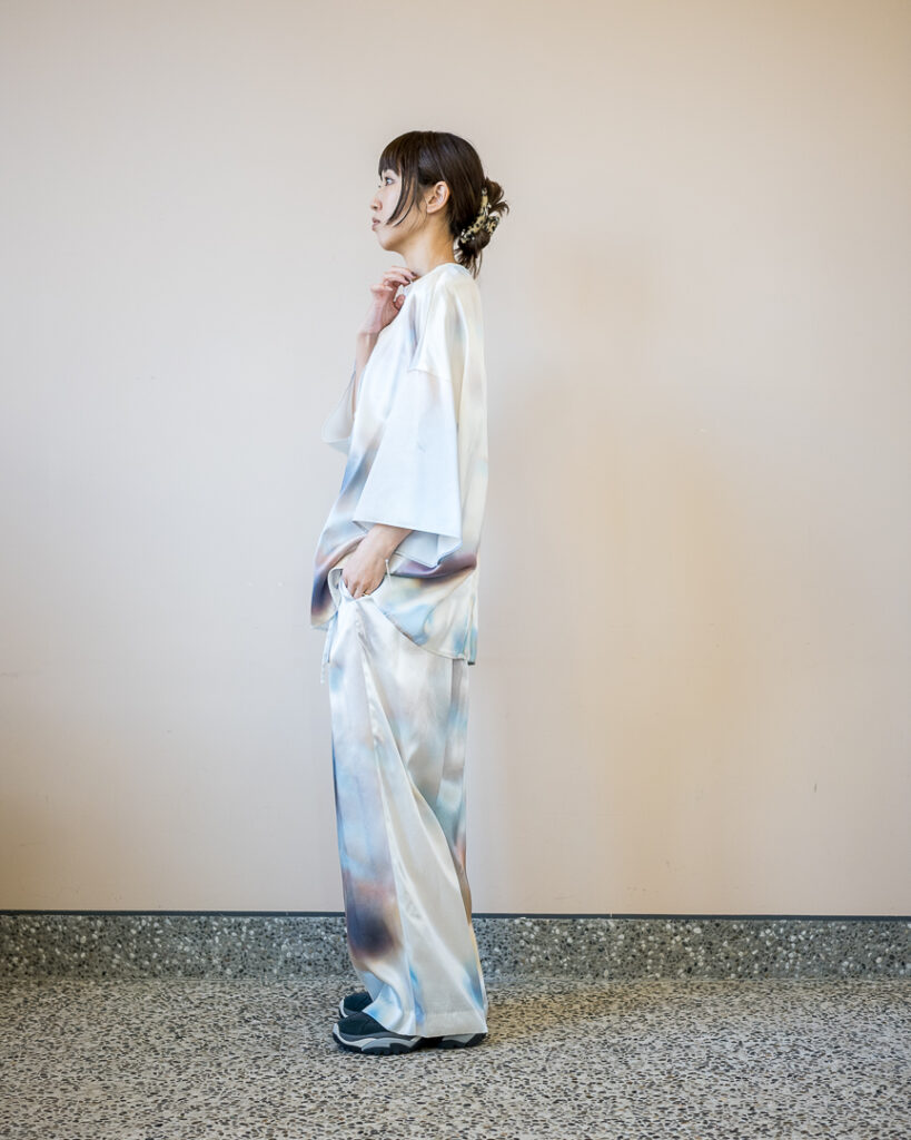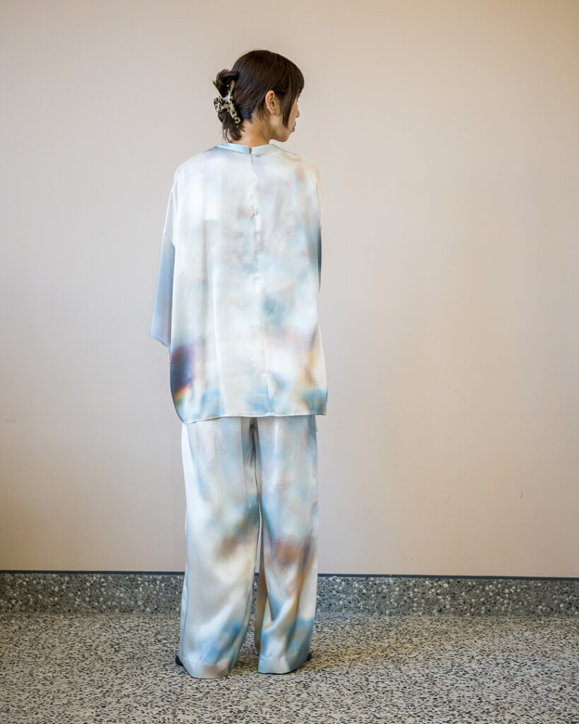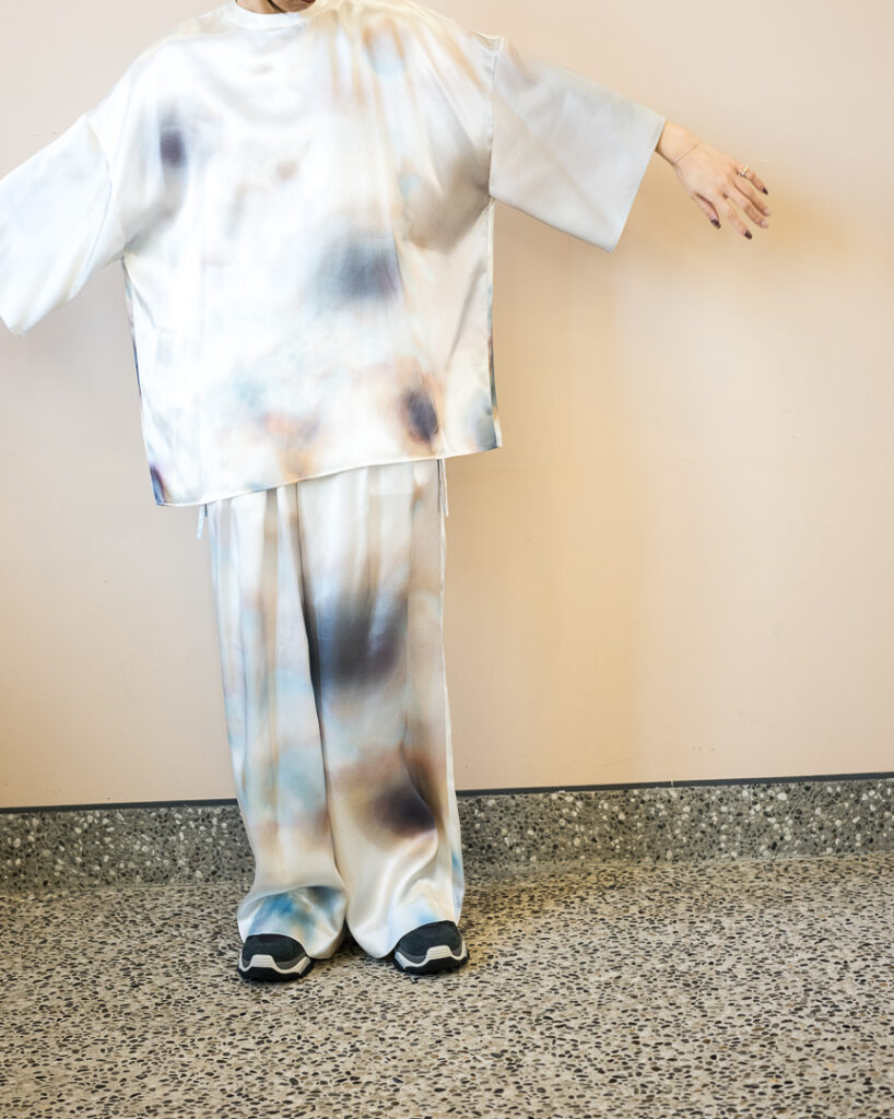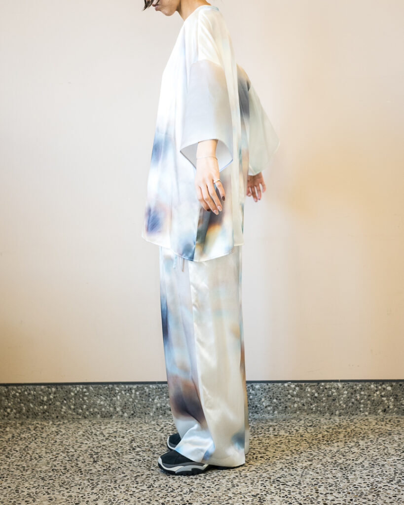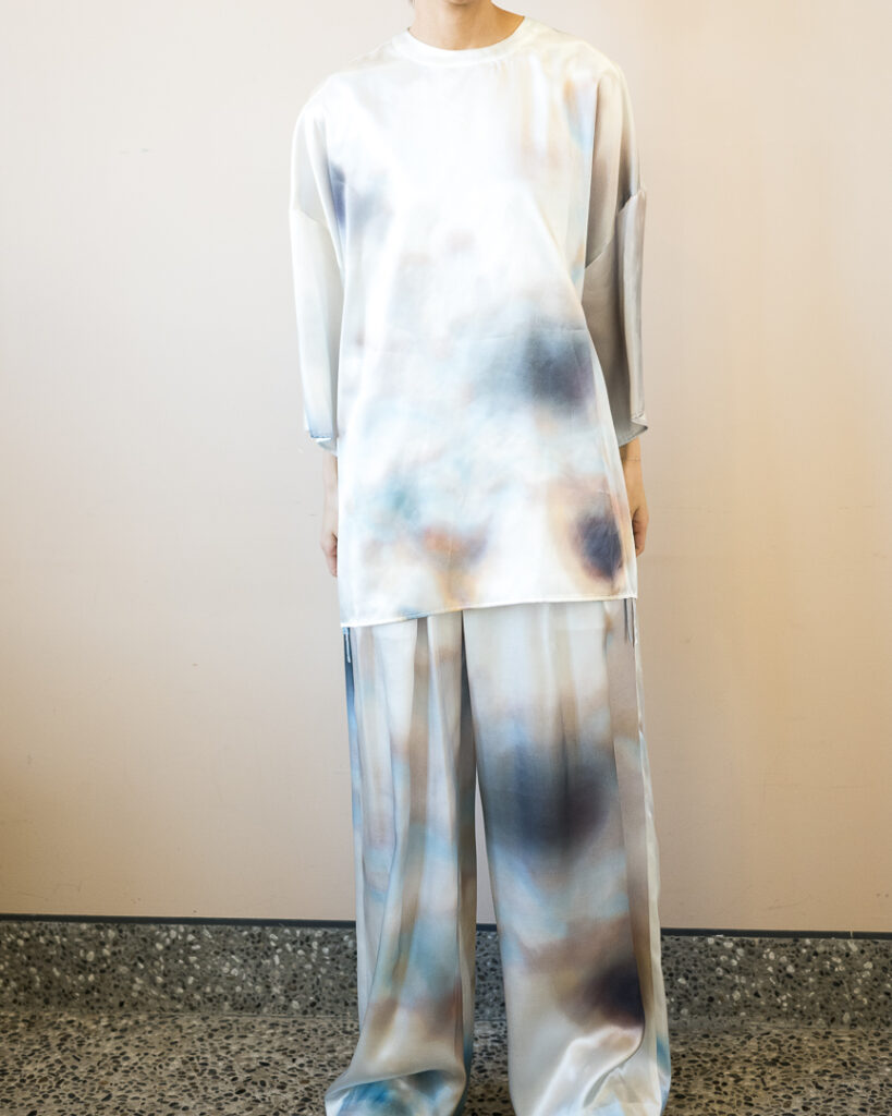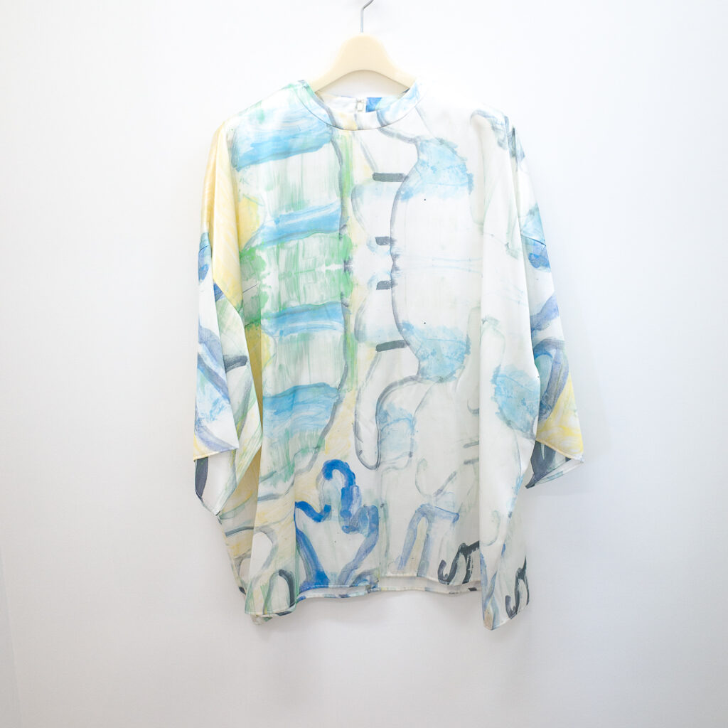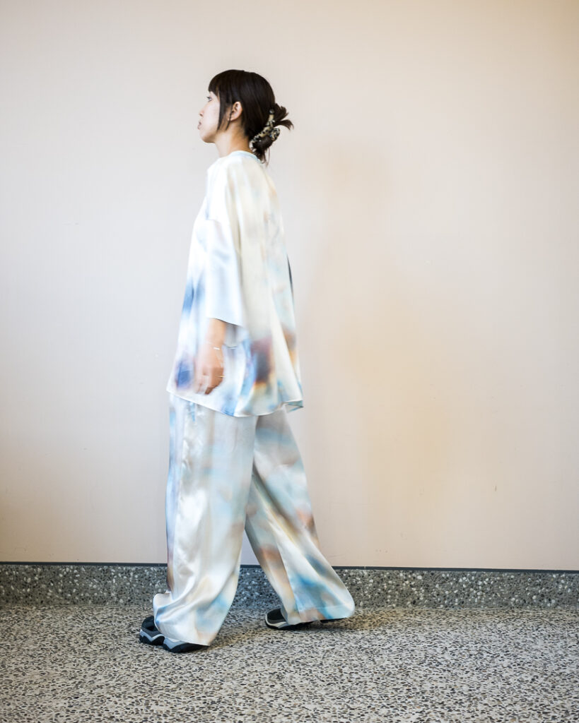 丸山さやか氏とのコラボレーション柄を大胆にプリントした、巨大なモンスター用の着用をイメージしたBIGシルエットのサテンTシャツ。
