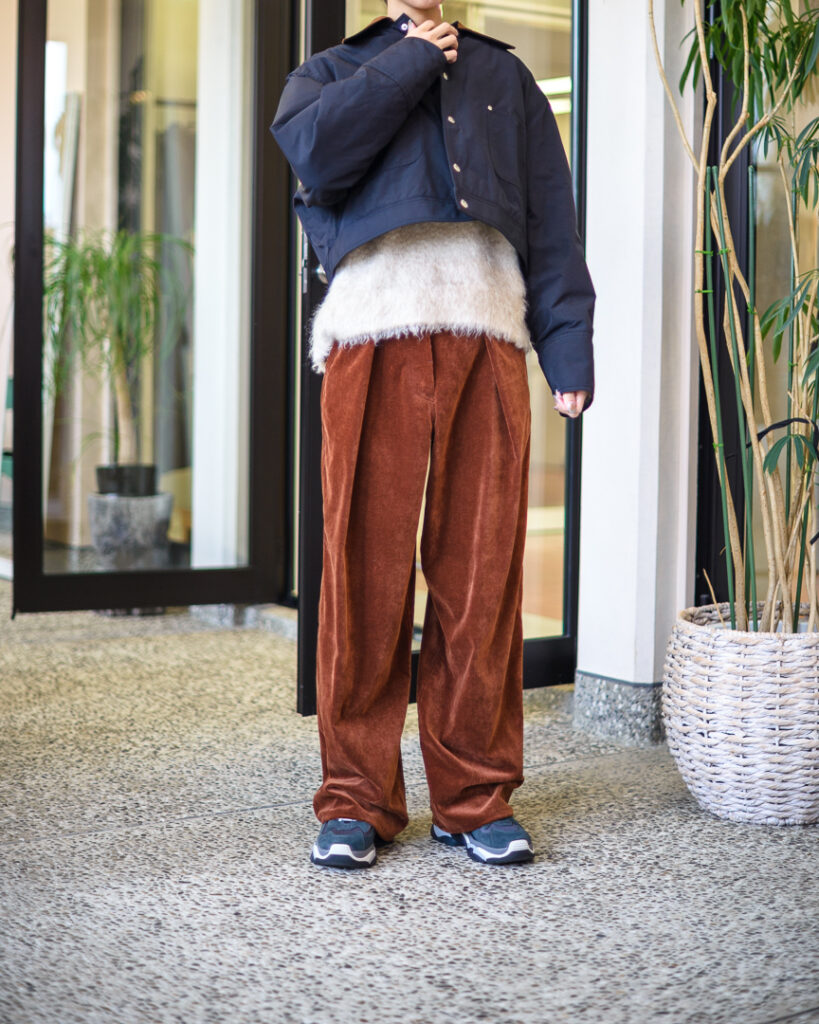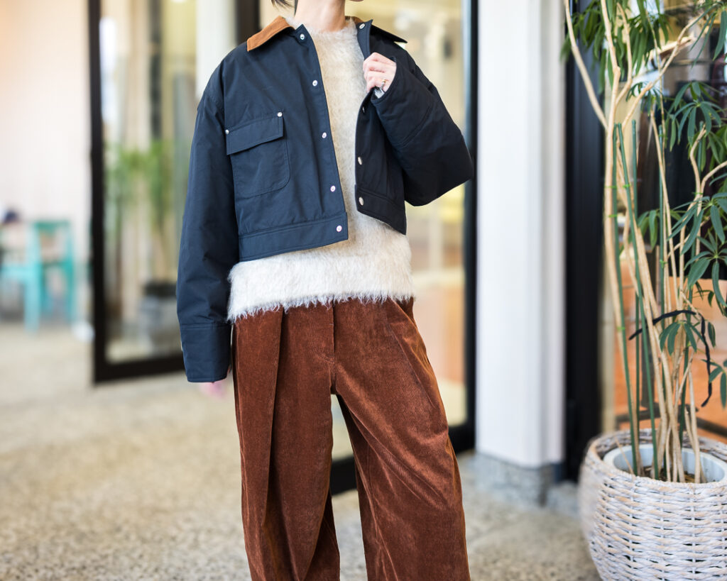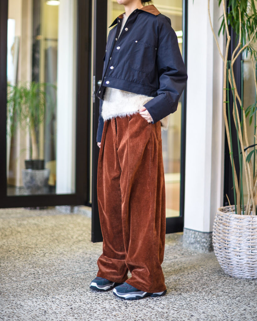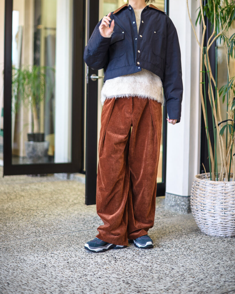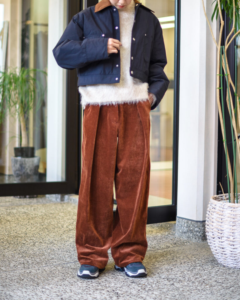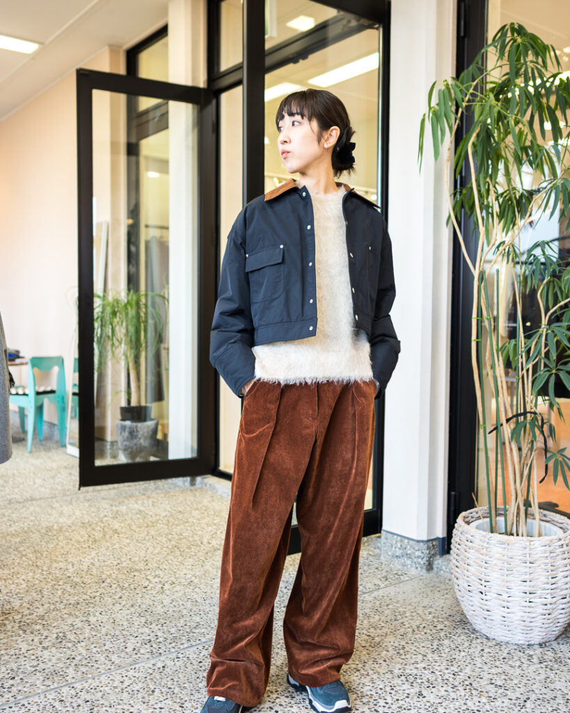 Material … 表地:ポリエステル44% 綿32% レーヨン22% ポリウレタン2%