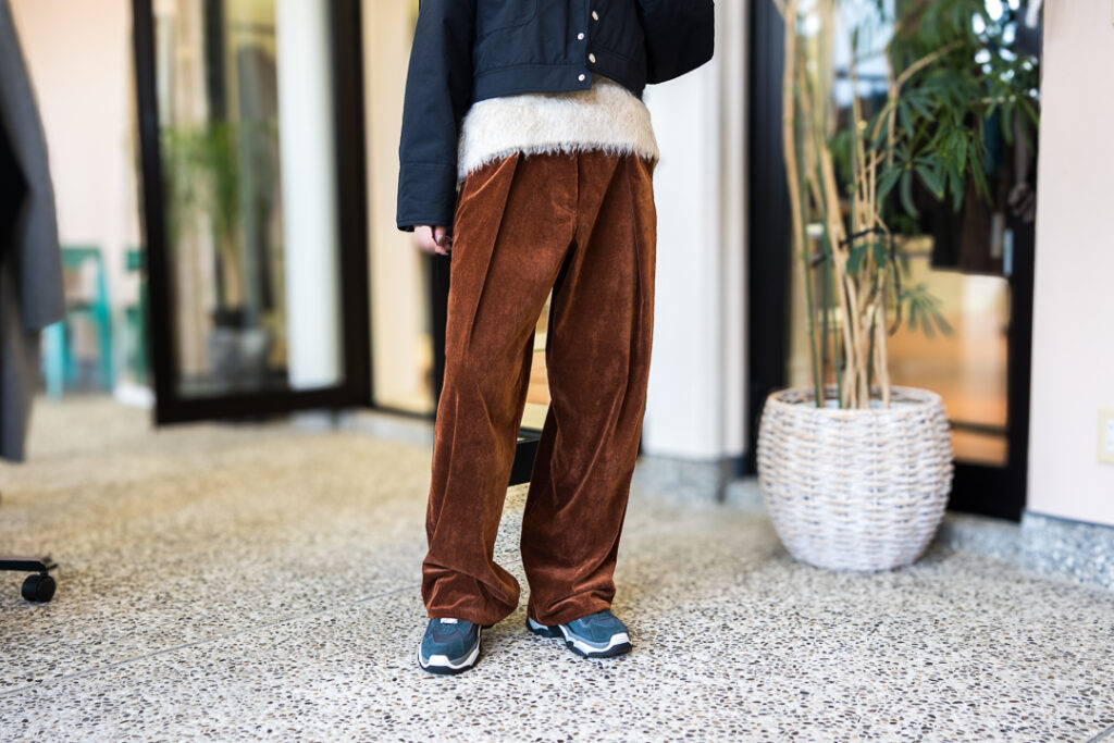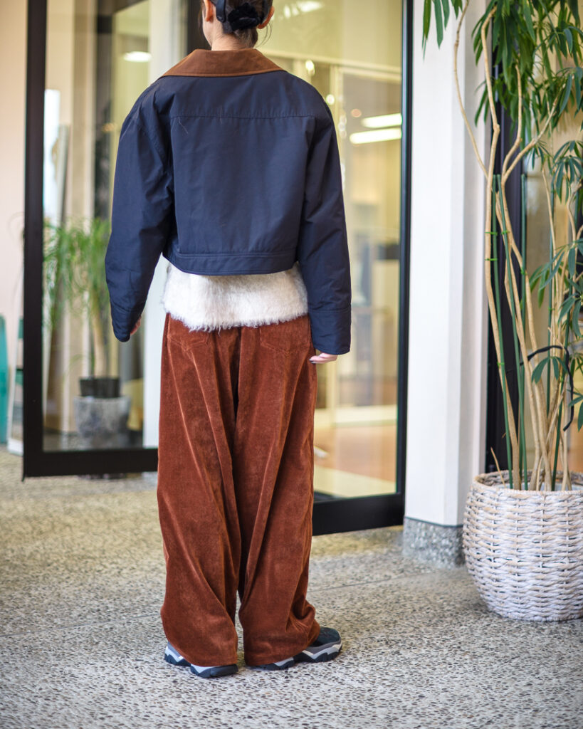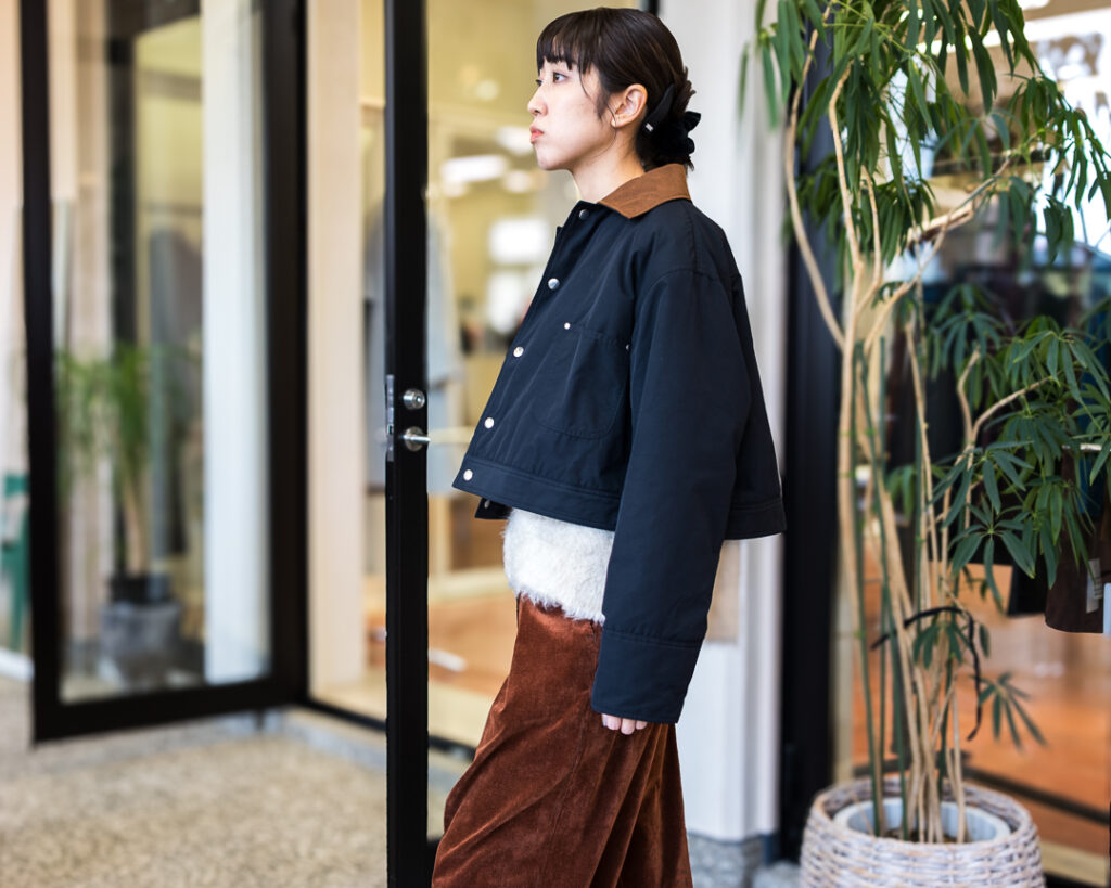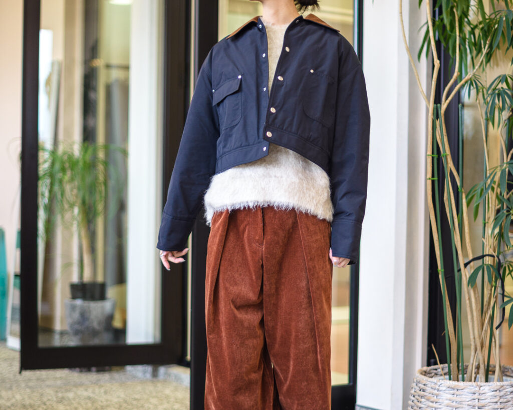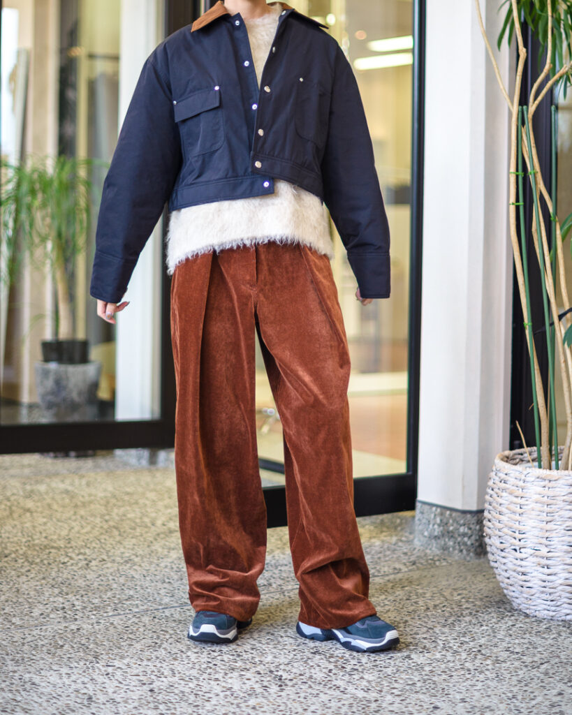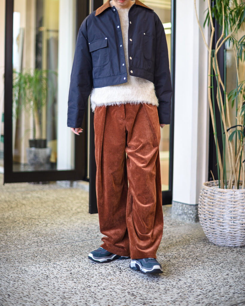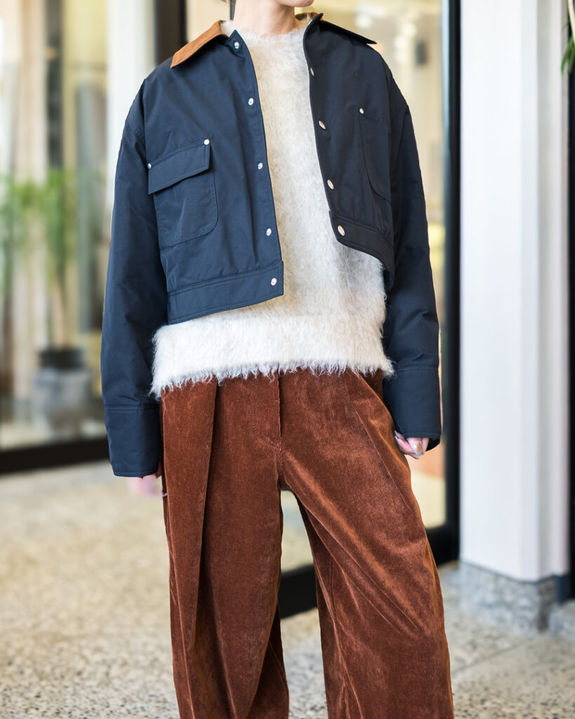 Material … 表地:ポリエステル44% 綿32% レーヨン22% ポリウレタン2%