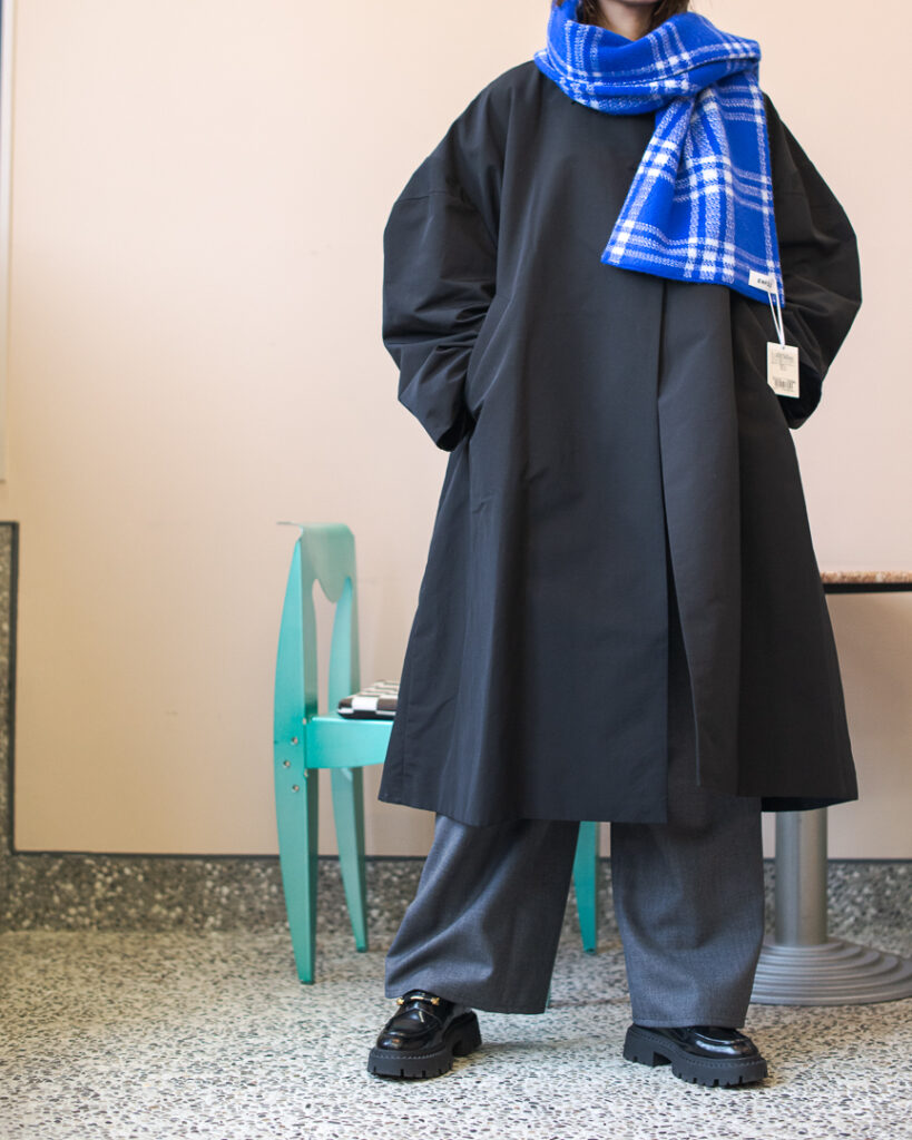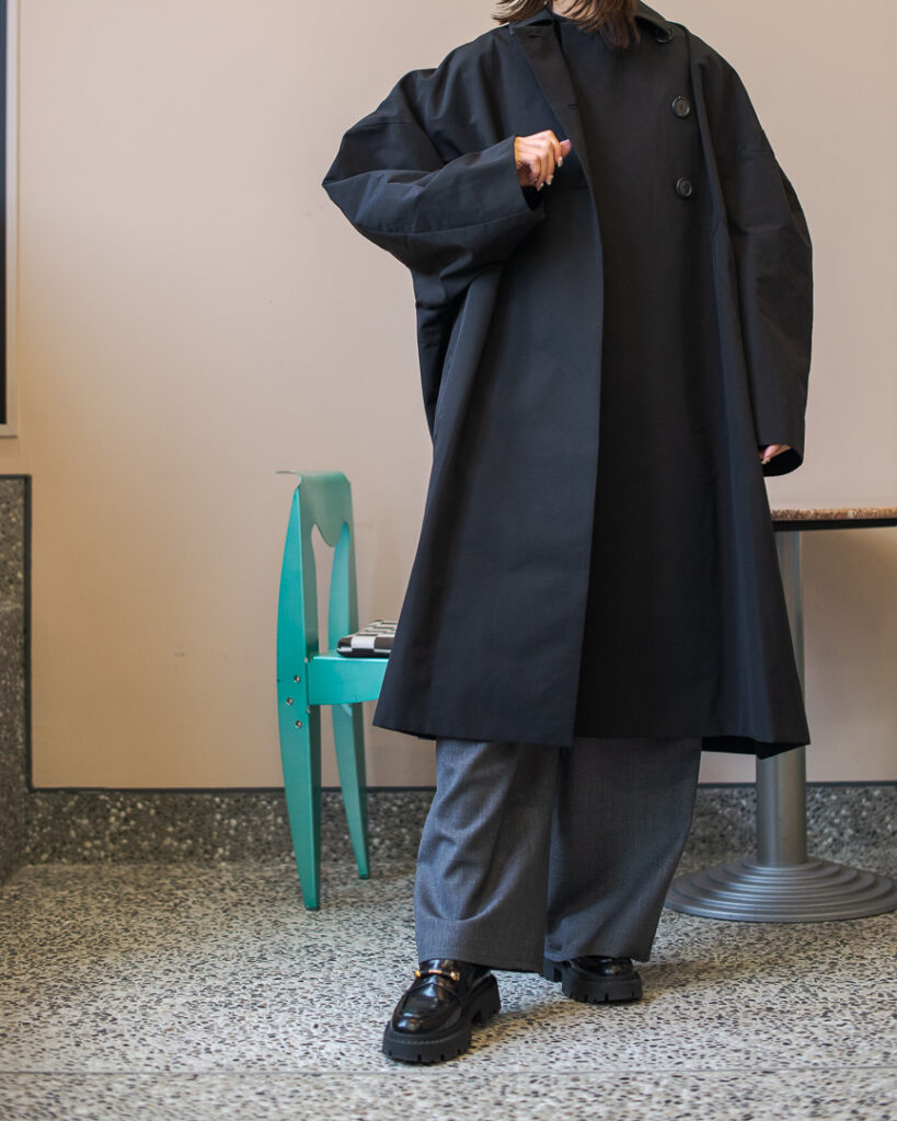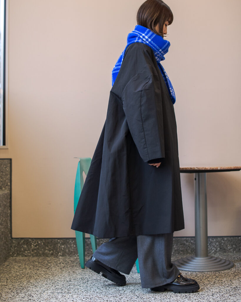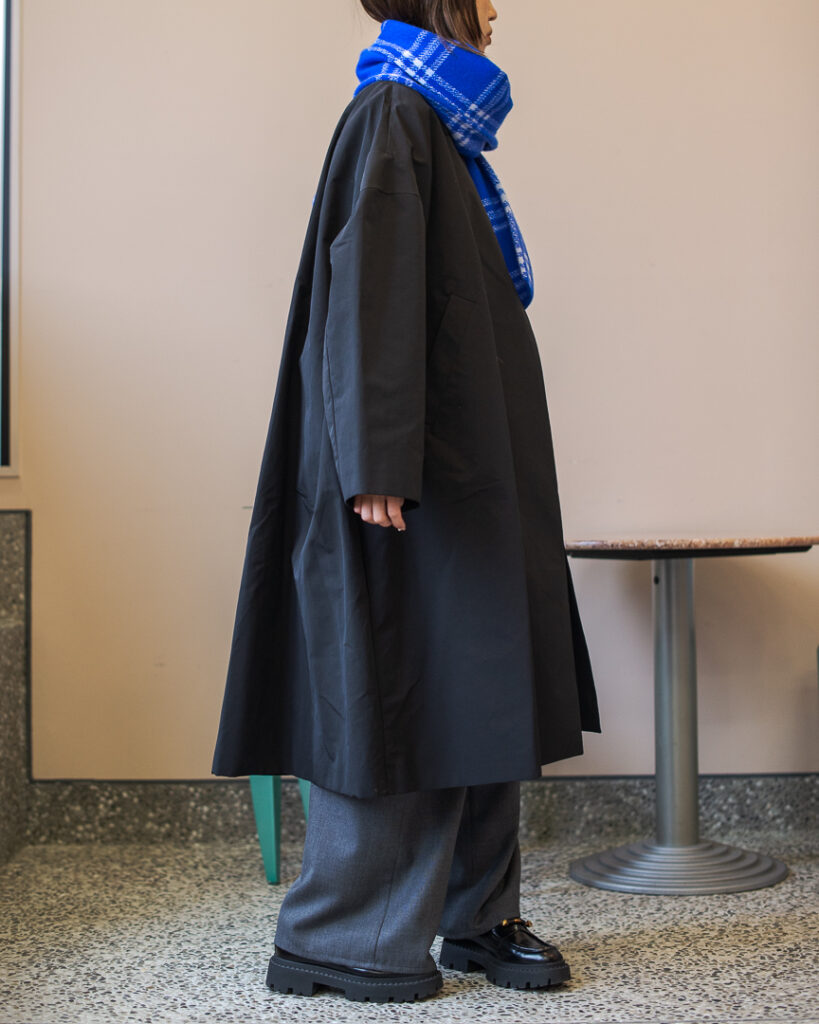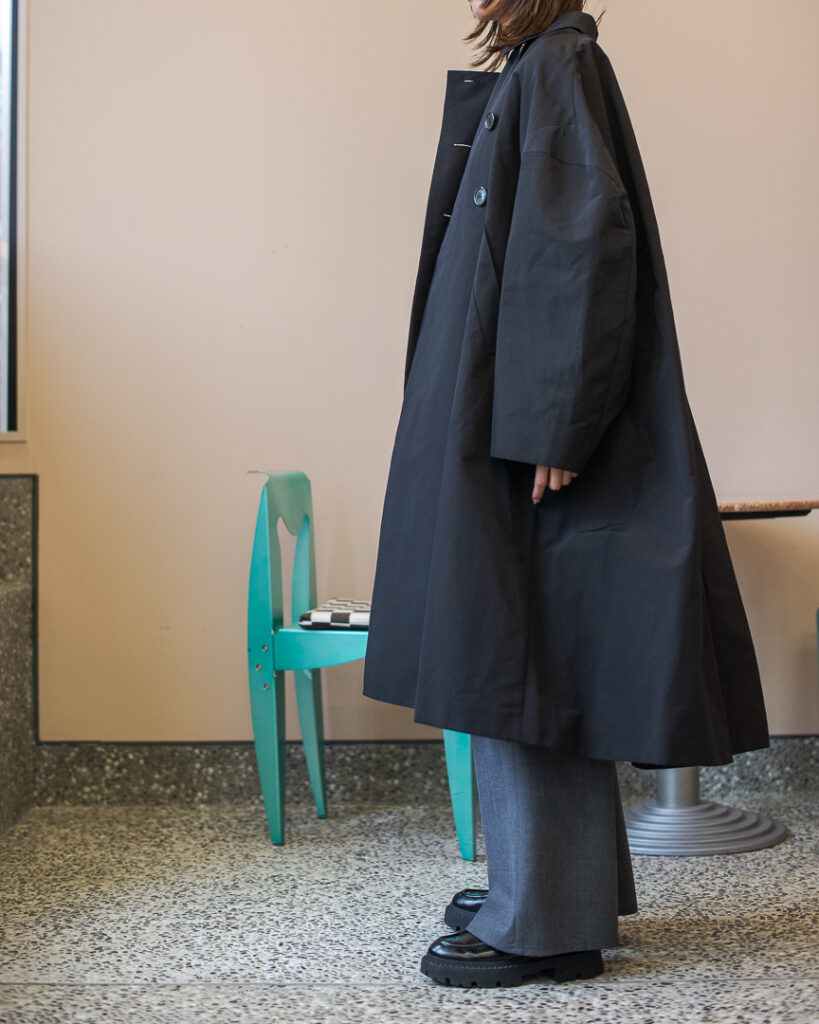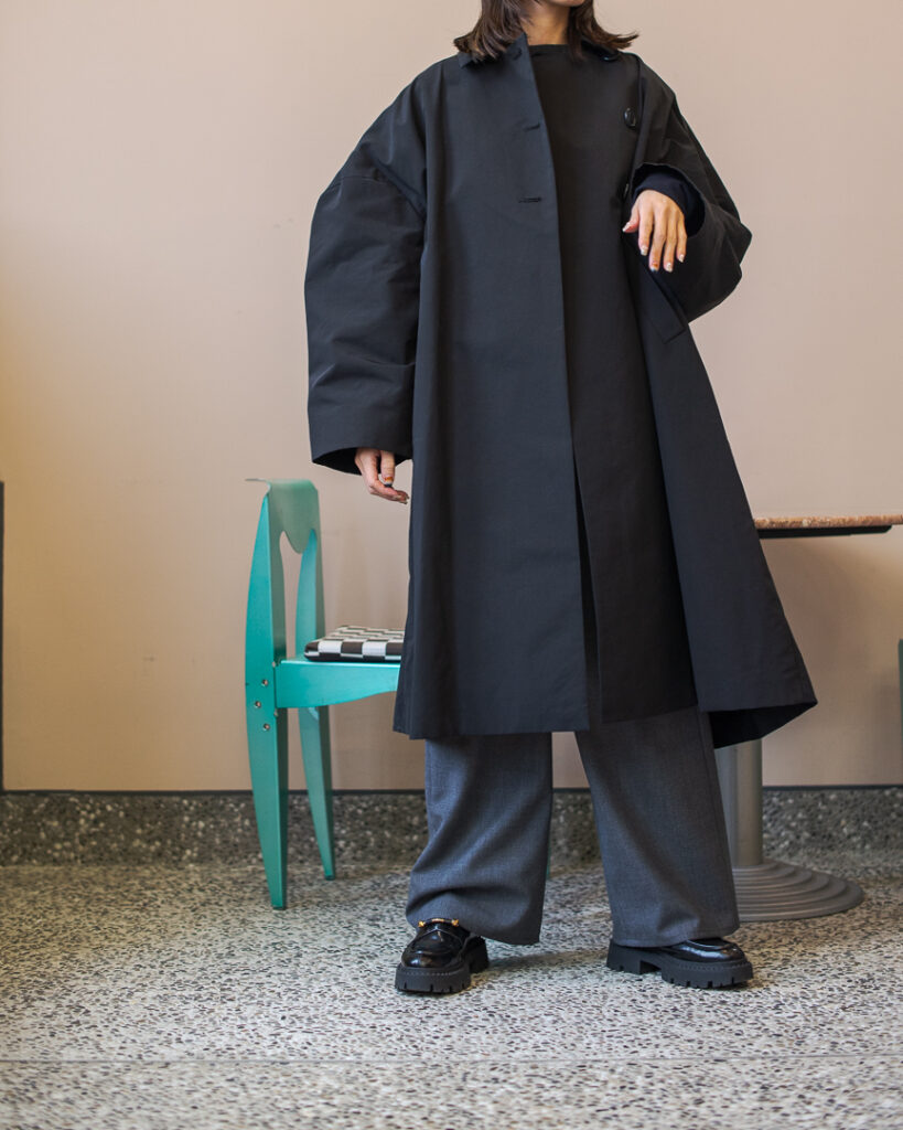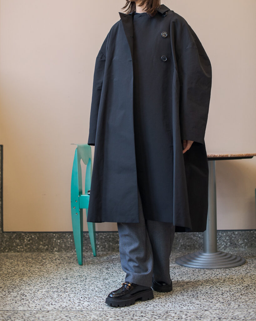 ボリュームのあるフレアシルエットの春先まで長くお召しいただける生地のステンカラーコート。