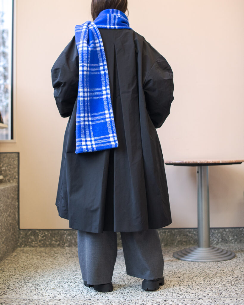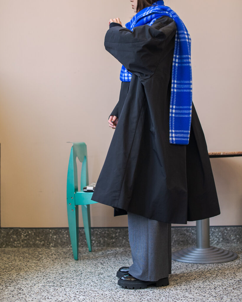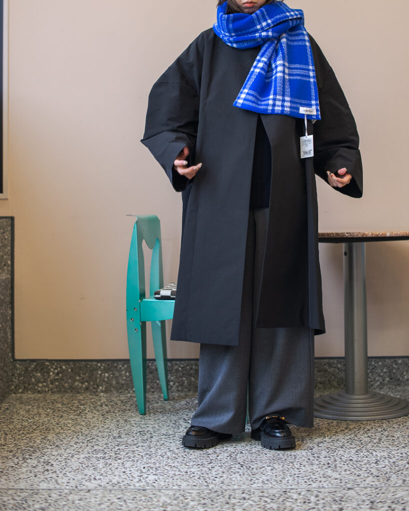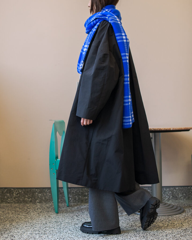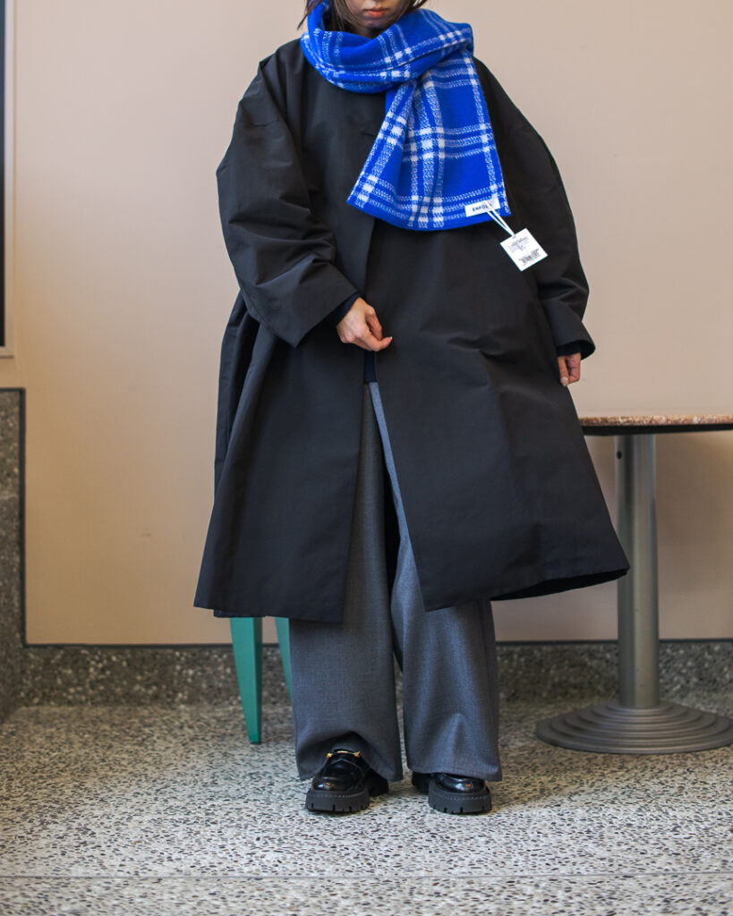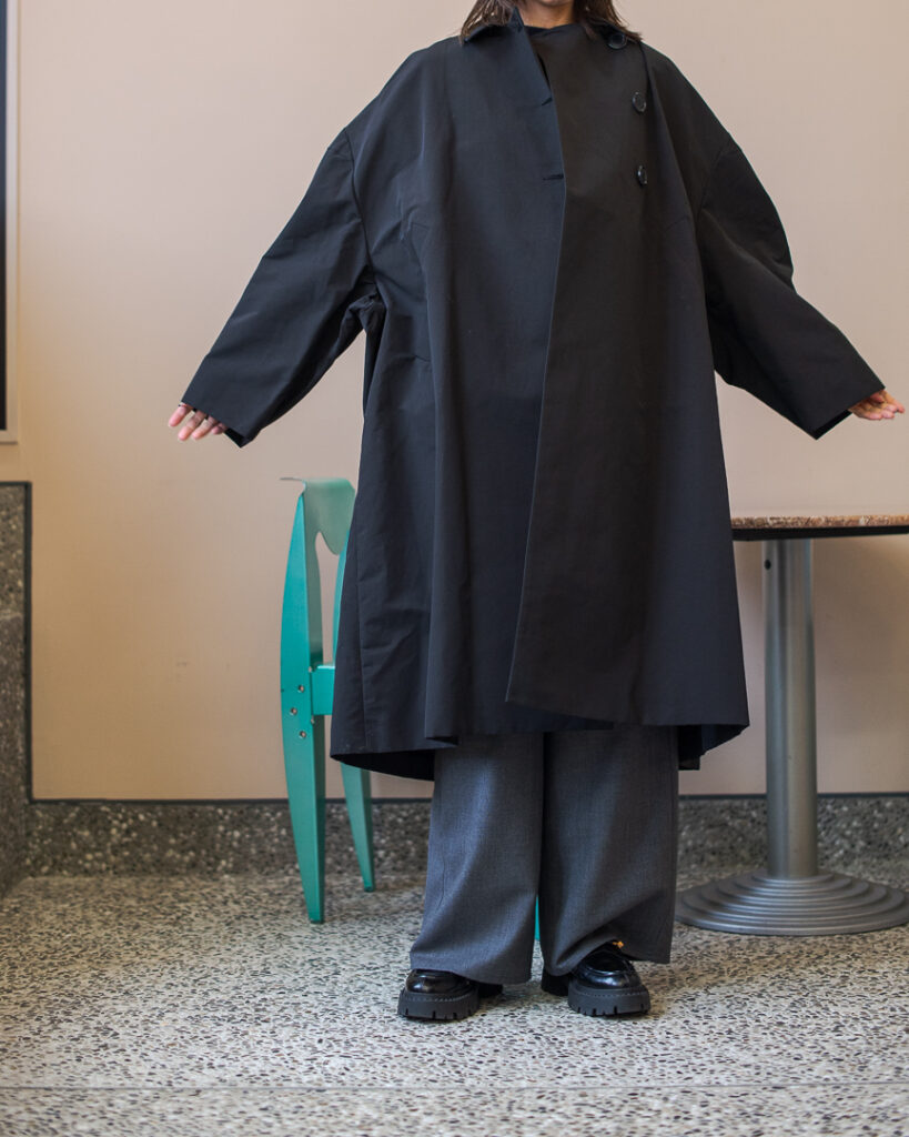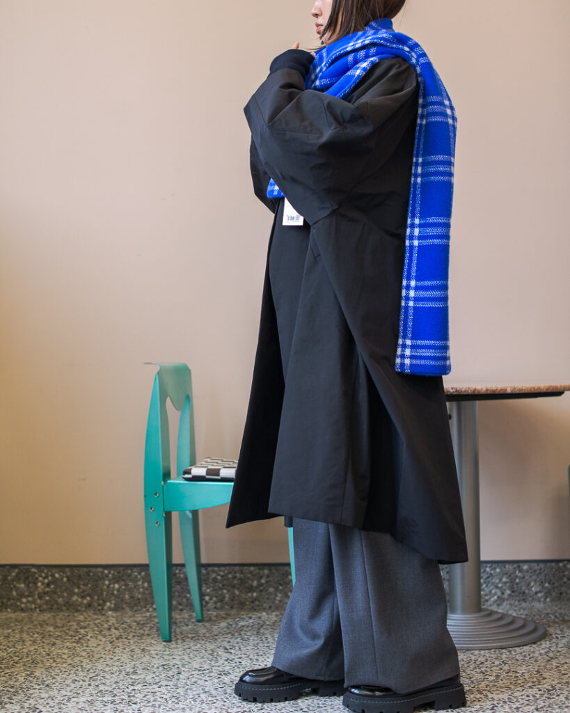 ボリュームのあるフレアシルエットの春先まで長くお召しいただける生地のステンカラーコート。