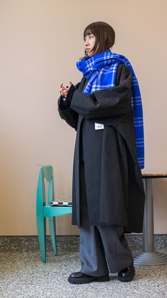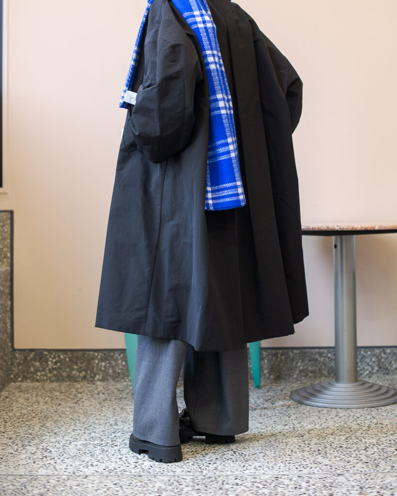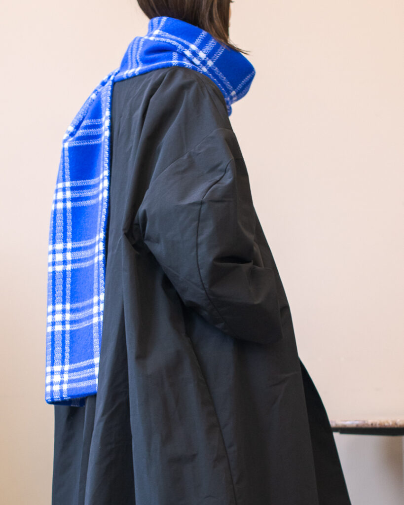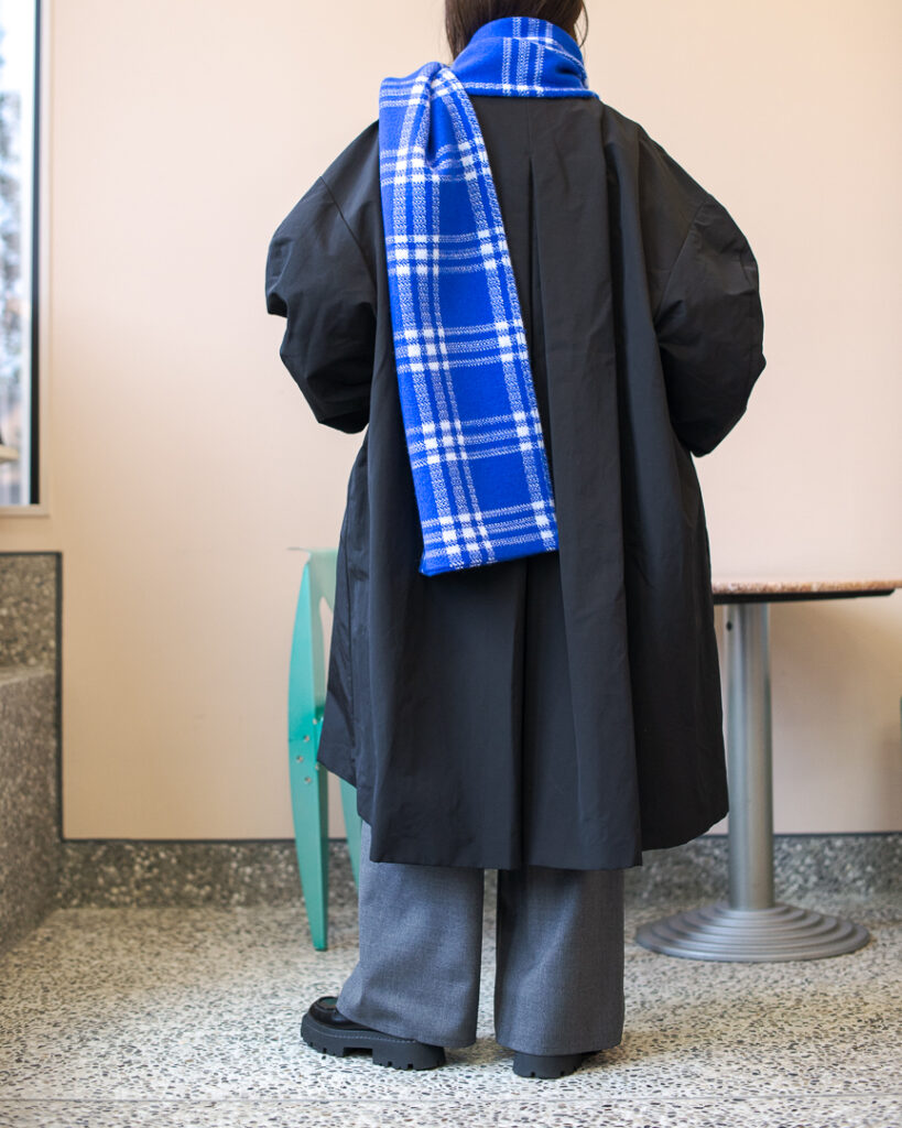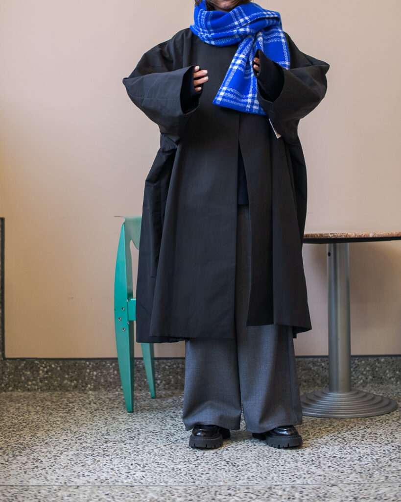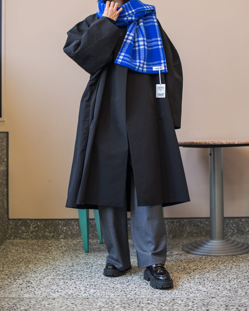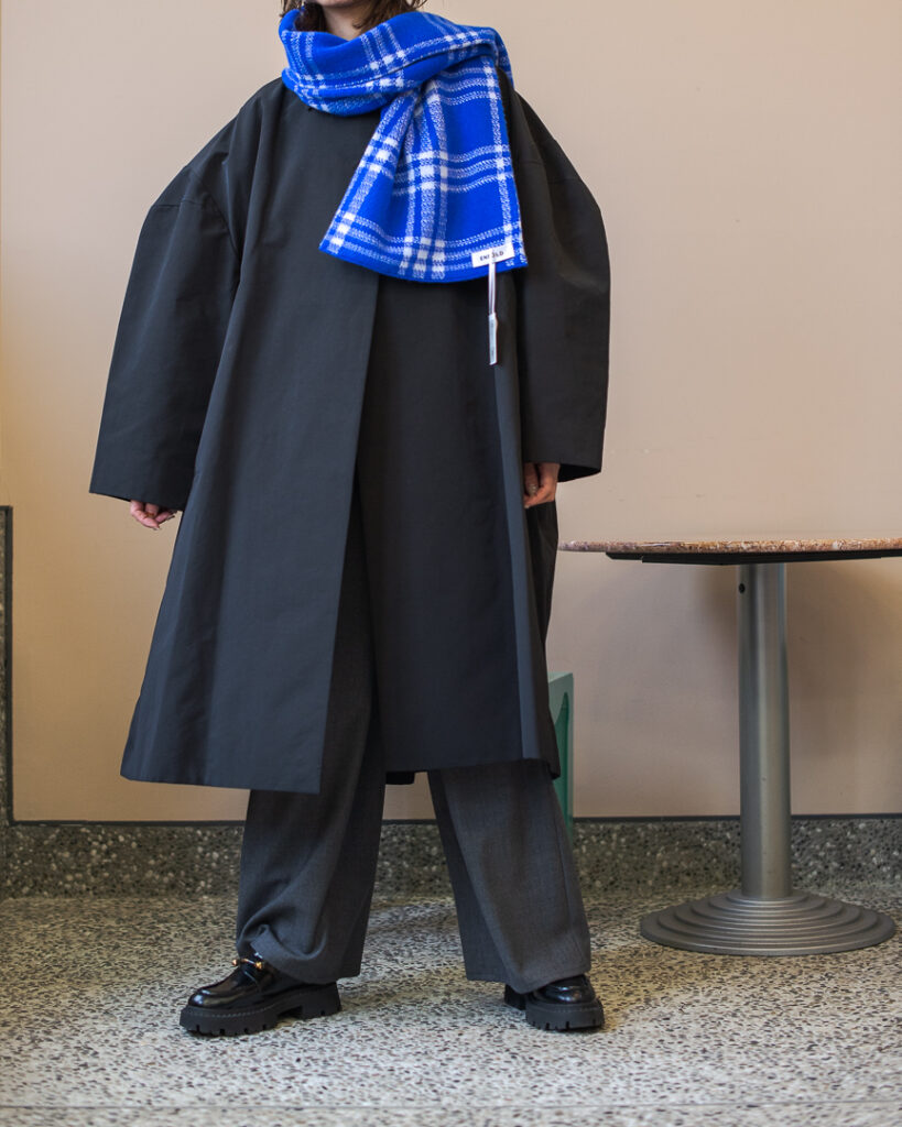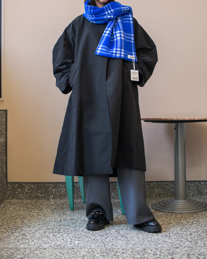 ボリュームのあるフレアシルエットの春先まで長くお召しいただける生地のステンカラーコート。