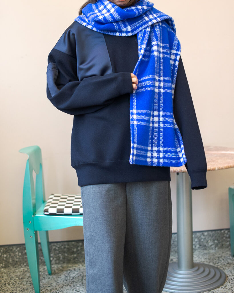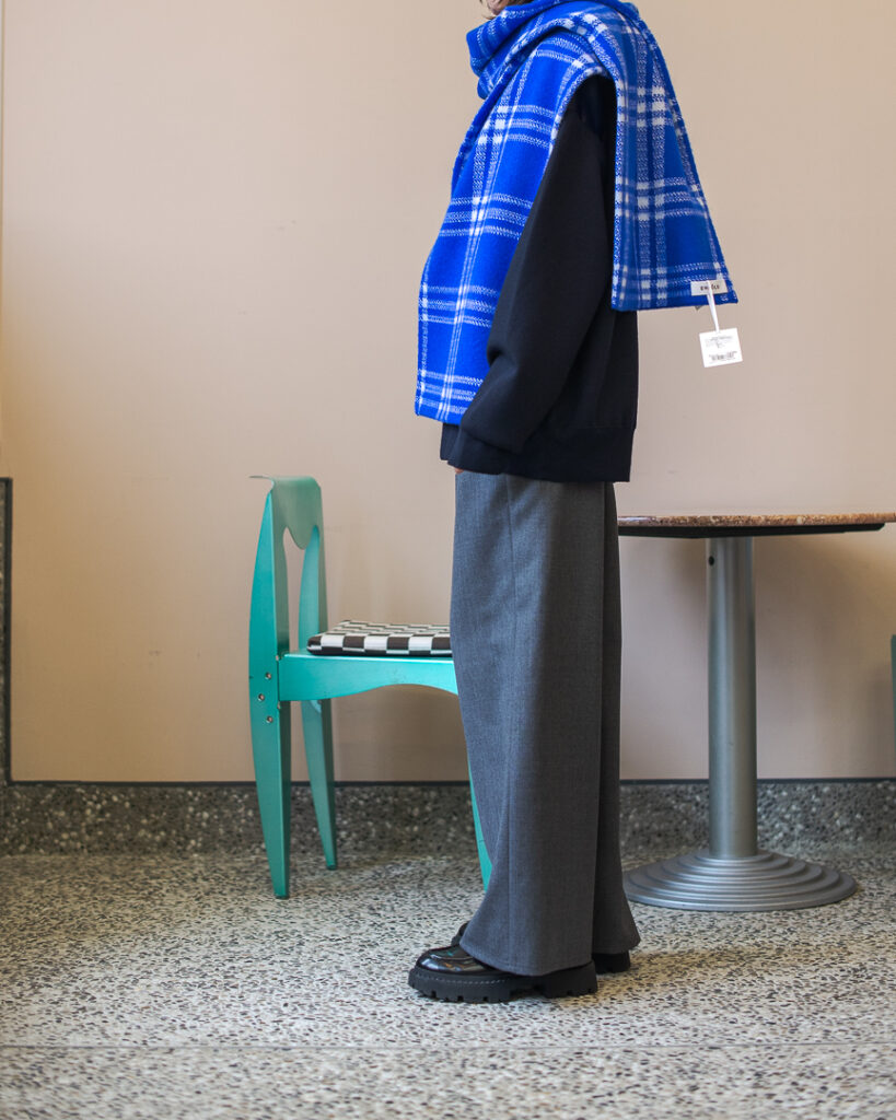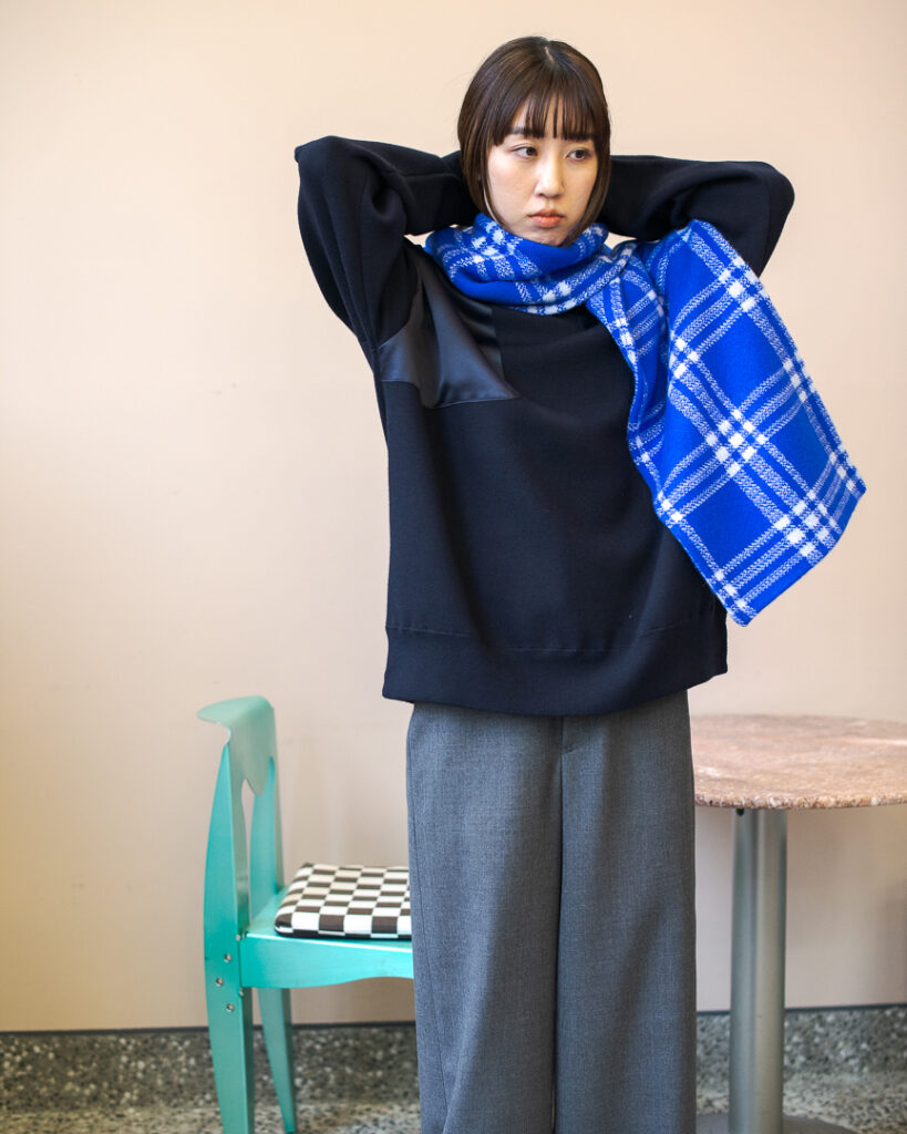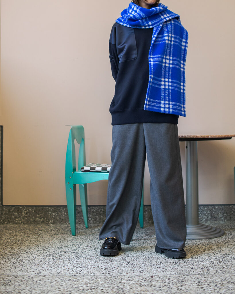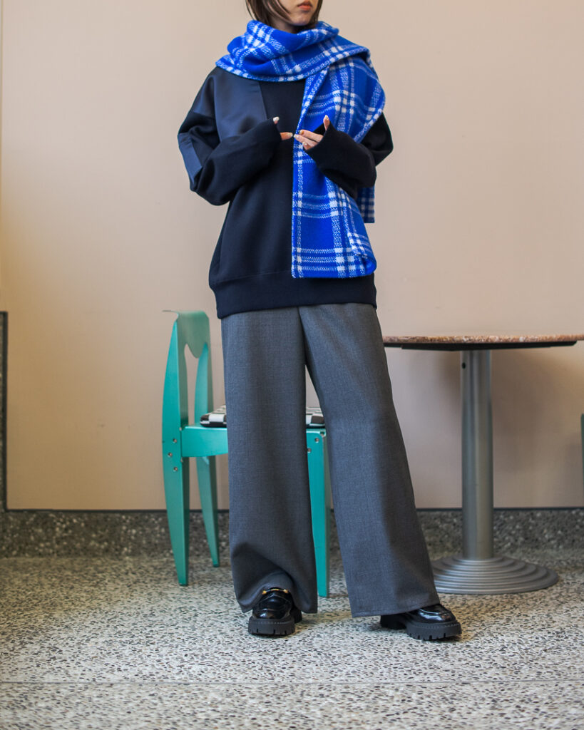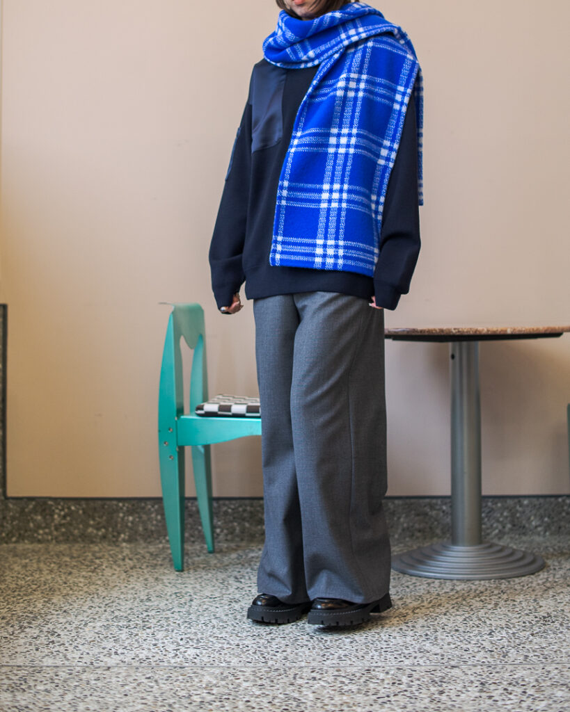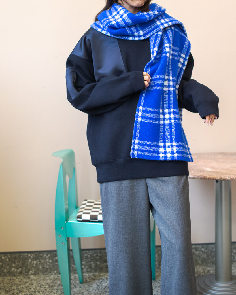 ニットプルオーバーとリンクしたボリューミーなマフラー。