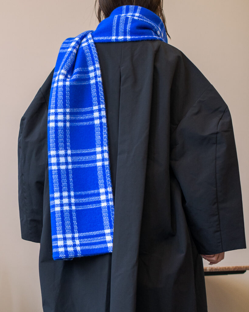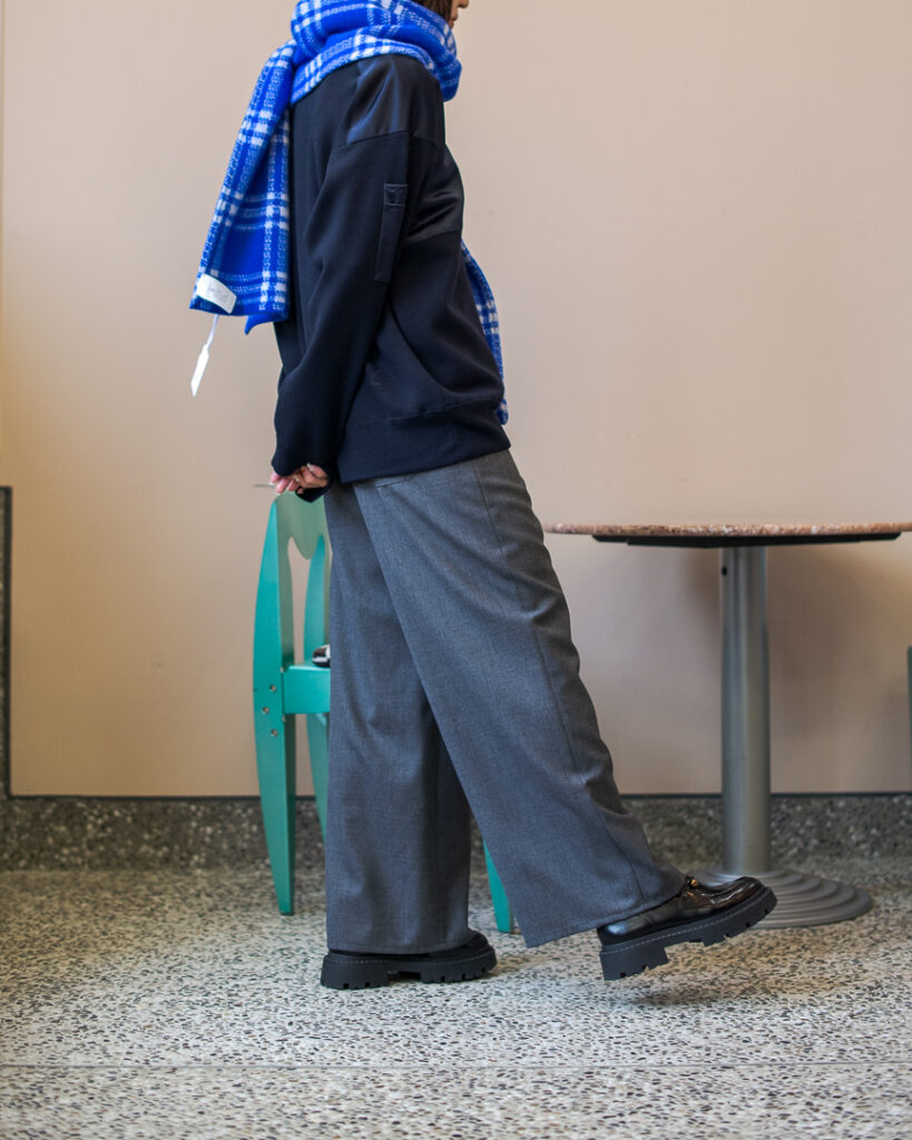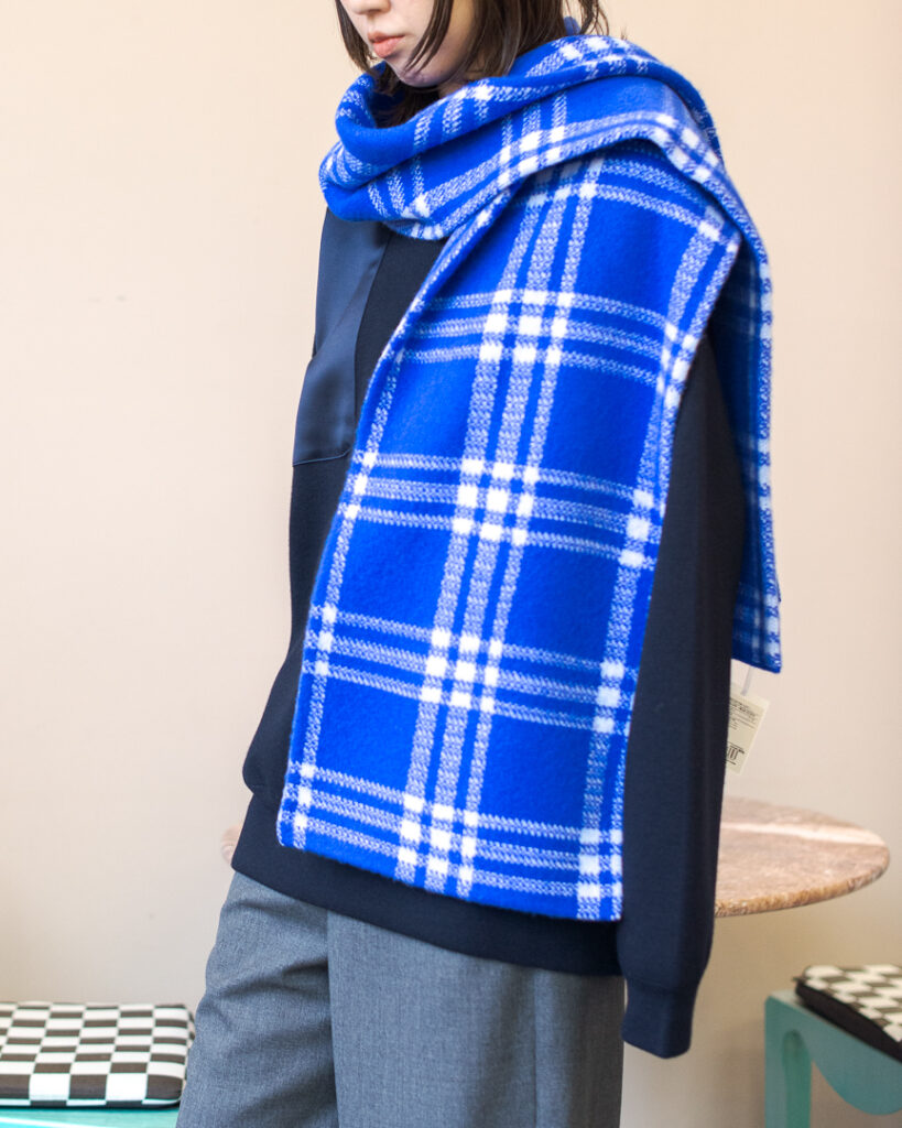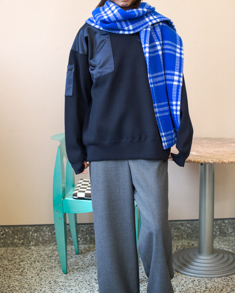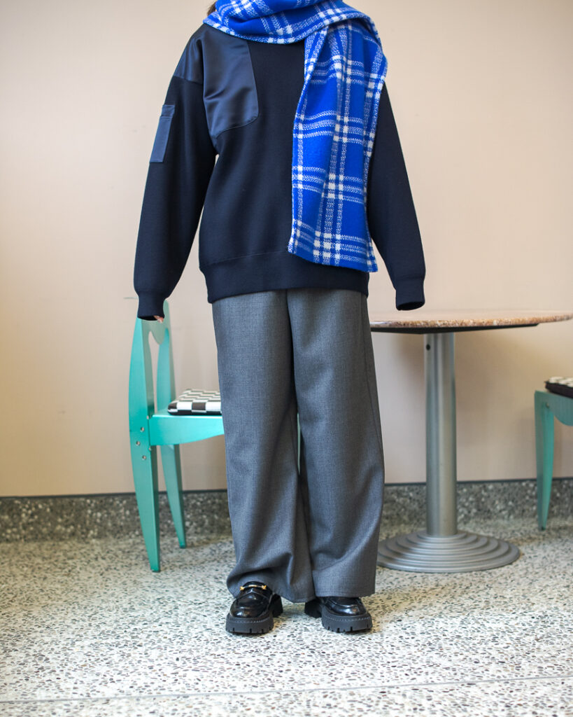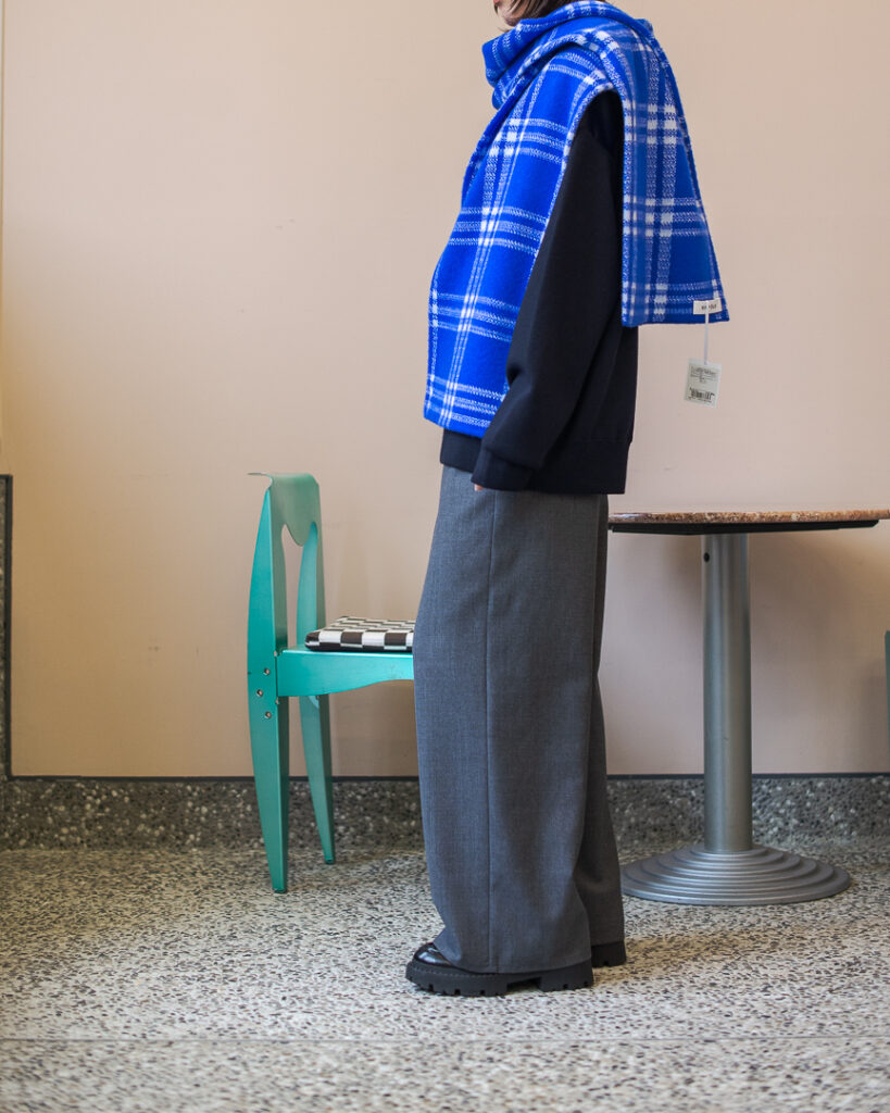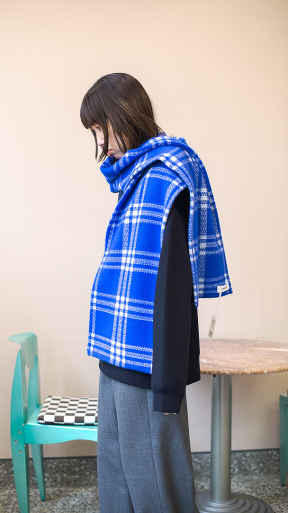 ニットプルオーバーとリンクしたボリューミーなマフラー。