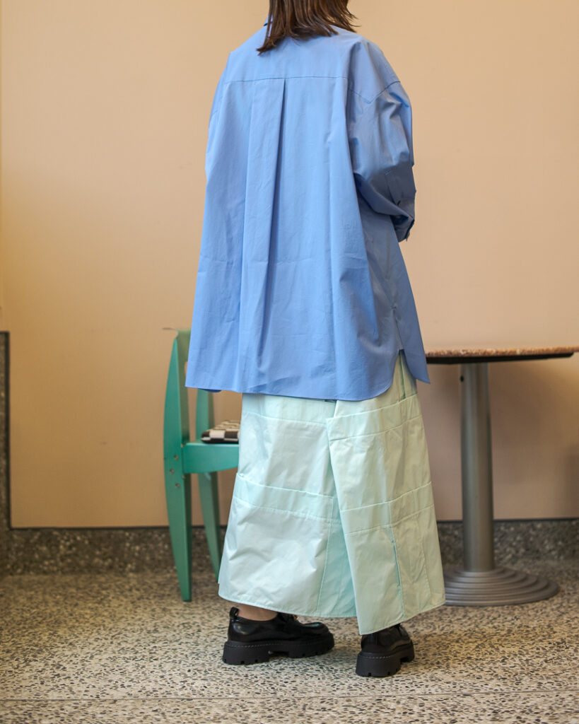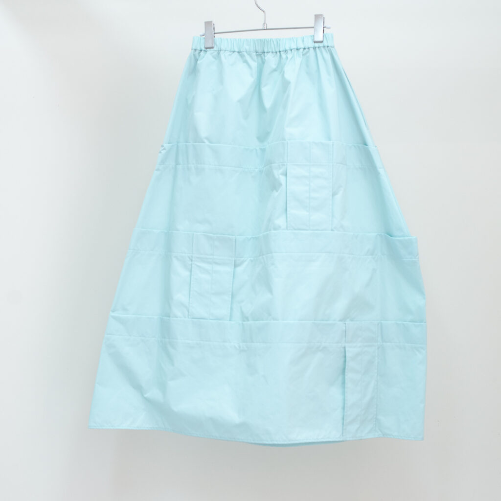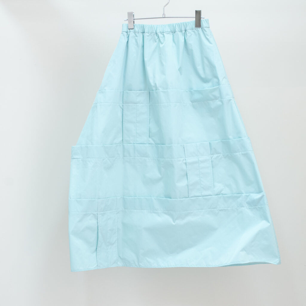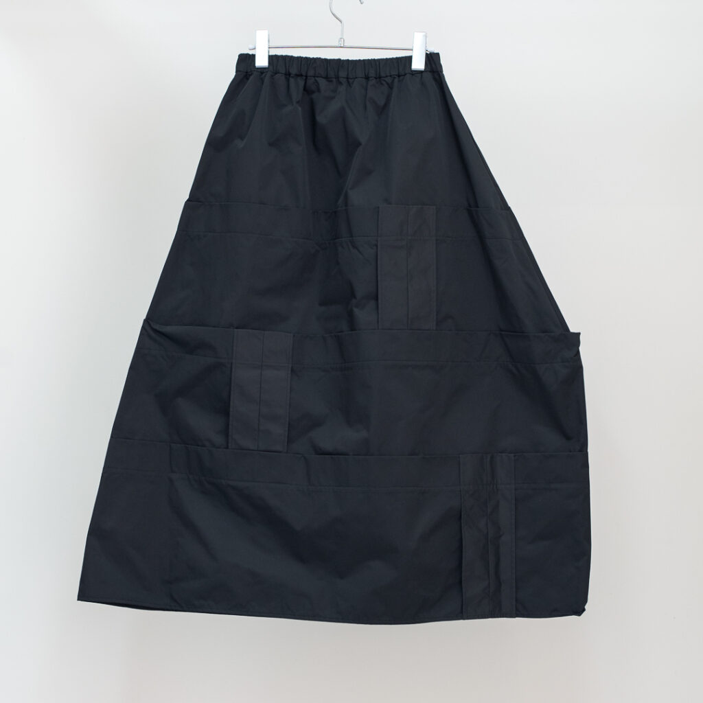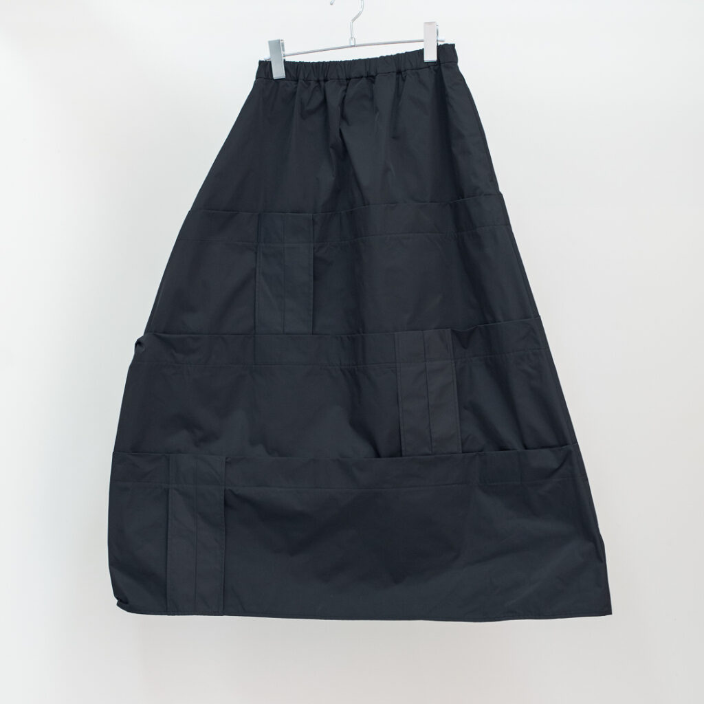 縫い代をあえて表出しにしたり、接ぐ位置をバラバラにしたり、段々と縫い繋げられたアンバランスなスカート。