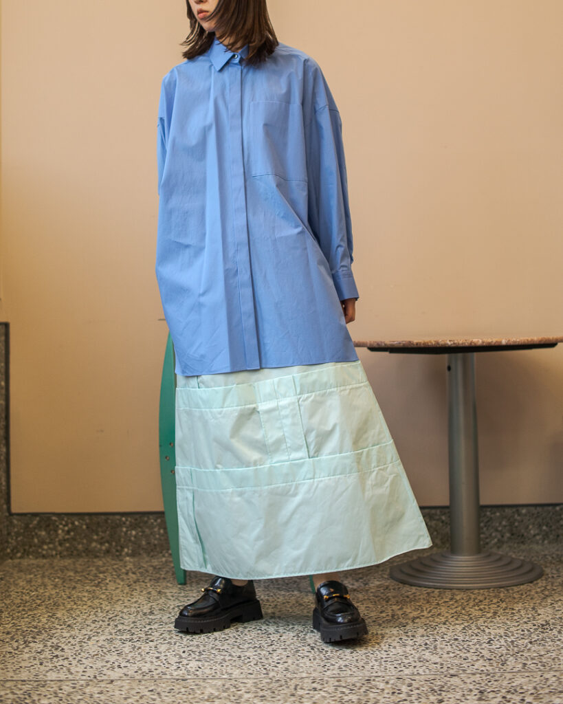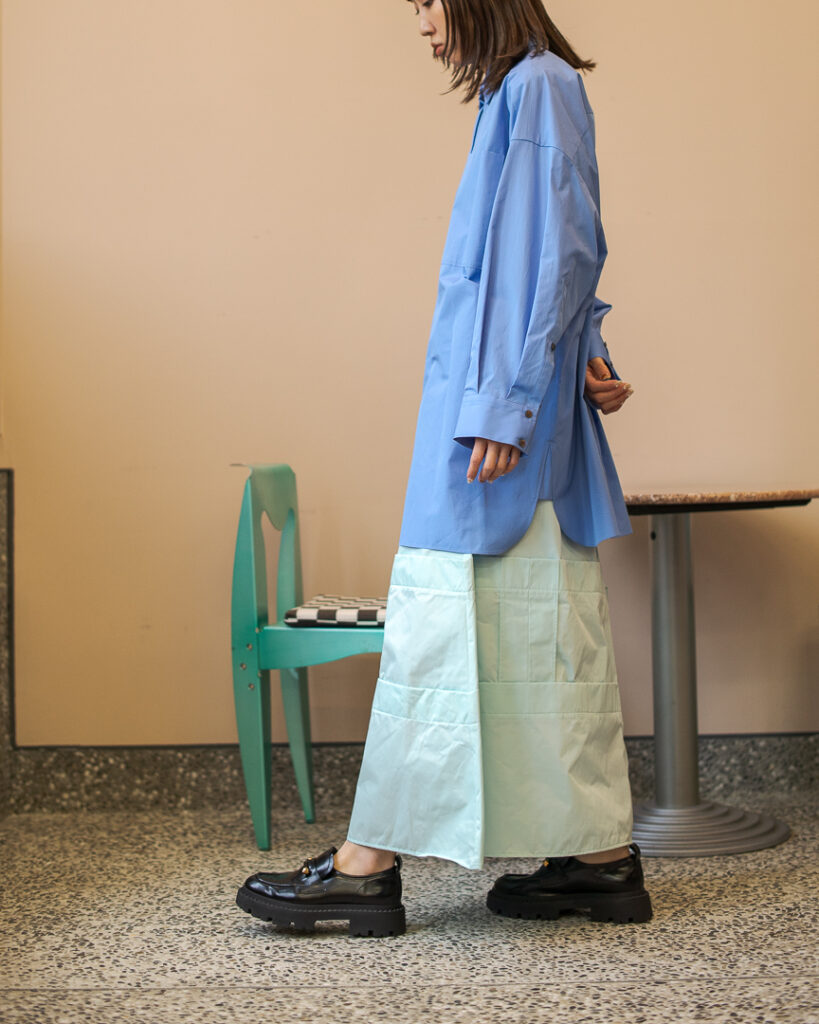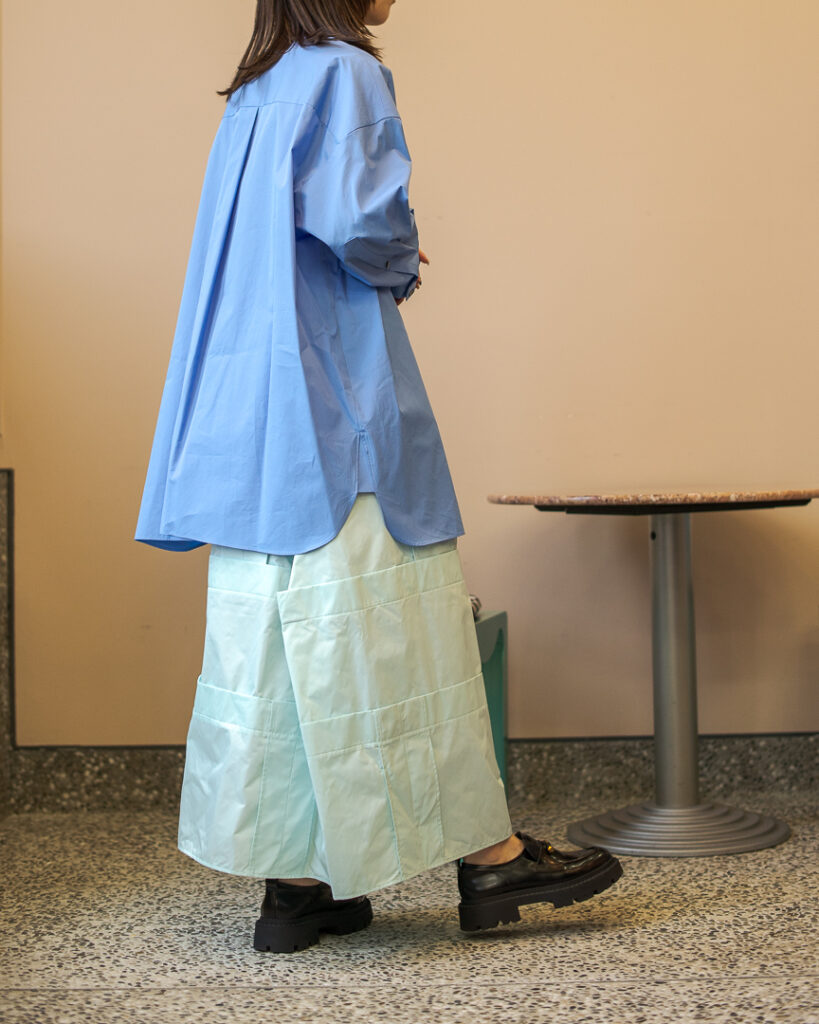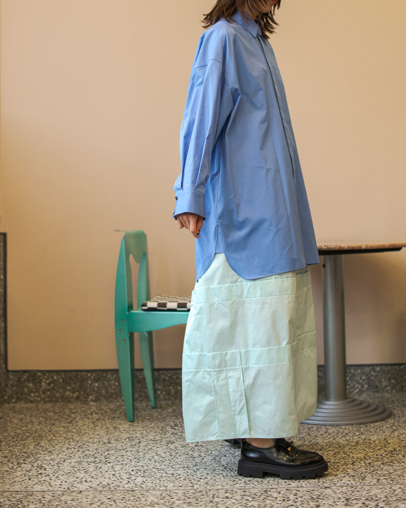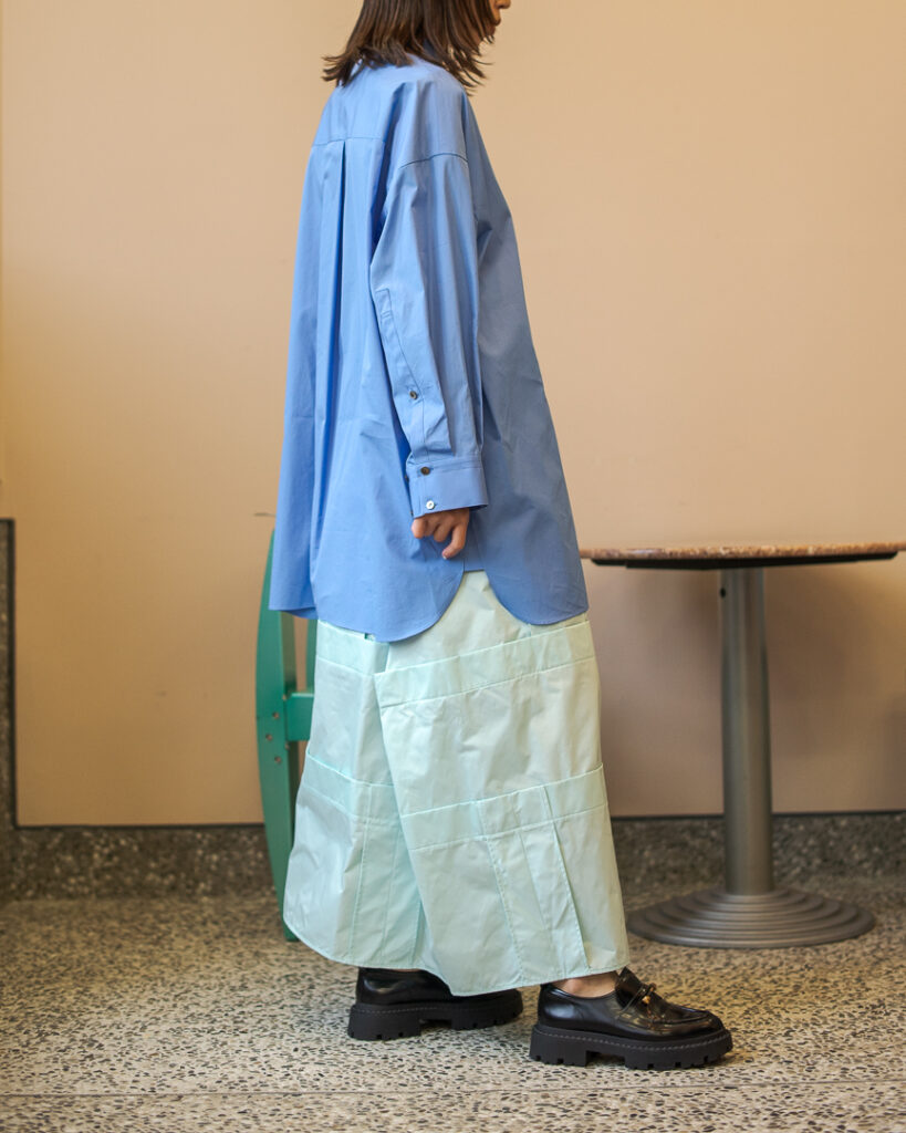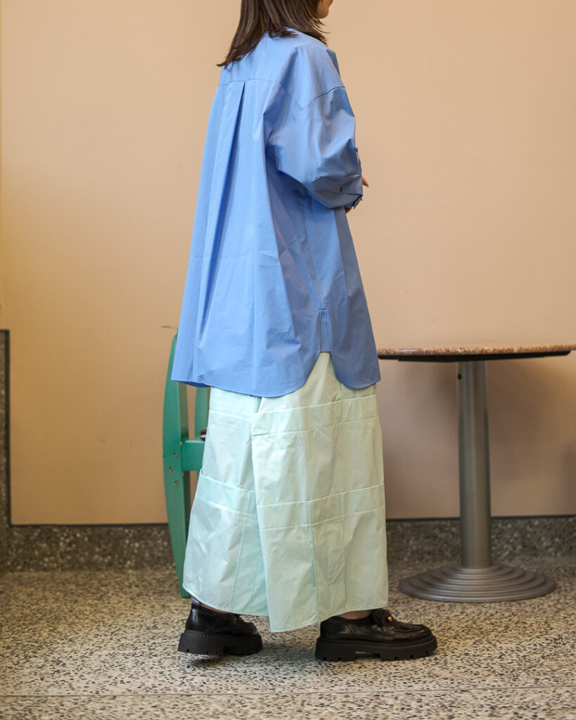 縫い代をあえて表出しにしたり、接ぐ位置をバラバラにしたり、段々と縫い繋げられたアンバランスなスカート。