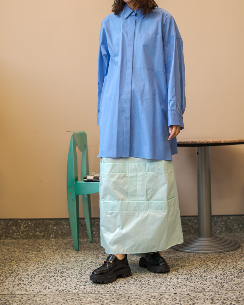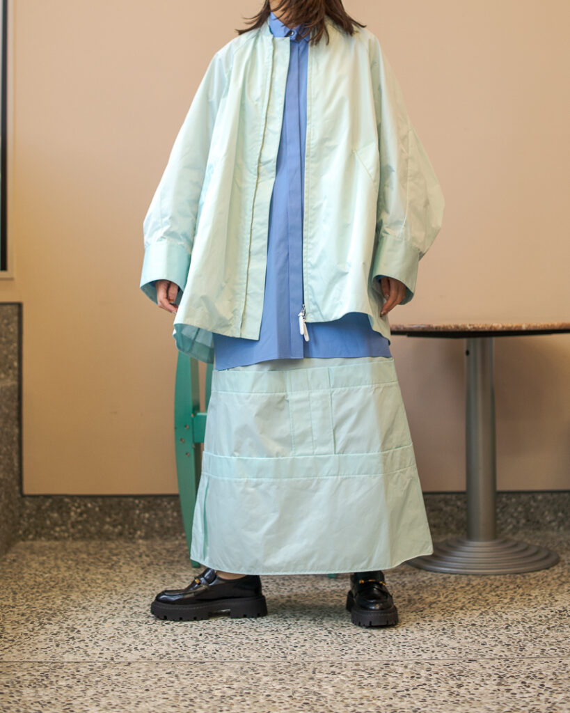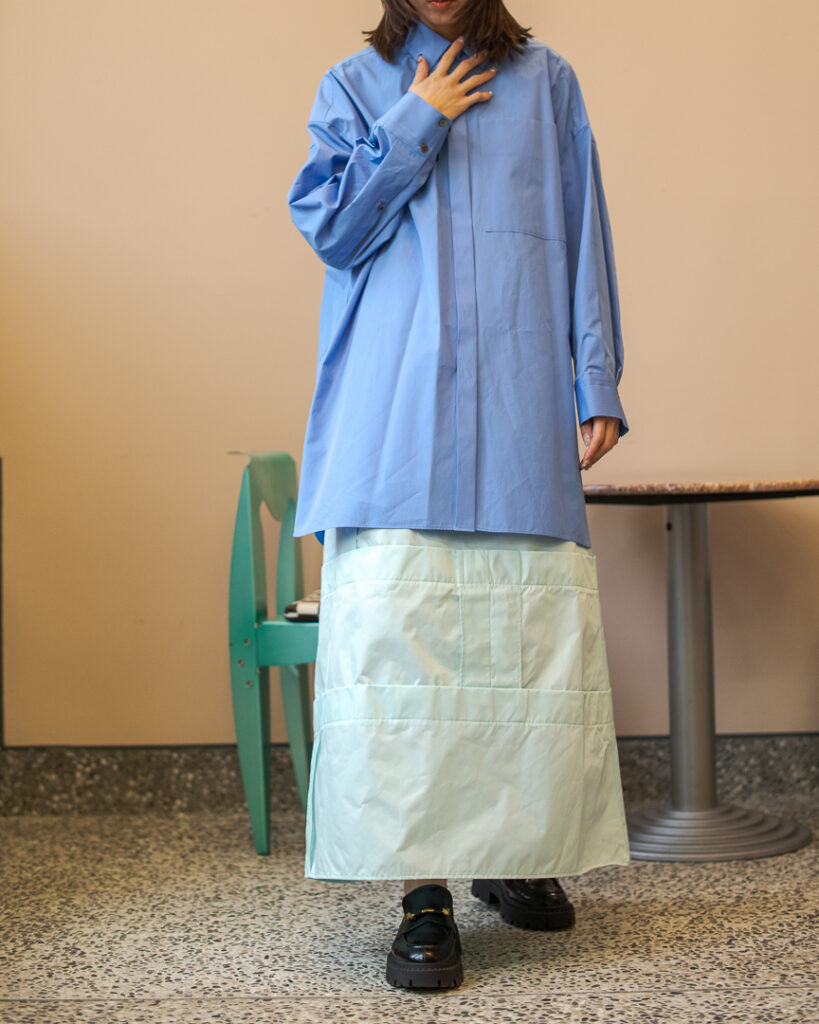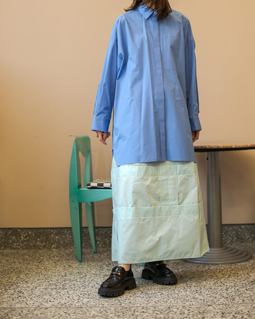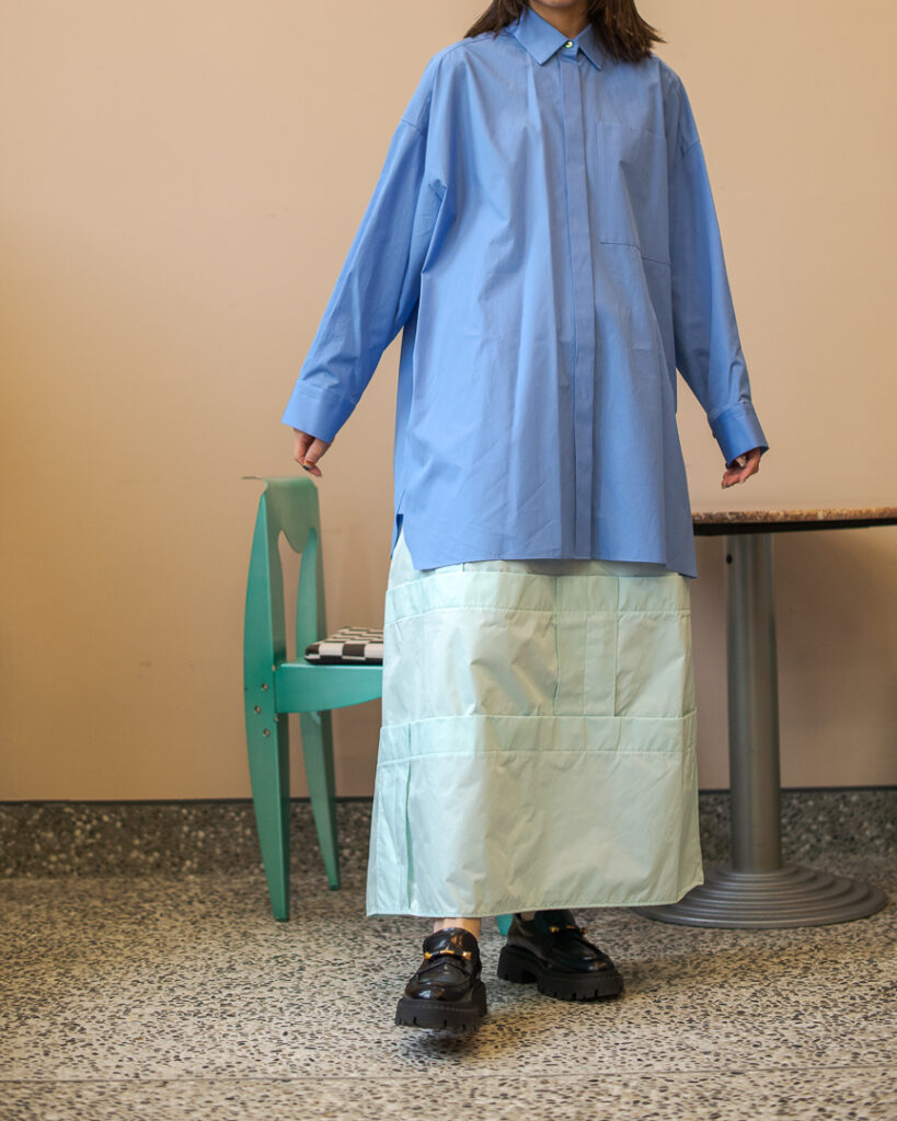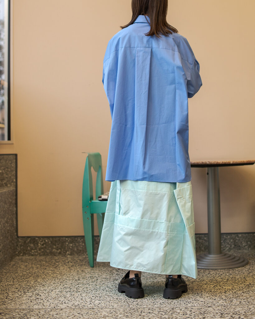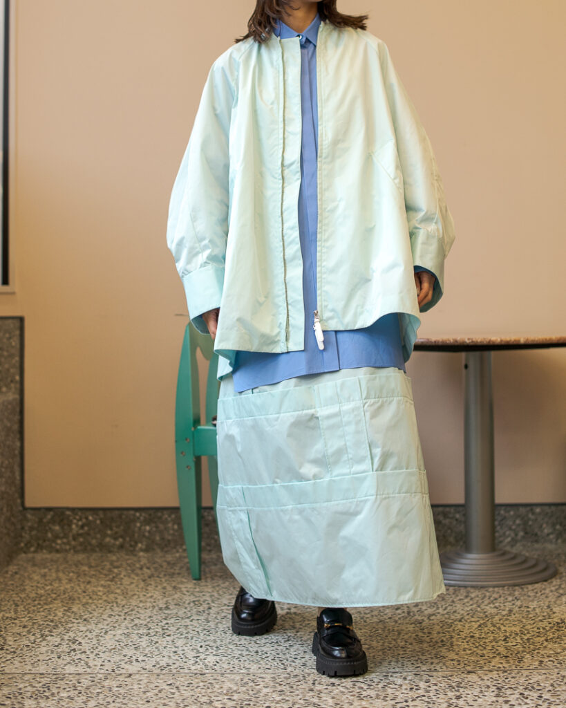 縫い代をあえて表出しにしたり、接ぐ位置をバラバラにしたり、段々と縫い繋げられたアンバランスなスカート。