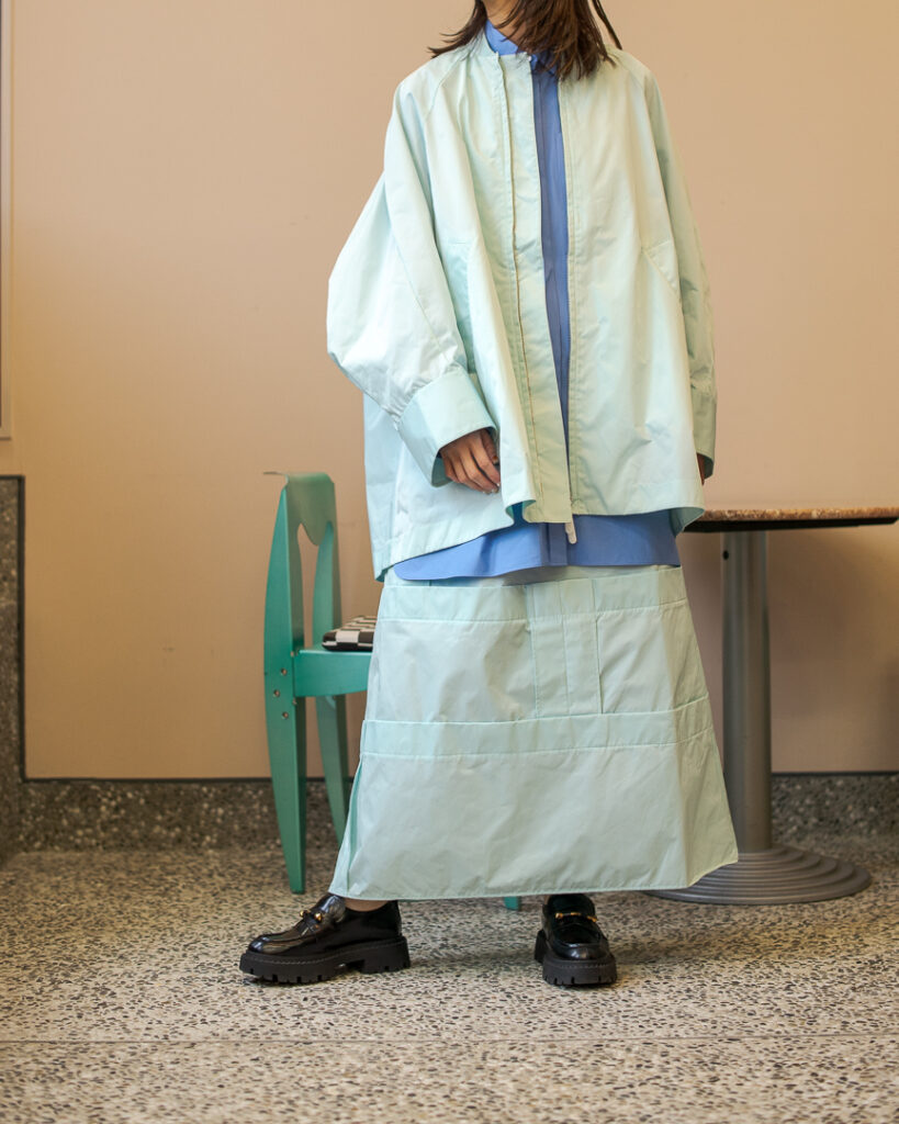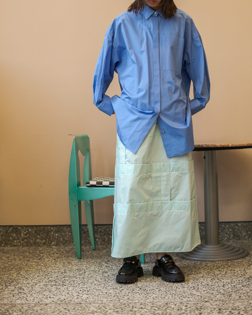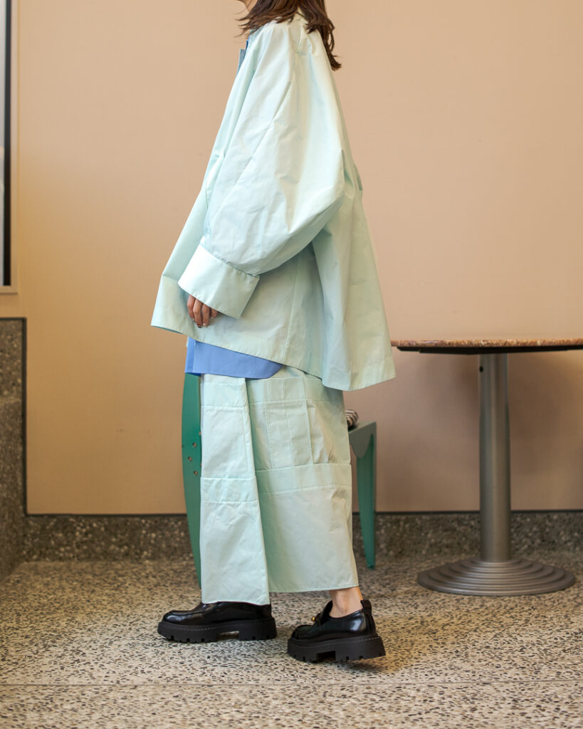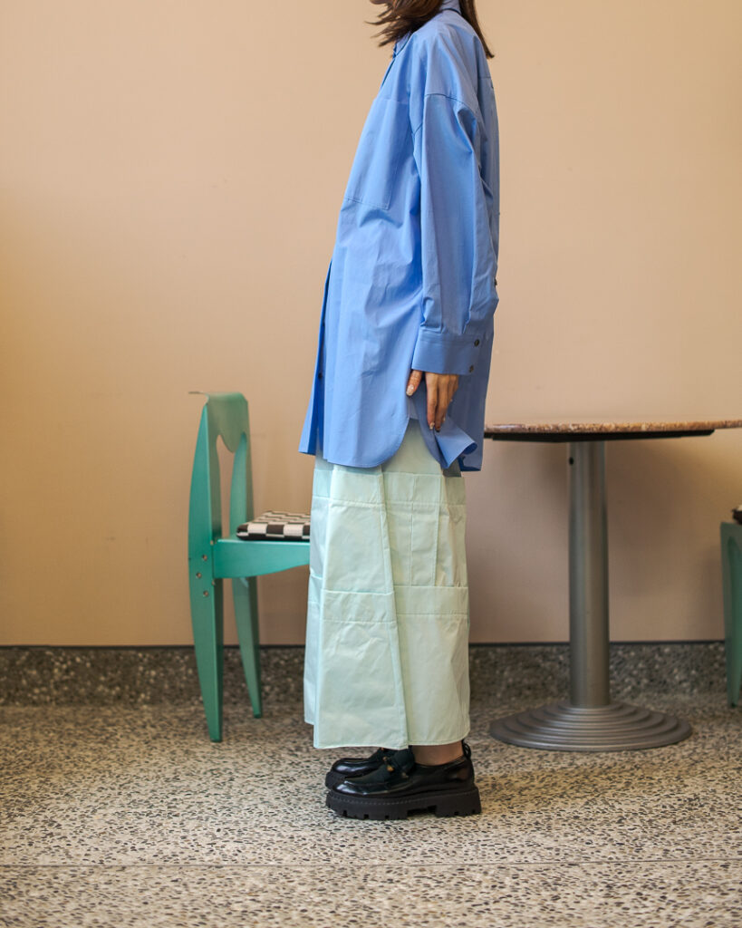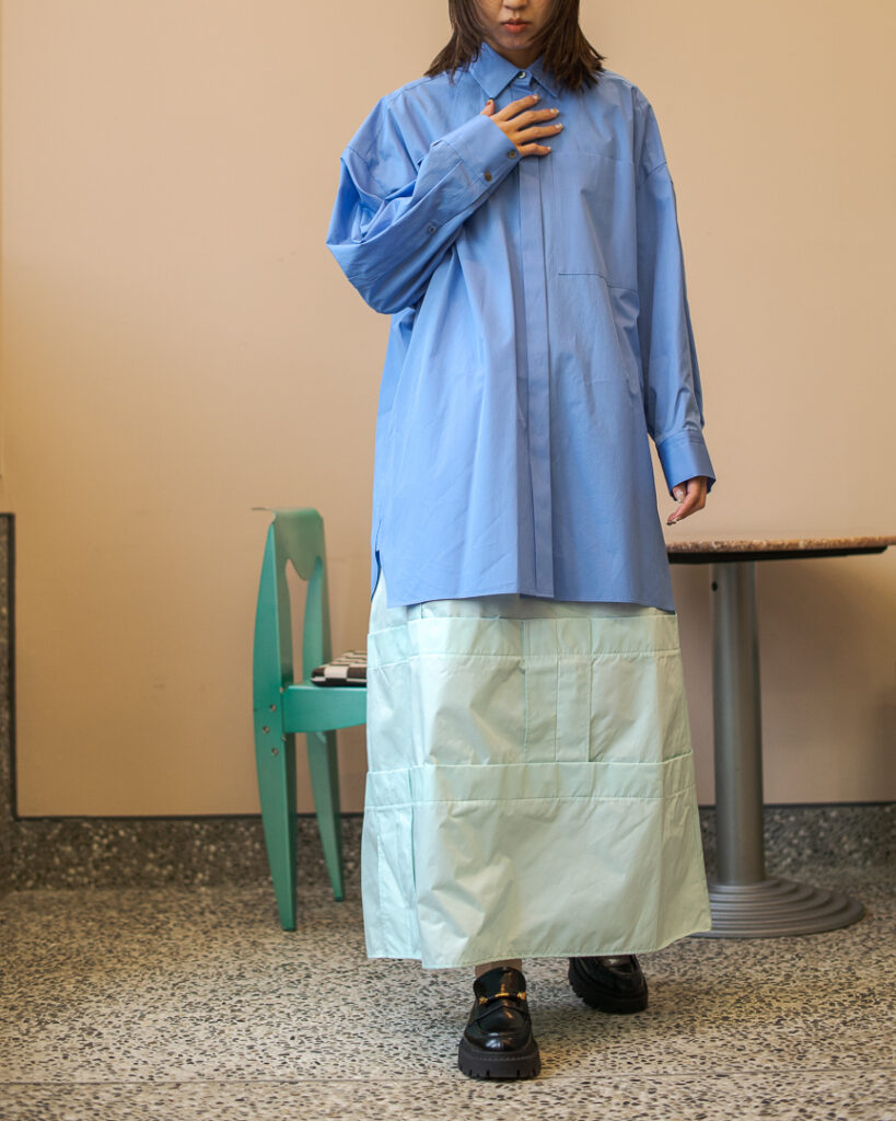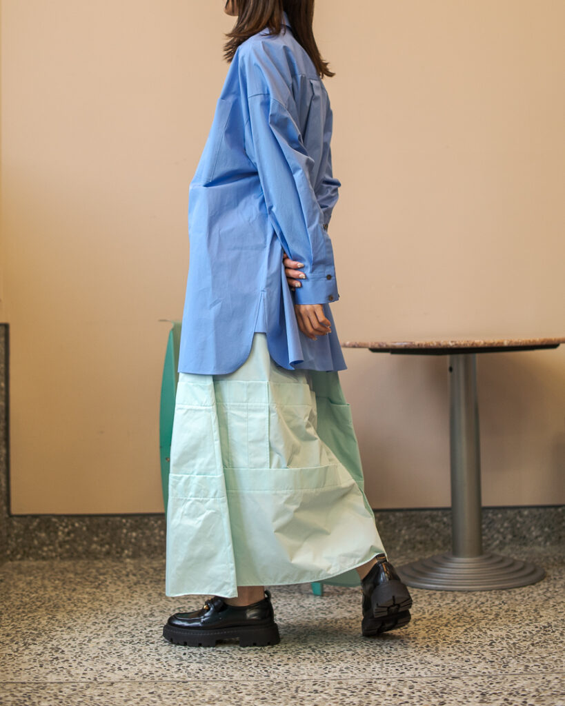 縫い代をあえて表出しにしたり、接ぐ位置をバラバラにしたり、段々と縫い繋げられたアンバランスなスカート。