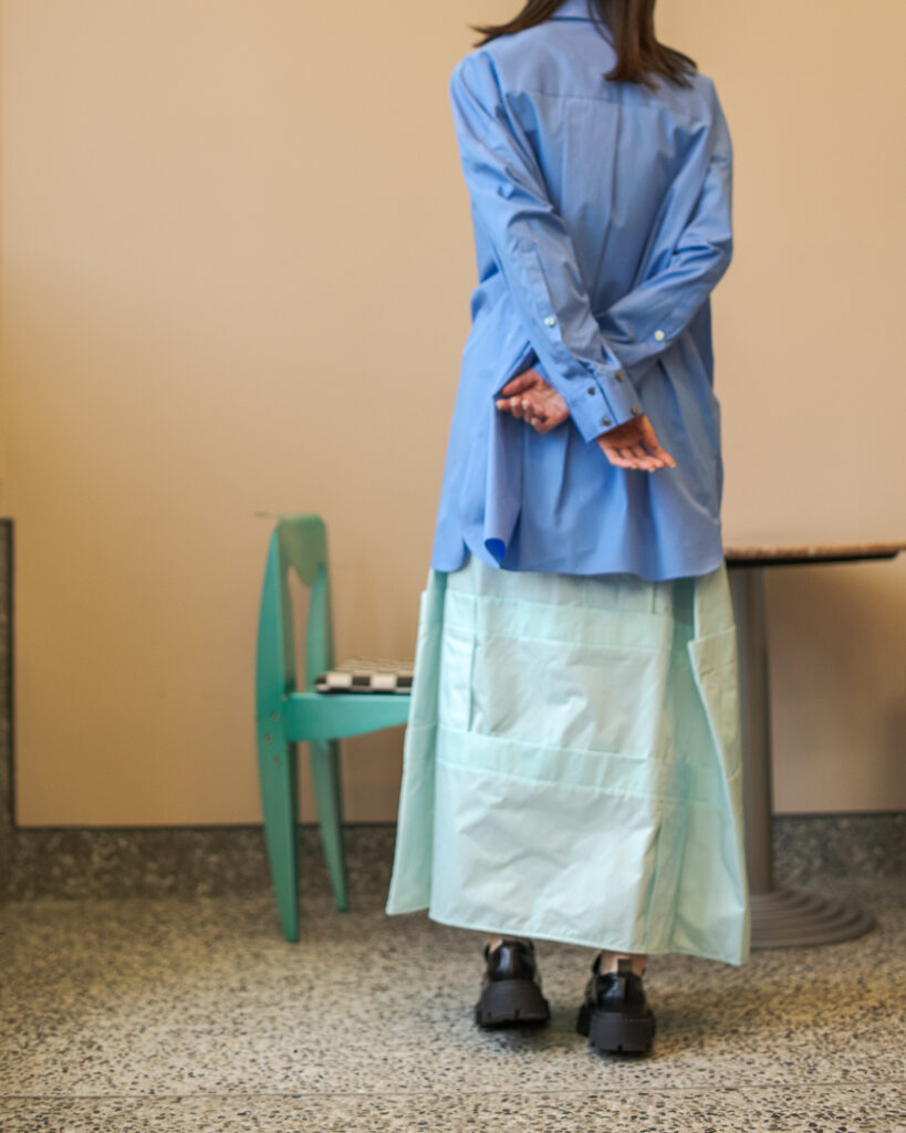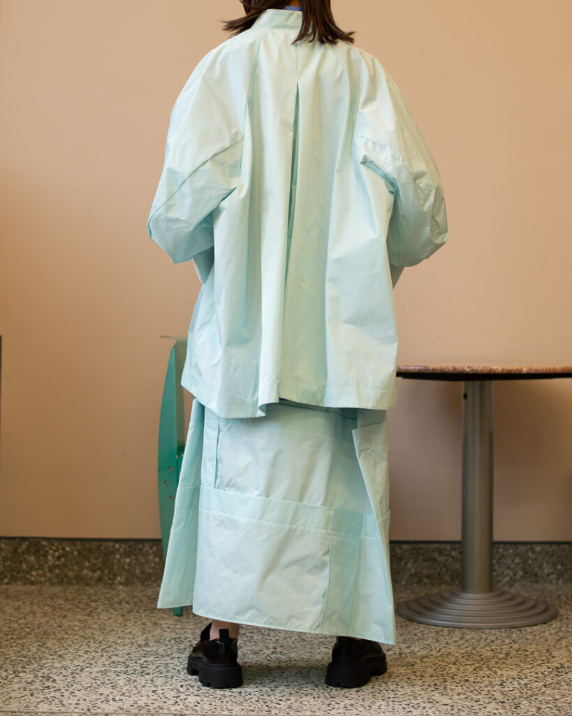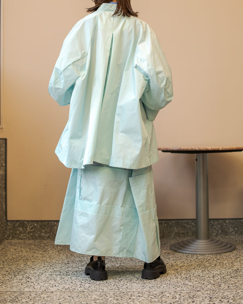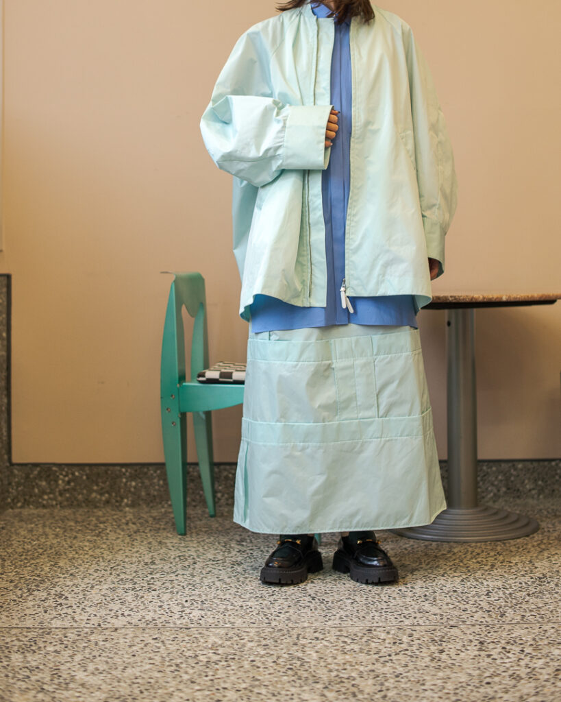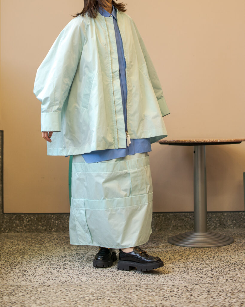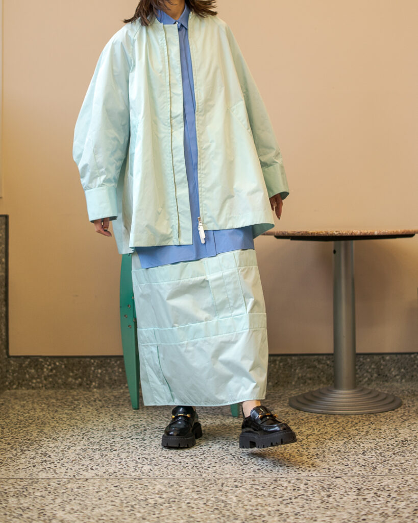 縫い代をあえて表出しにしたり、接ぐ位置をバラバラにしたり、段々と縫い繋げられたアンバランスなスカート。