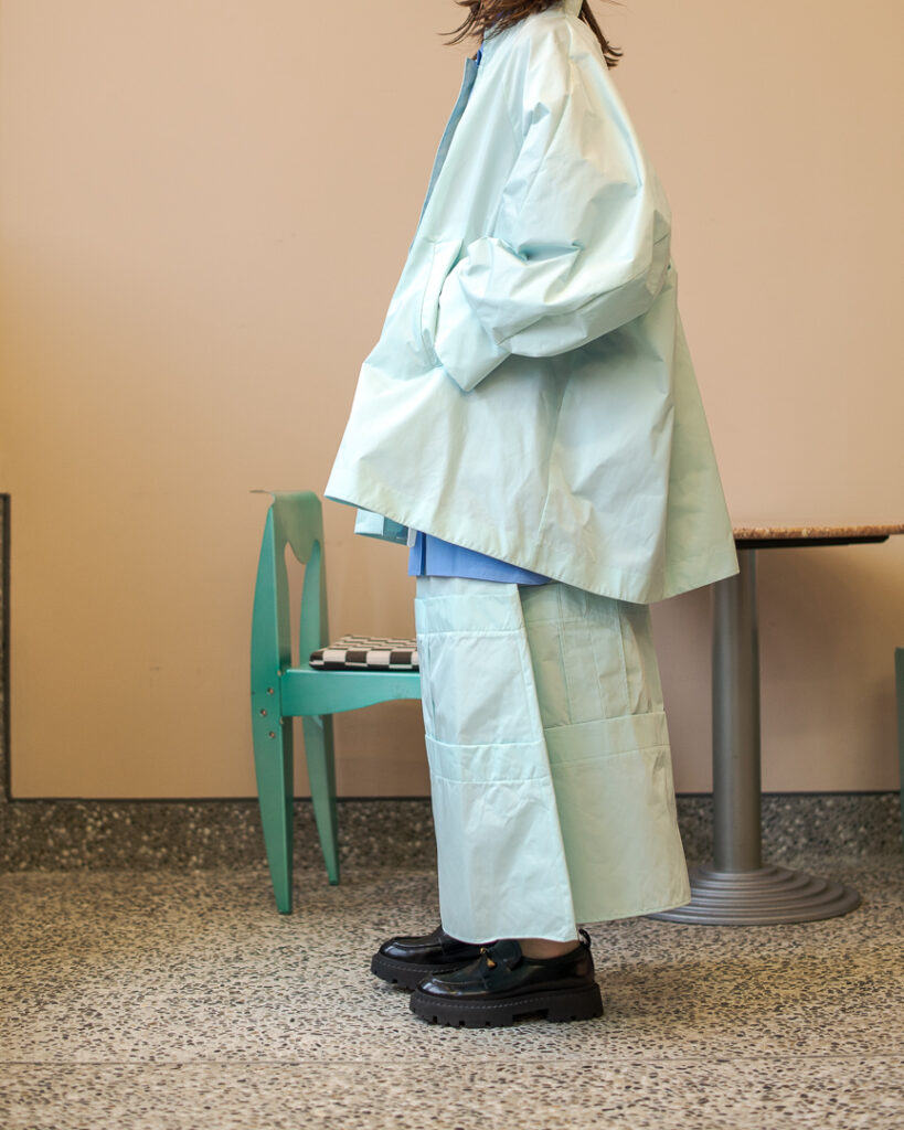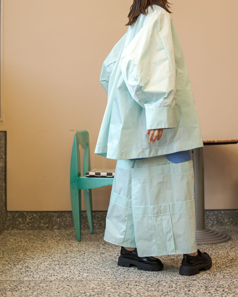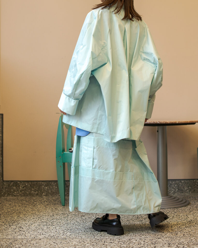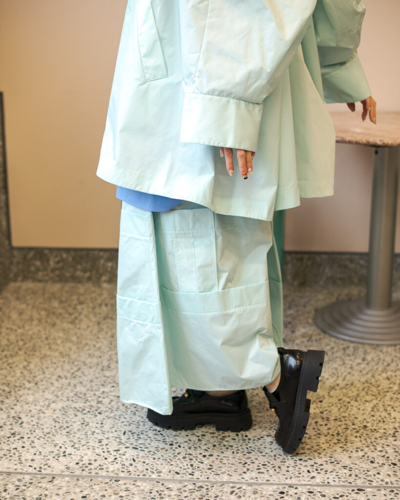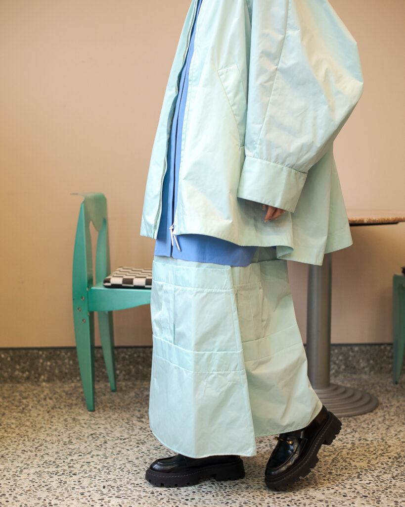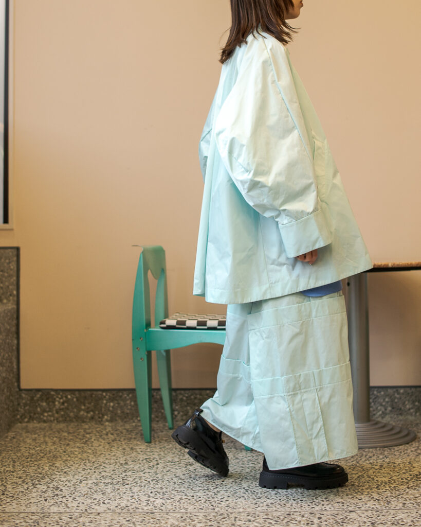 縫い代をあえて表出しにしたり、接ぐ位置をバラバラにしたり、段々と縫い繋げられたアンバランスなスカート。