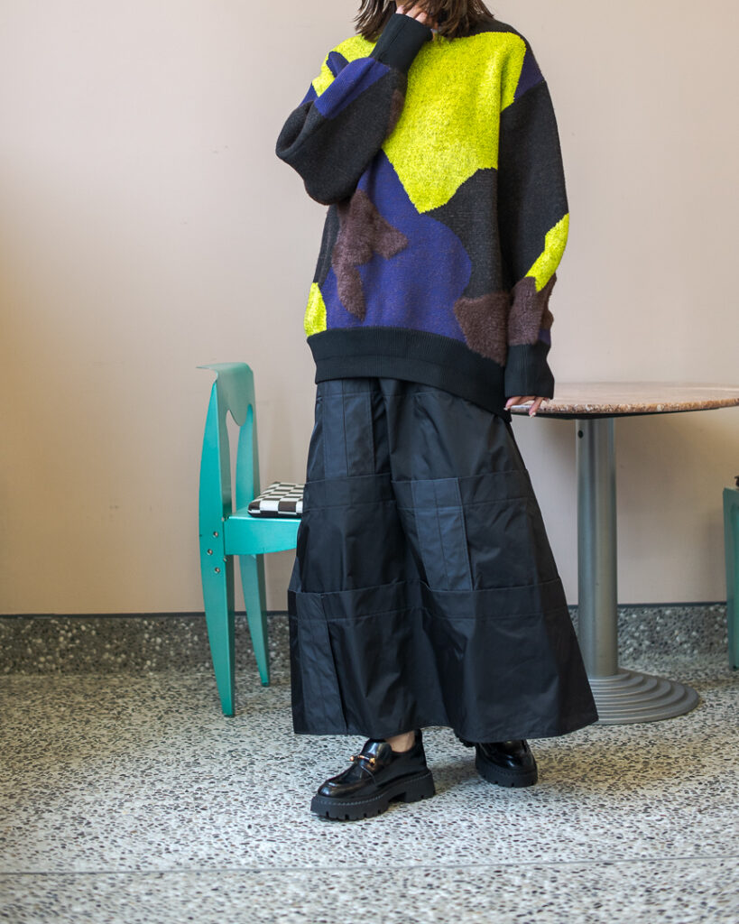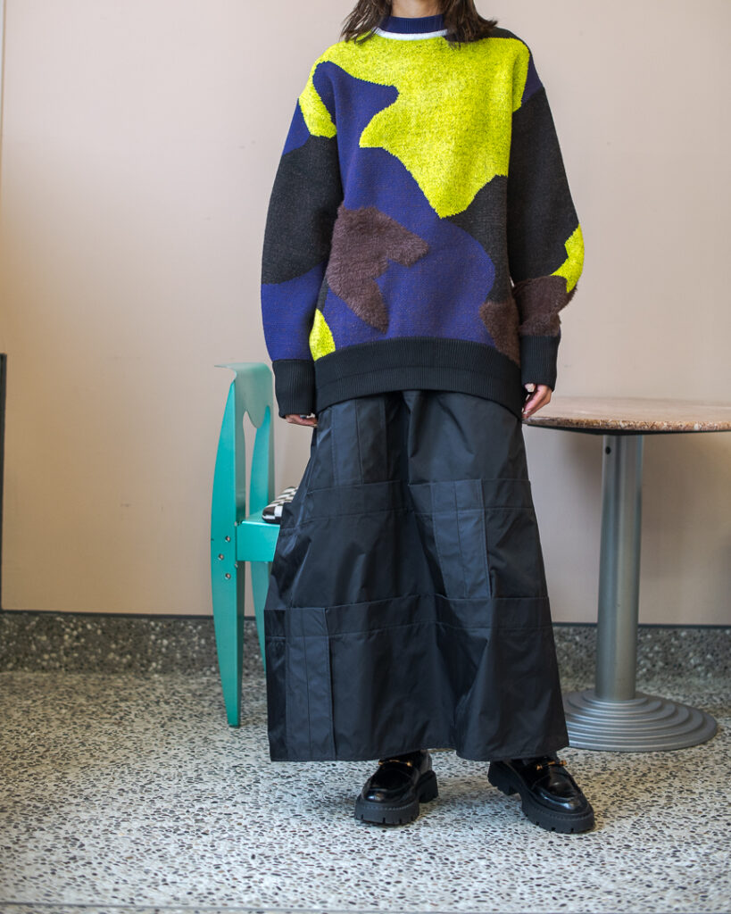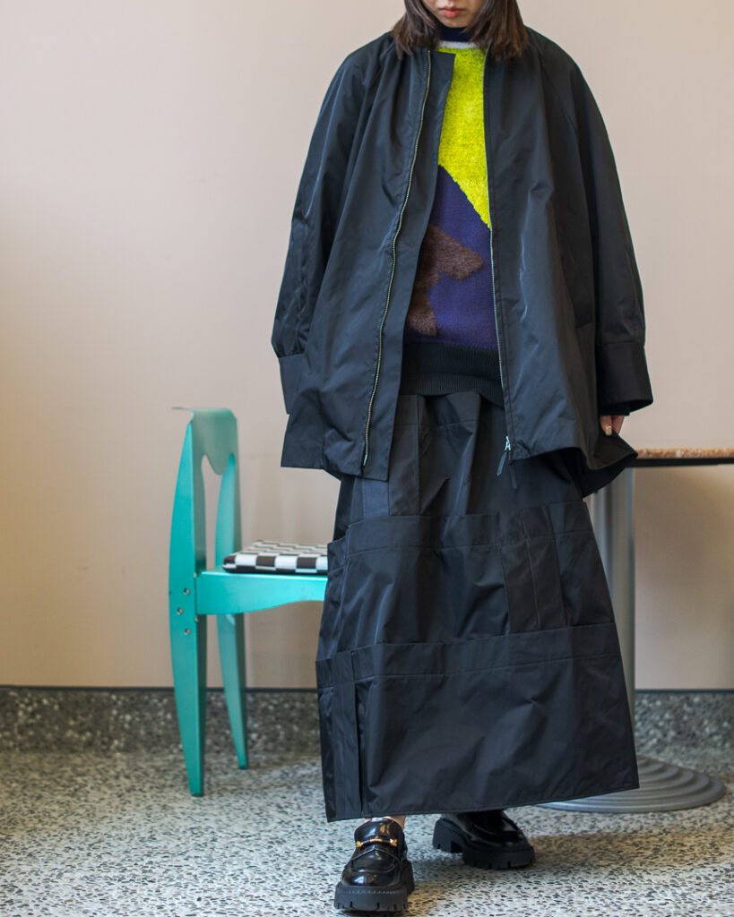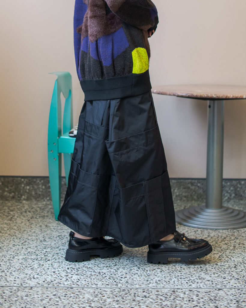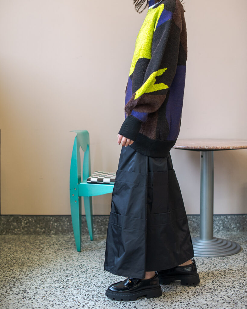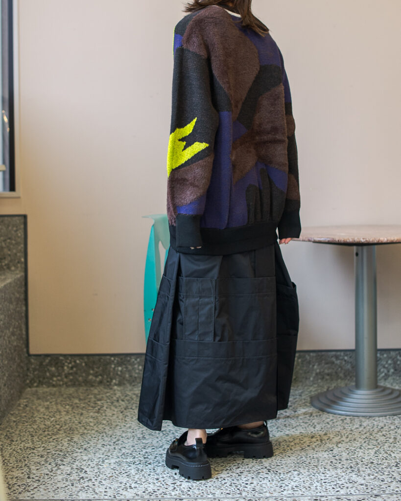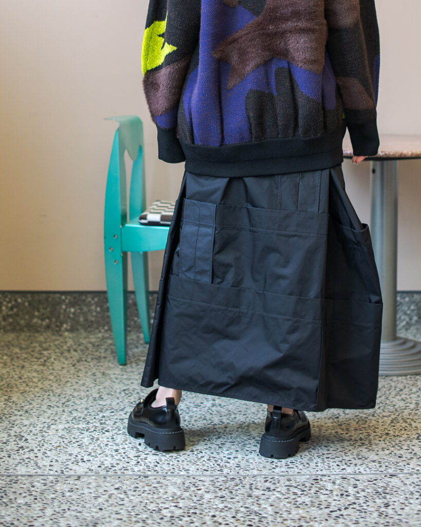縫い代をあえて表出しにしたり、接ぐ位置をバラバラにしたり、段々と縫い繋げられたアンバランスなスカート。