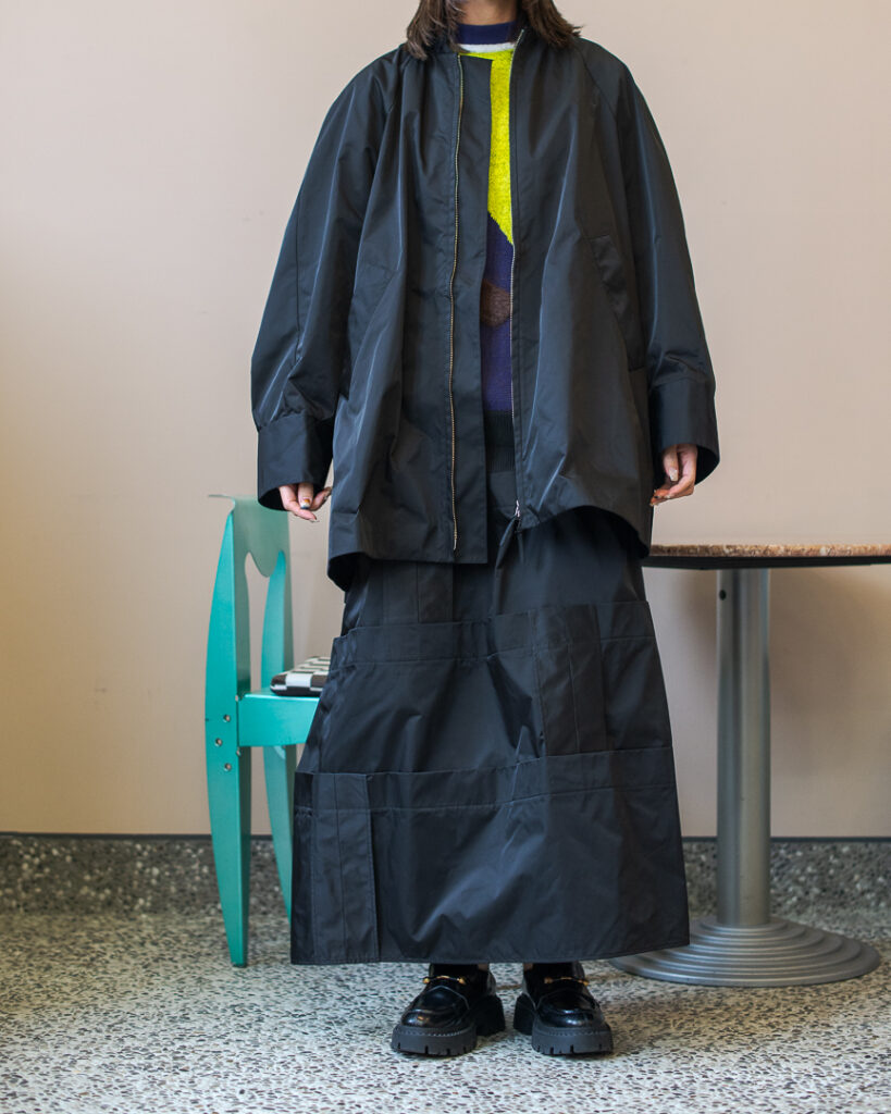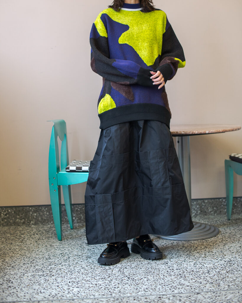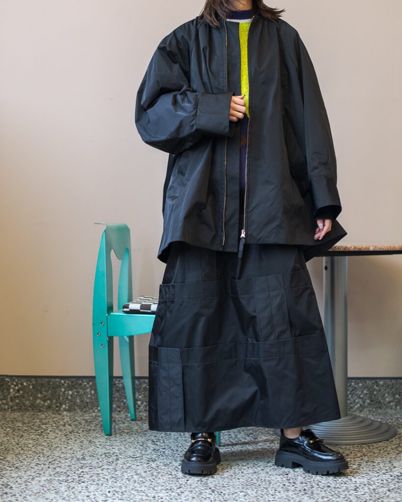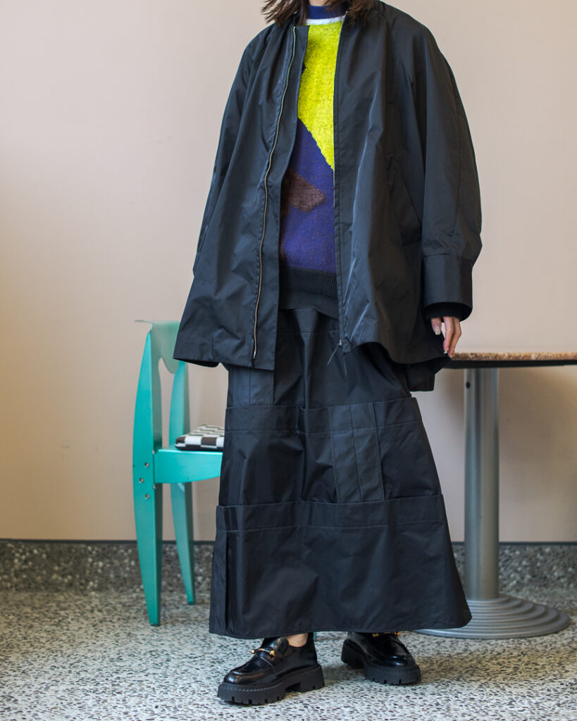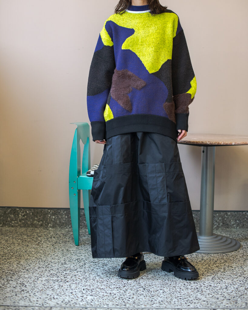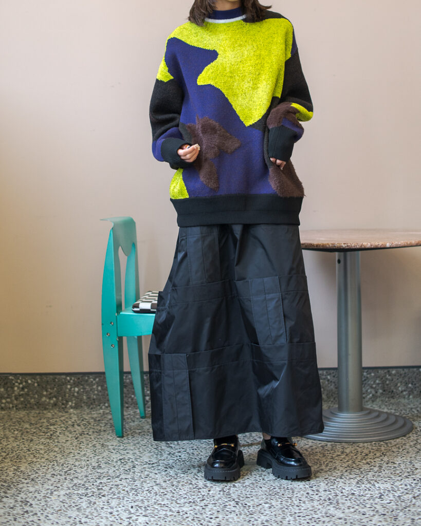 縫い代をあえて表出しにしたり、接ぐ位置をバラバラにしたり、段々と縫い繋げられたアンバランスなスカート。