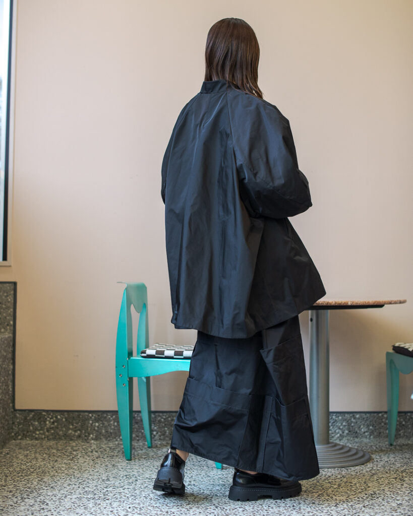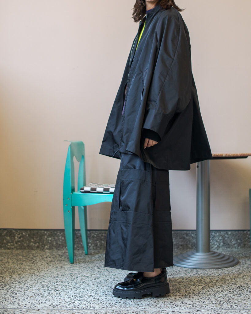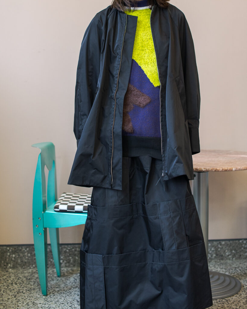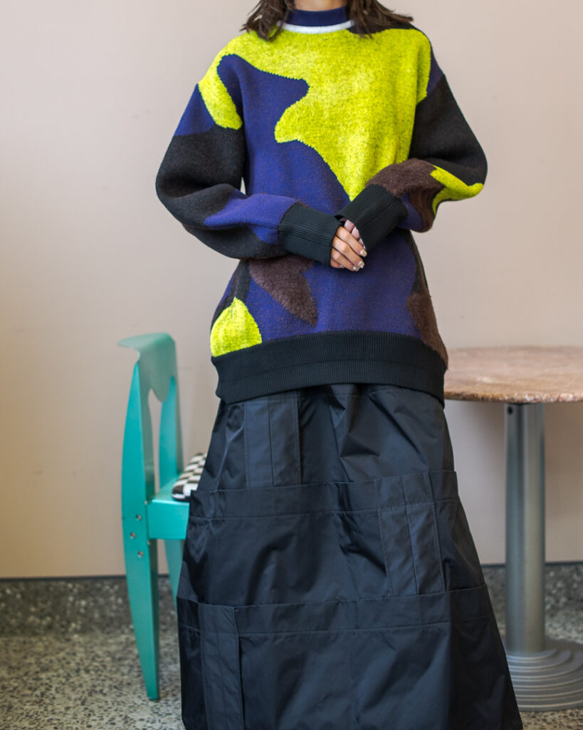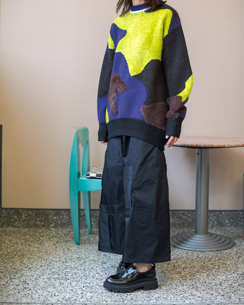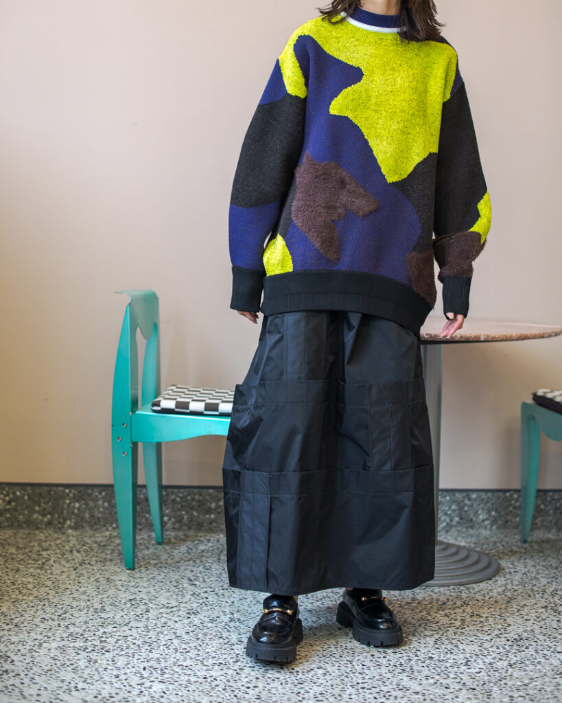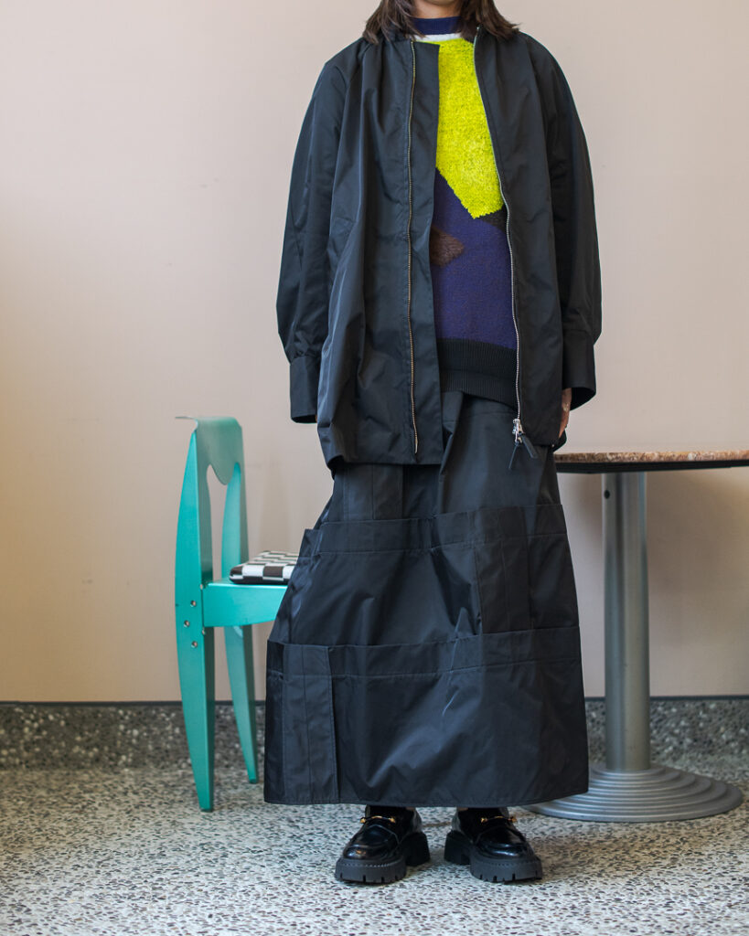 縫い代をあえて表出しにしたり、接ぐ位置をバラバラにしたり、段々と縫い繋げられたアンバランスなスカート。