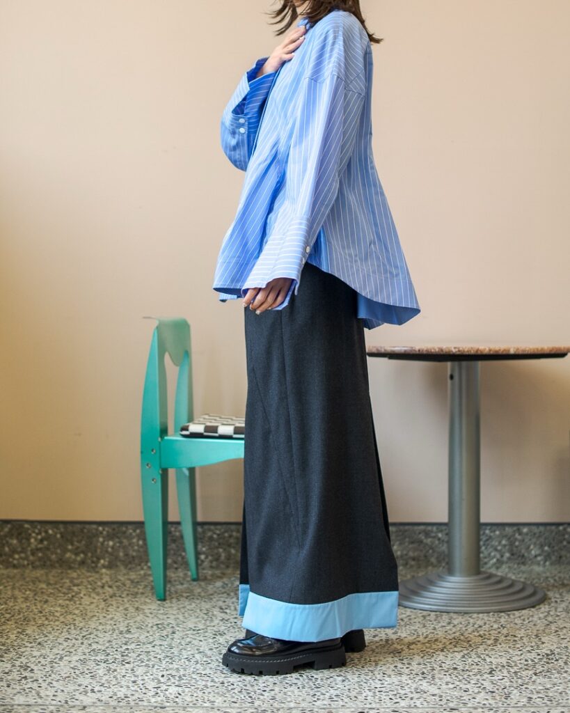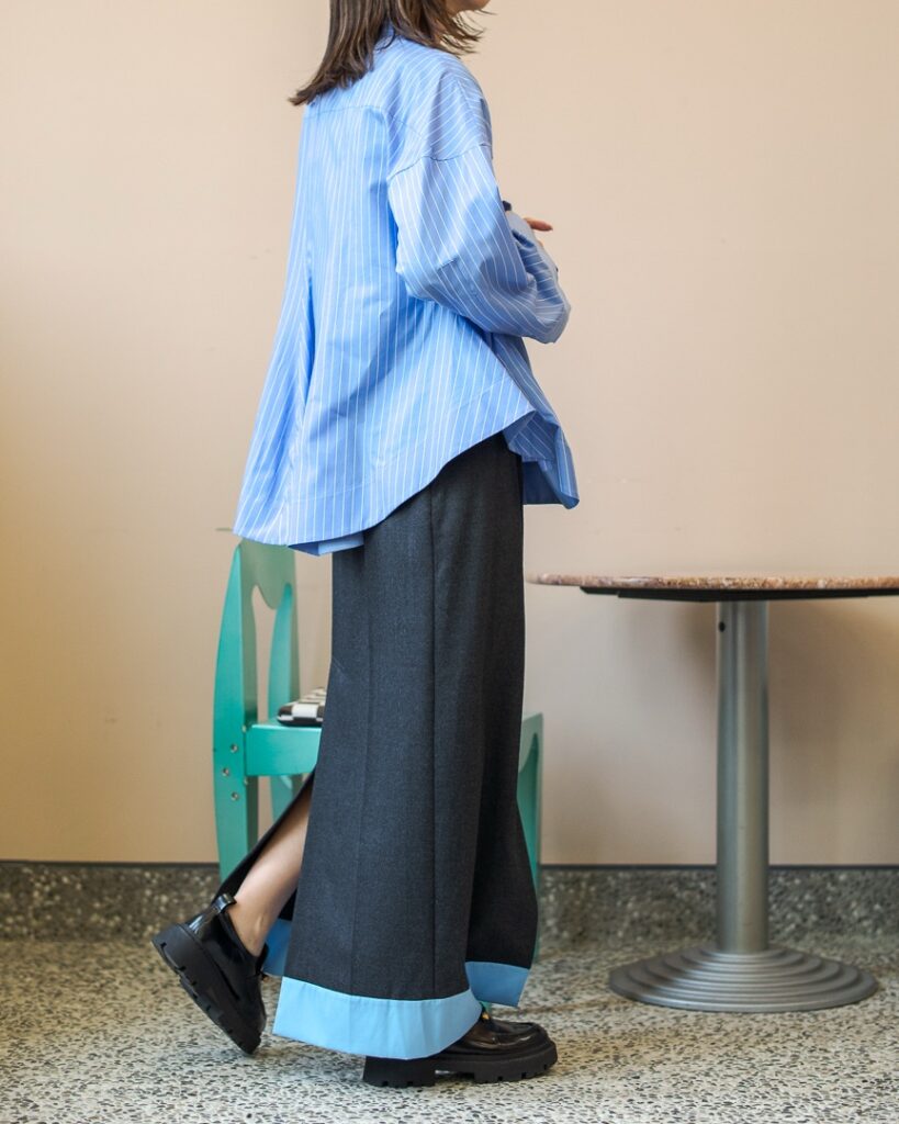Material … グレー部分:毛99% ポリウレタン1%|ブルー部分:コットン55% ポリエステル45%