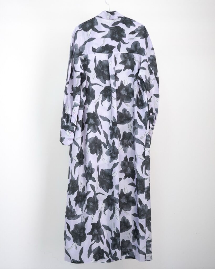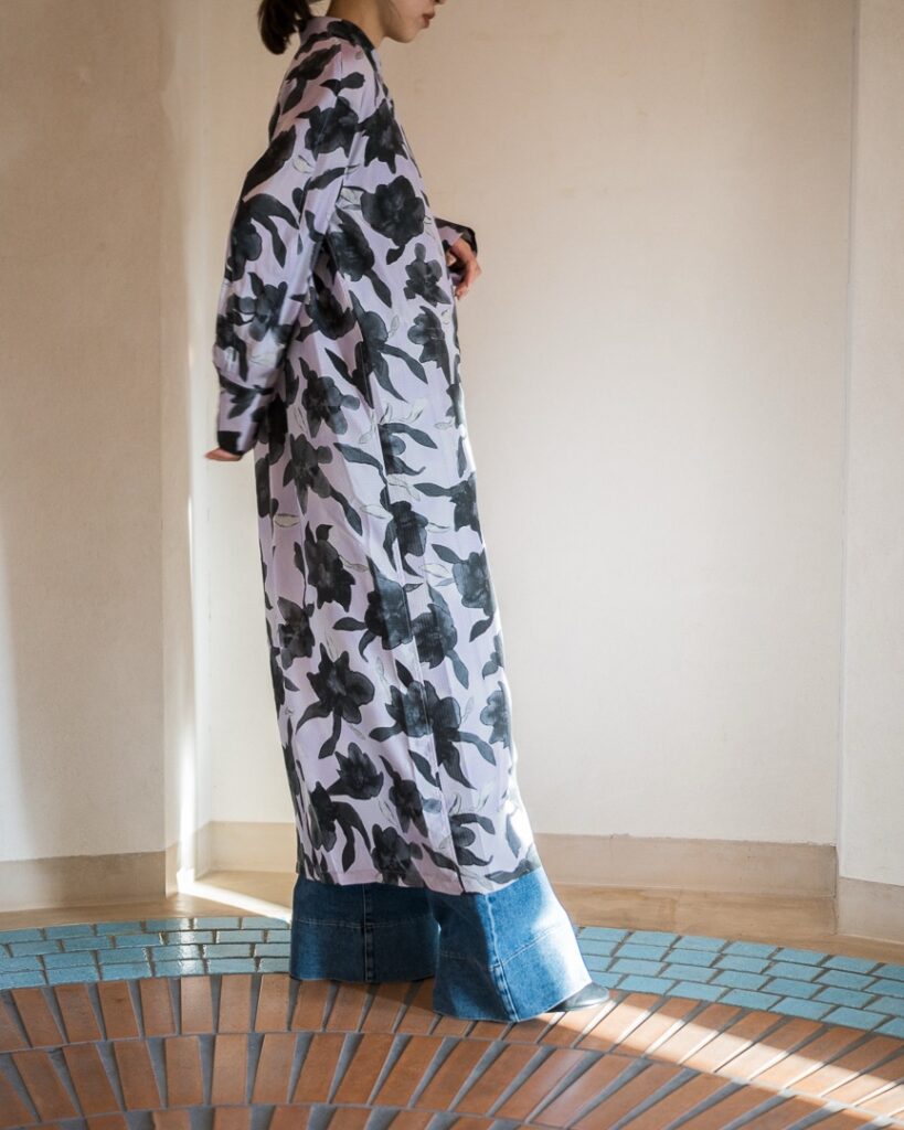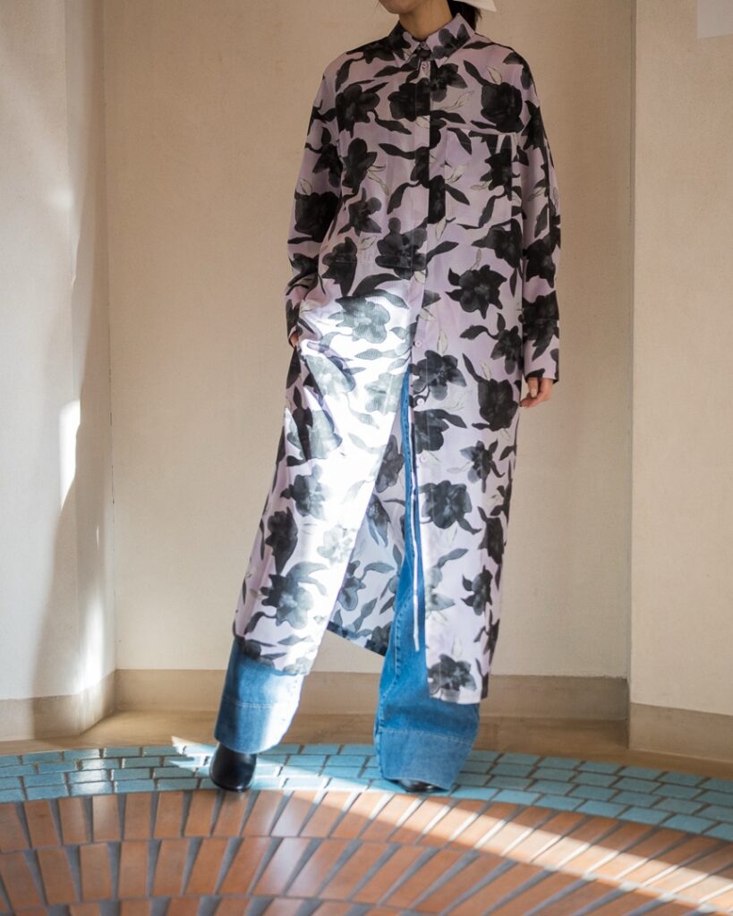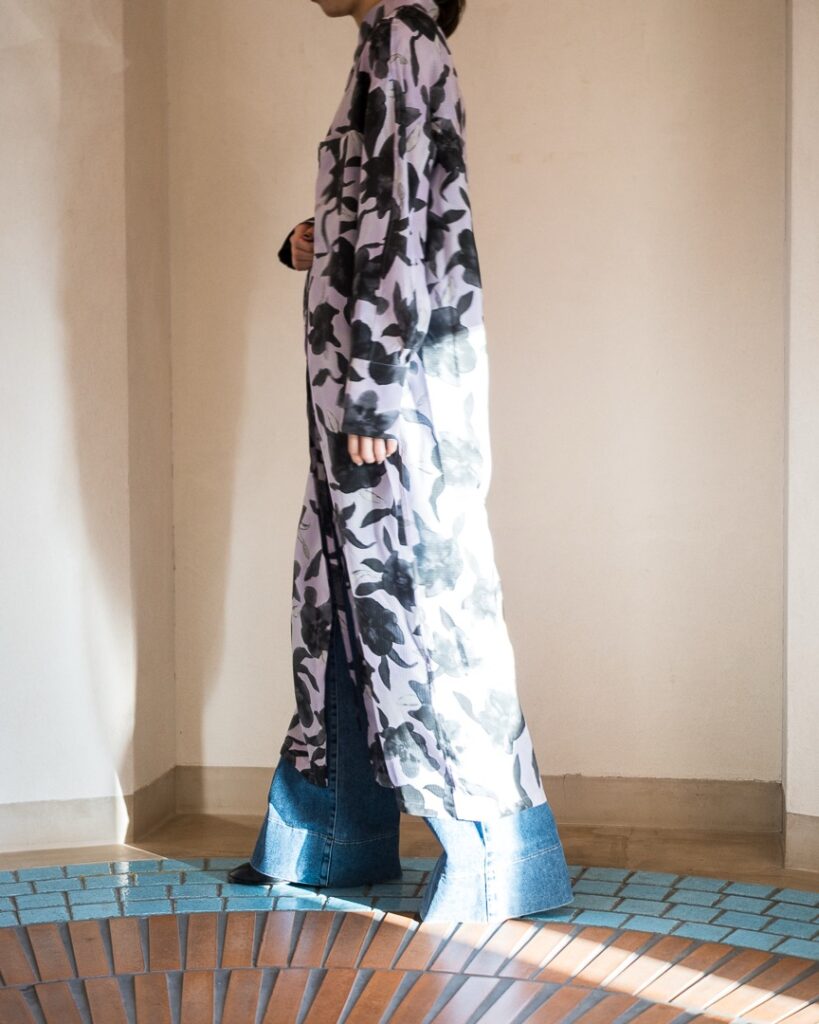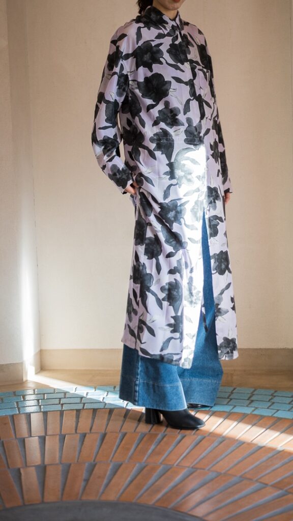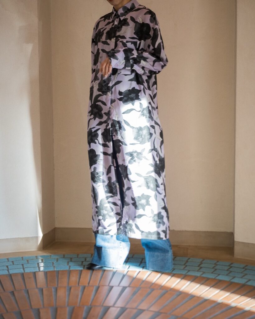 右ウエスト部分に調節用のドローコードがついたシルクシャツワンピース。