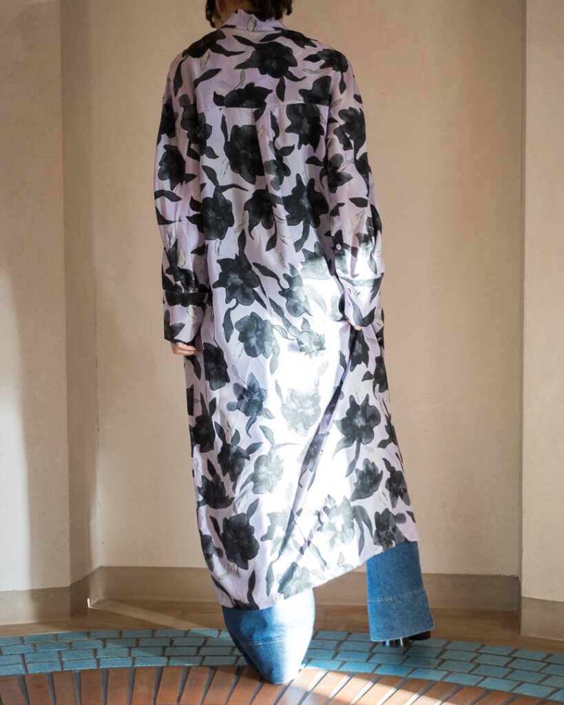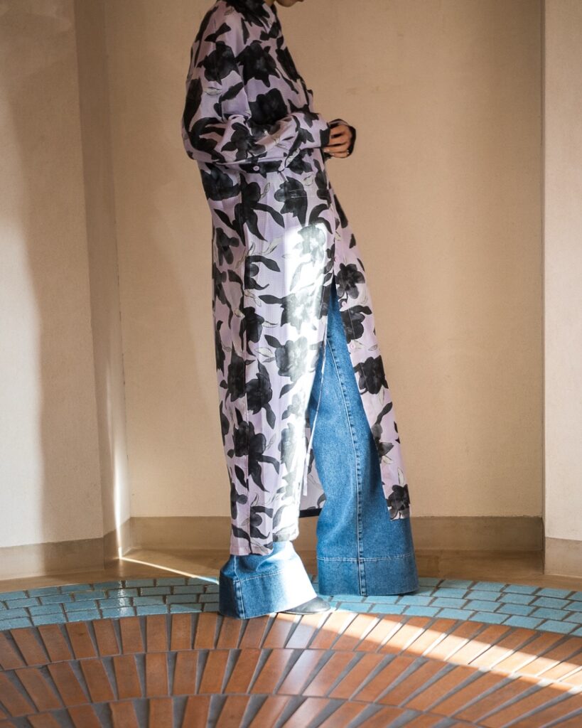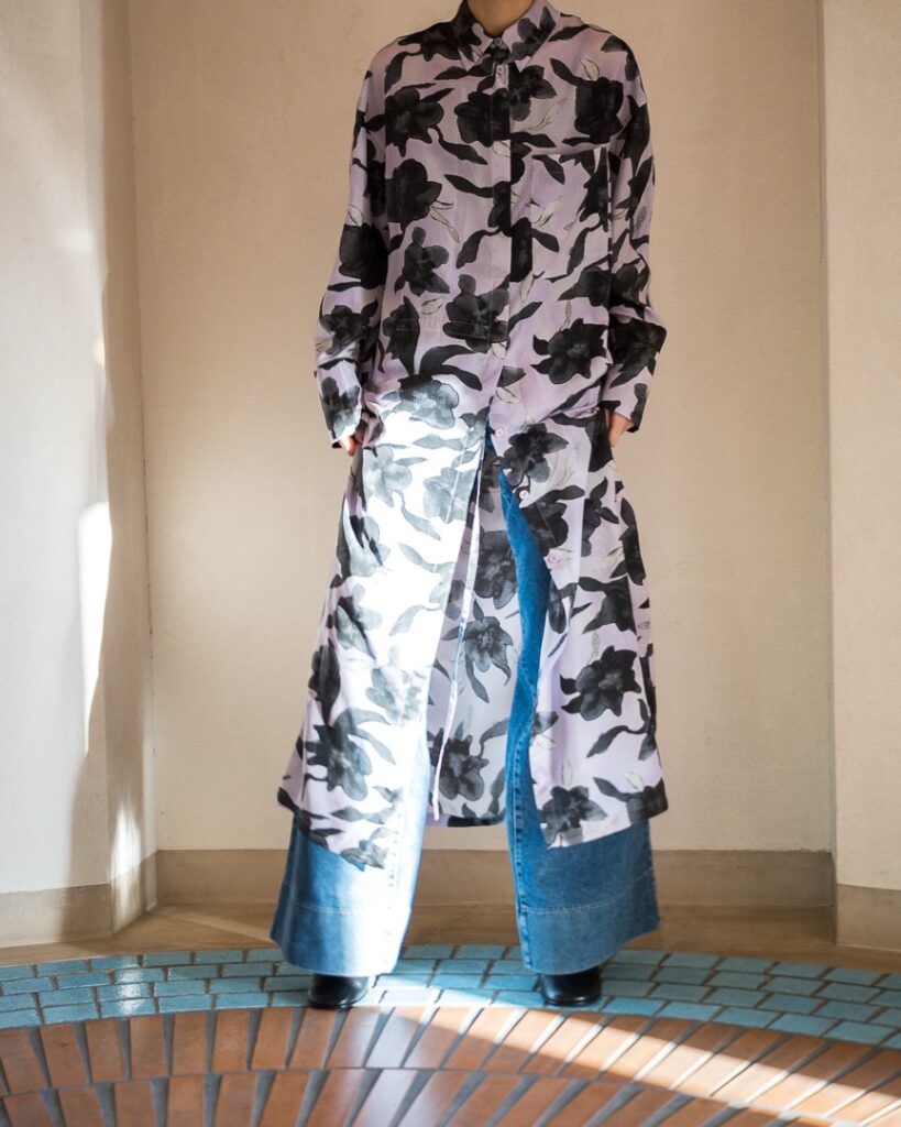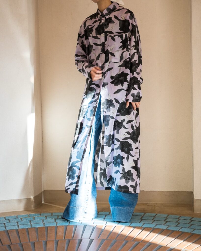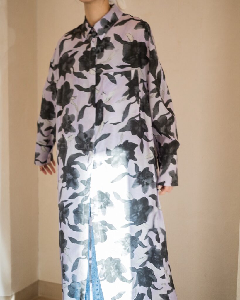 右ウエスト部分に調節用のドローコードがついたシルクシャツワンピース。