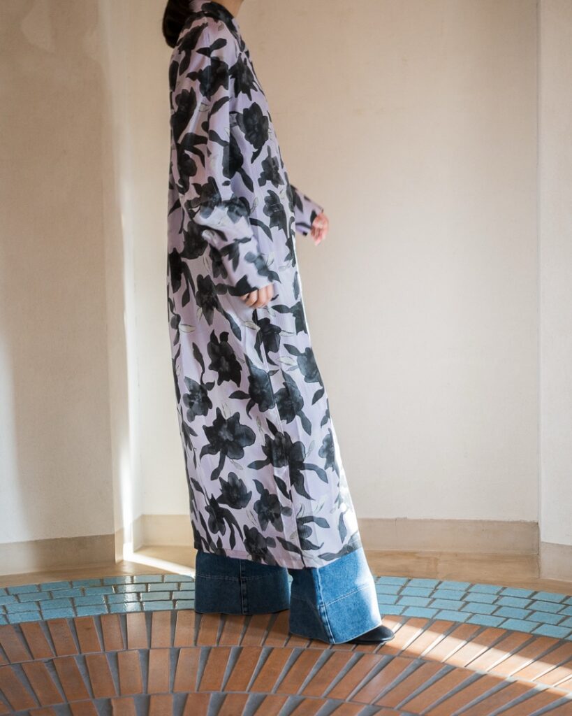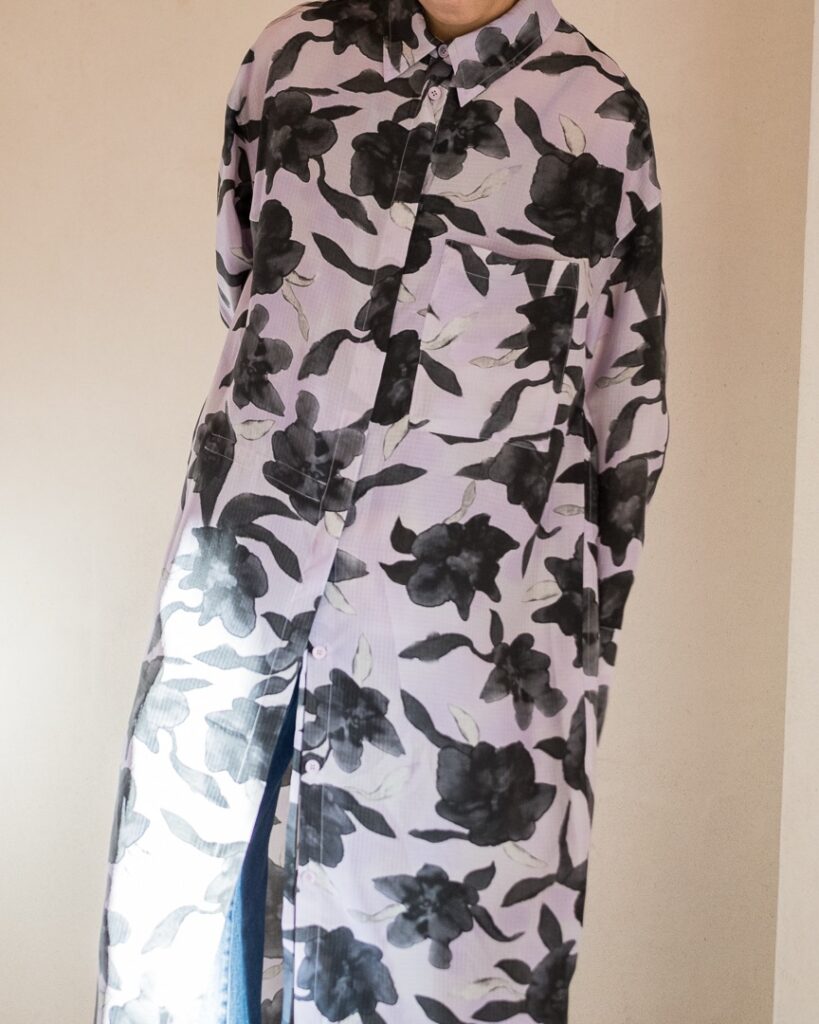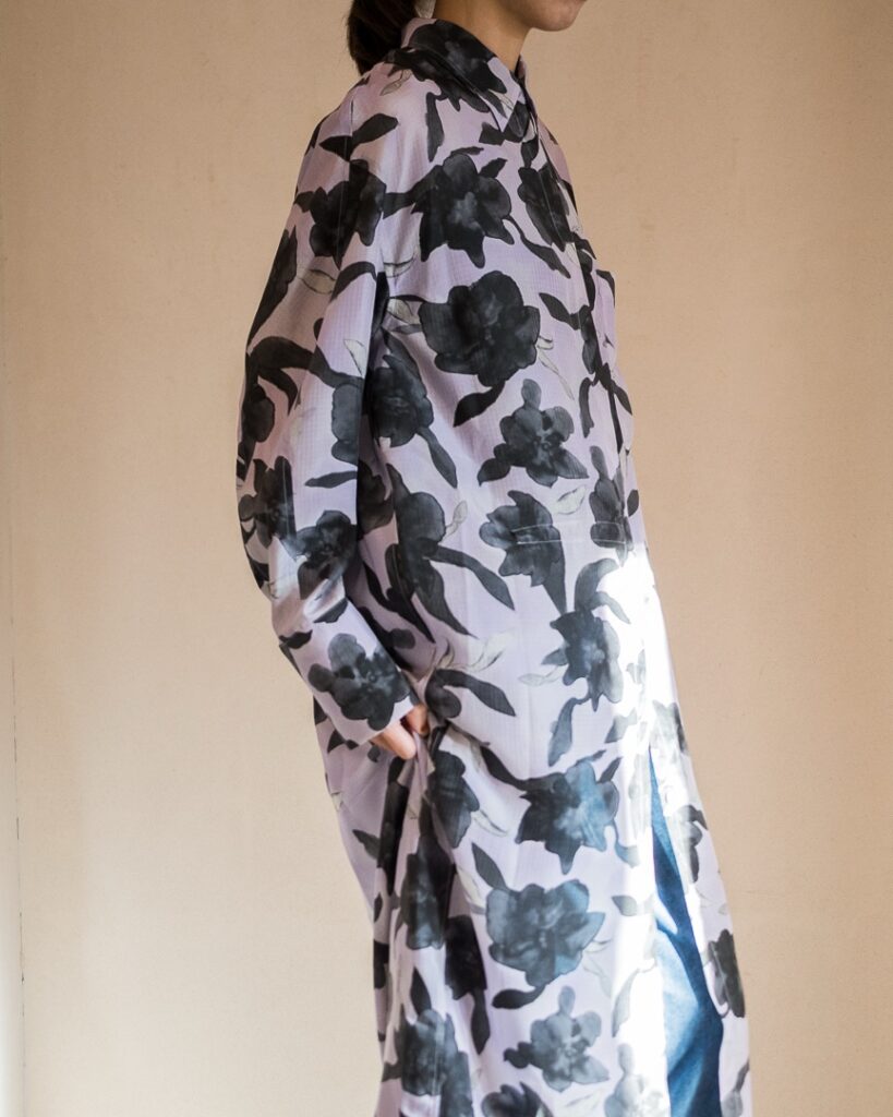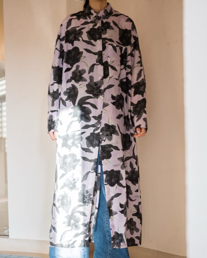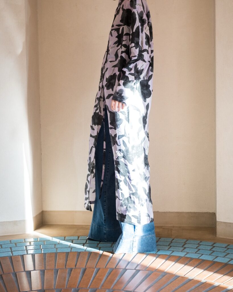 右ウエスト部分に調節用のドローコードがついたシルクシャツワンピース。