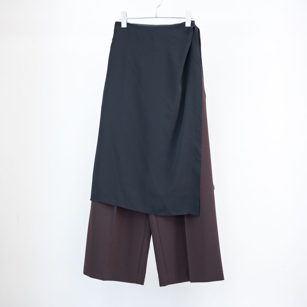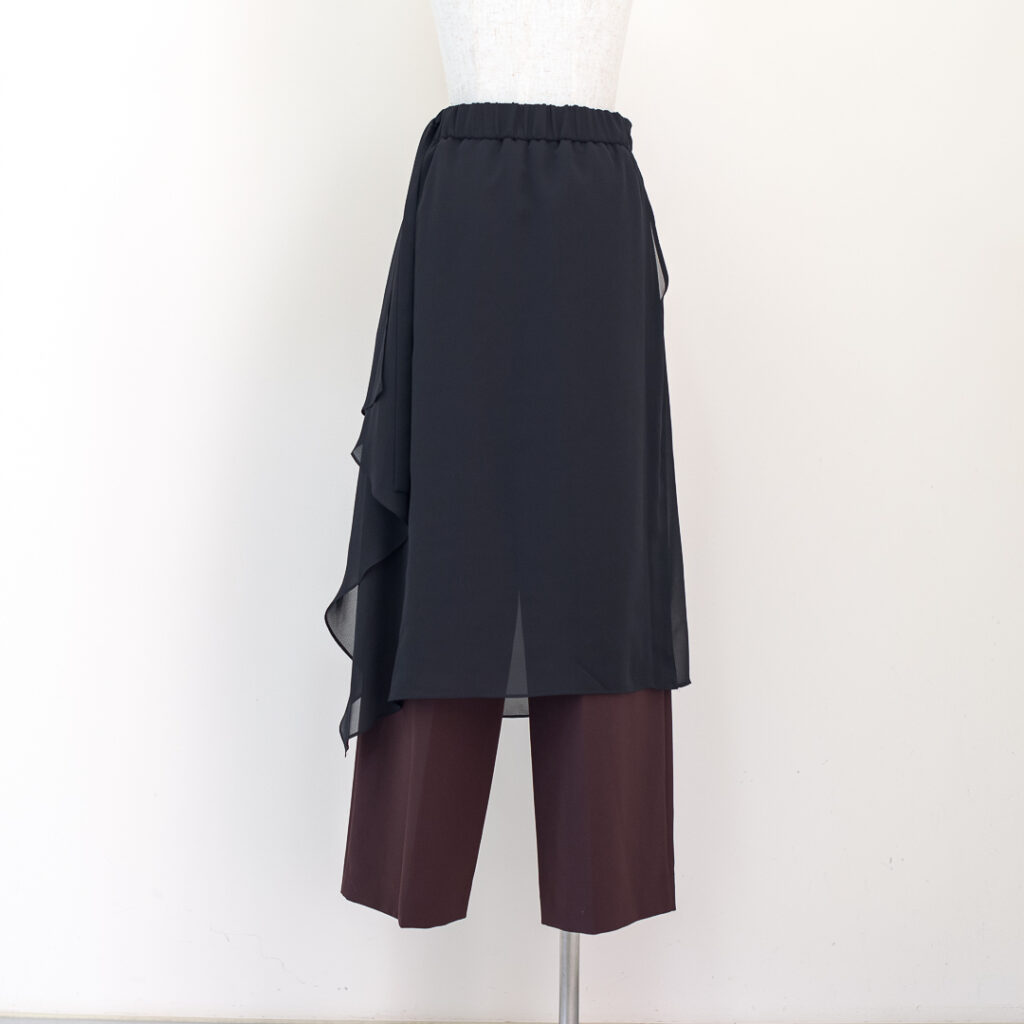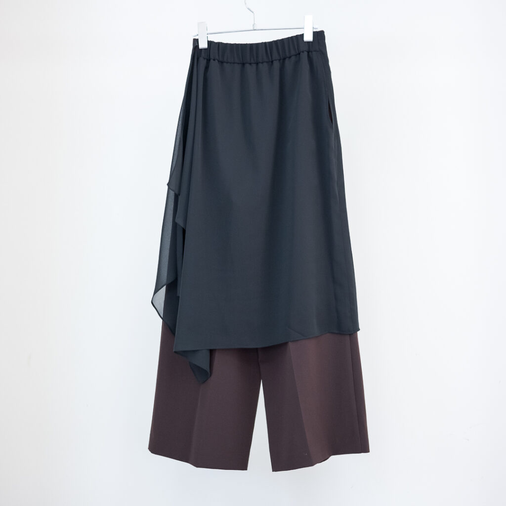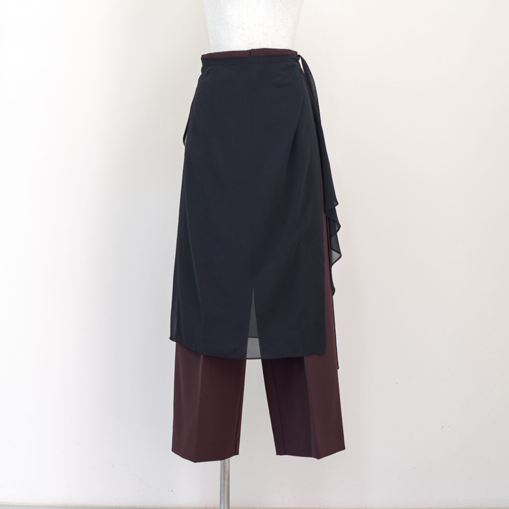 センタープレスのストレートパンツに、シアーなラップスカートがセットされたレイヤードデザインパンツ。ラップスカートは後ろ身頃のウエストに縫い込まれ、ズレる事なく着用頂けます。センタープレスパンツはポリエステル素材でシワをを気にせず着用頂けます。ラップスカートはシアーなポリエステル素材が軽やかなマテリアルを使用しています。