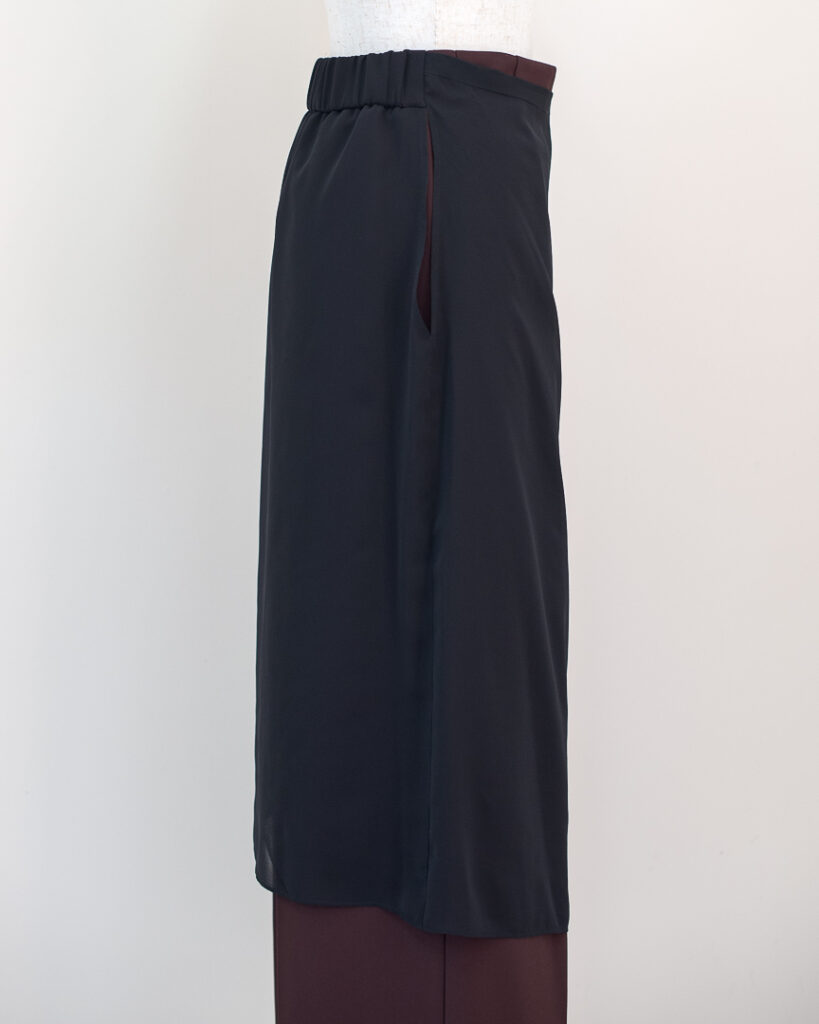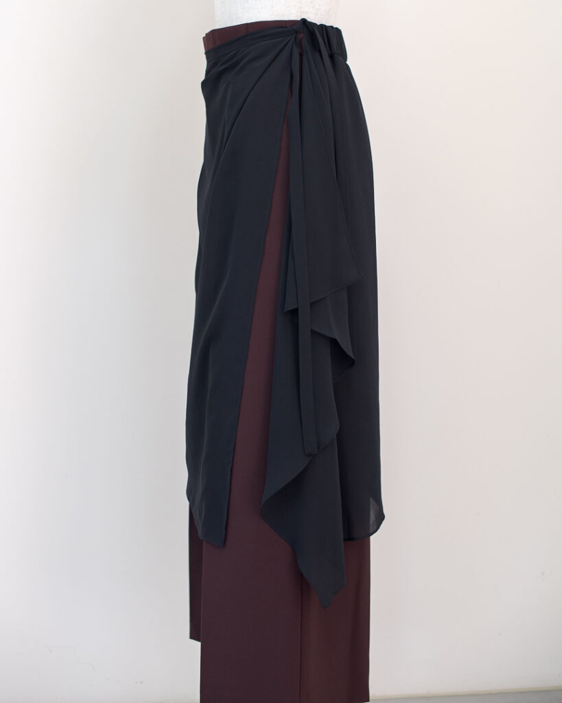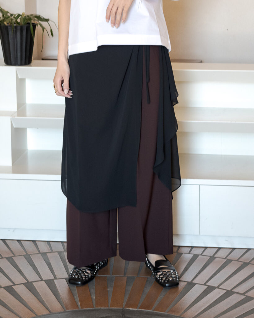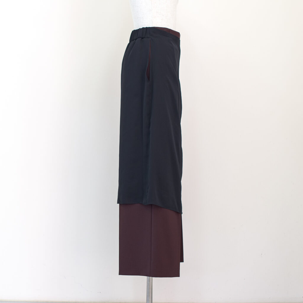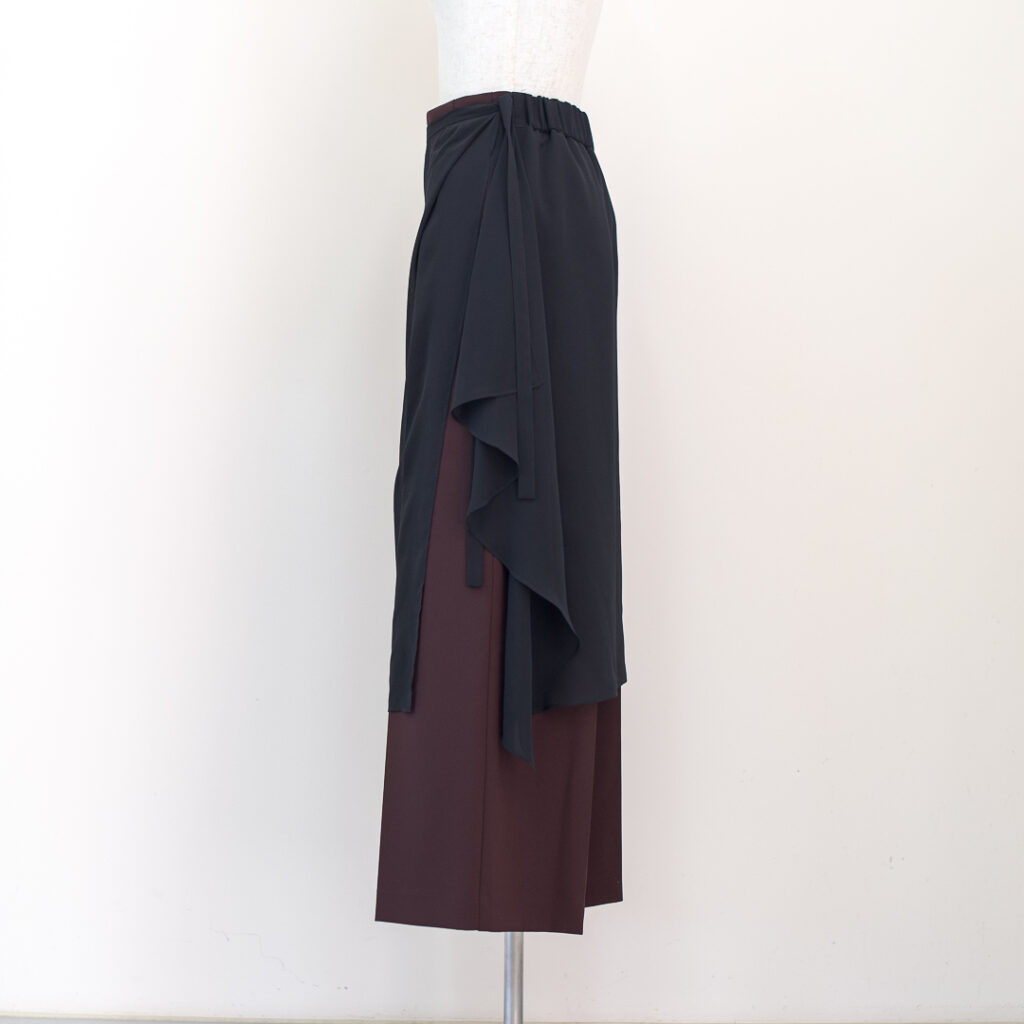 センタープレスのストレートパンツに、シアーなラップスカートがセットされたレイヤードデザインパンツ。ラップスカートは後ろ身頃のウエストに縫い込まれ、ズレる事なく着用頂けます。センタープレスパンツはポリエステル素材でシワをを気にせず着用頂けます。ラップスカートはシアーなポリエステル素材が軽やかなマテリアルを使用しています。