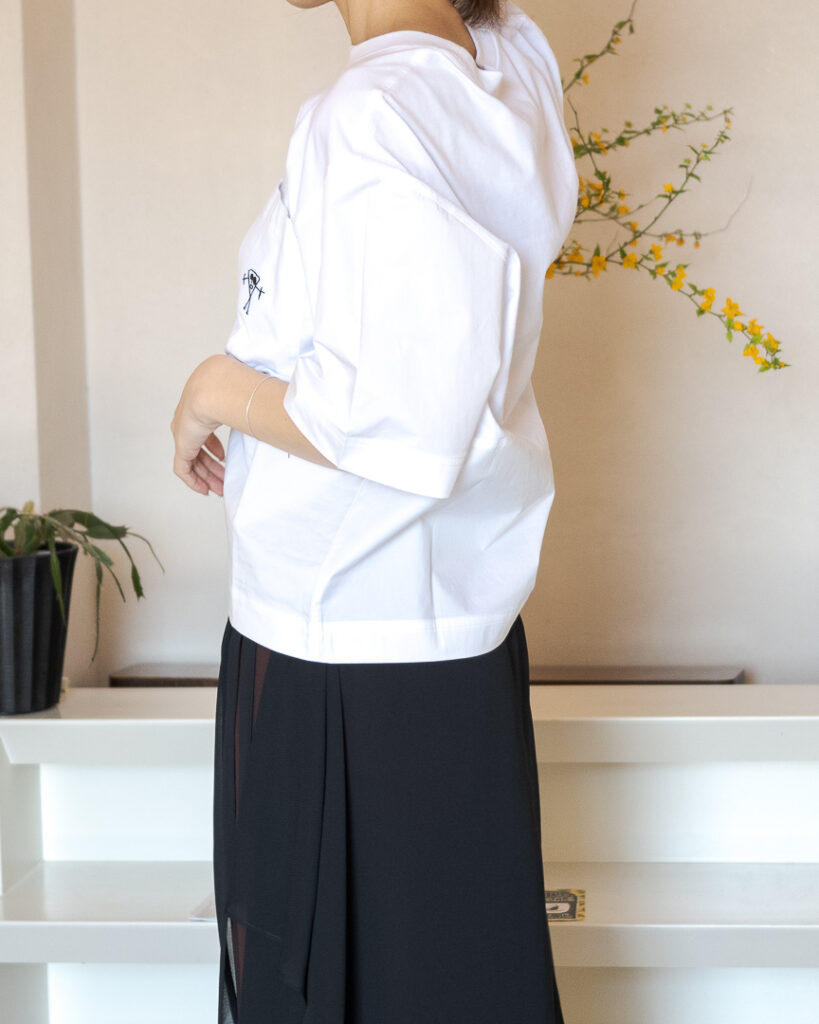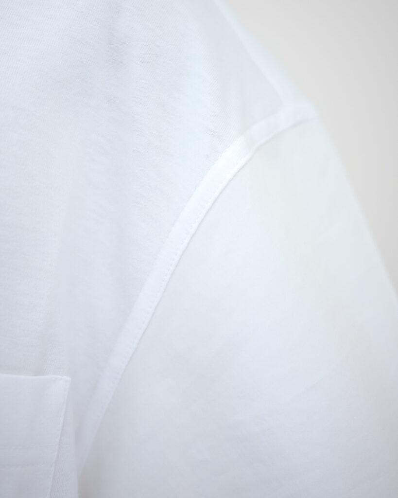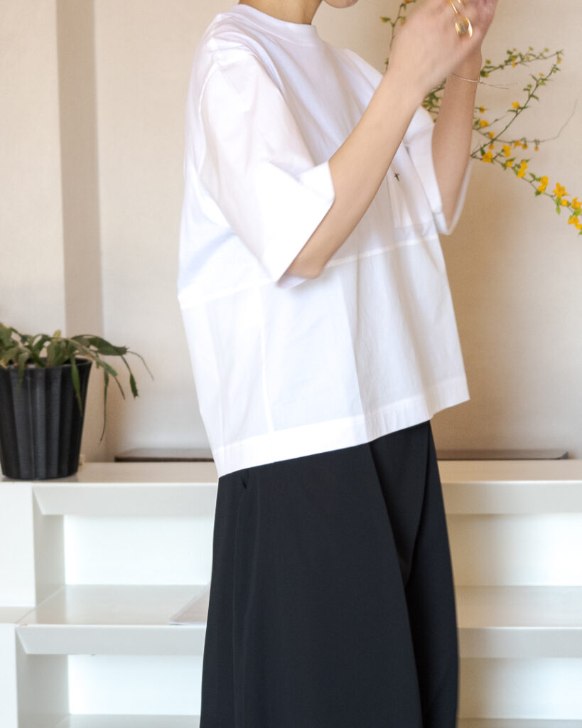 身頃部分はジャージー生地、袖と裾部分はシャツ生地を使用した切り替えTシャツ。