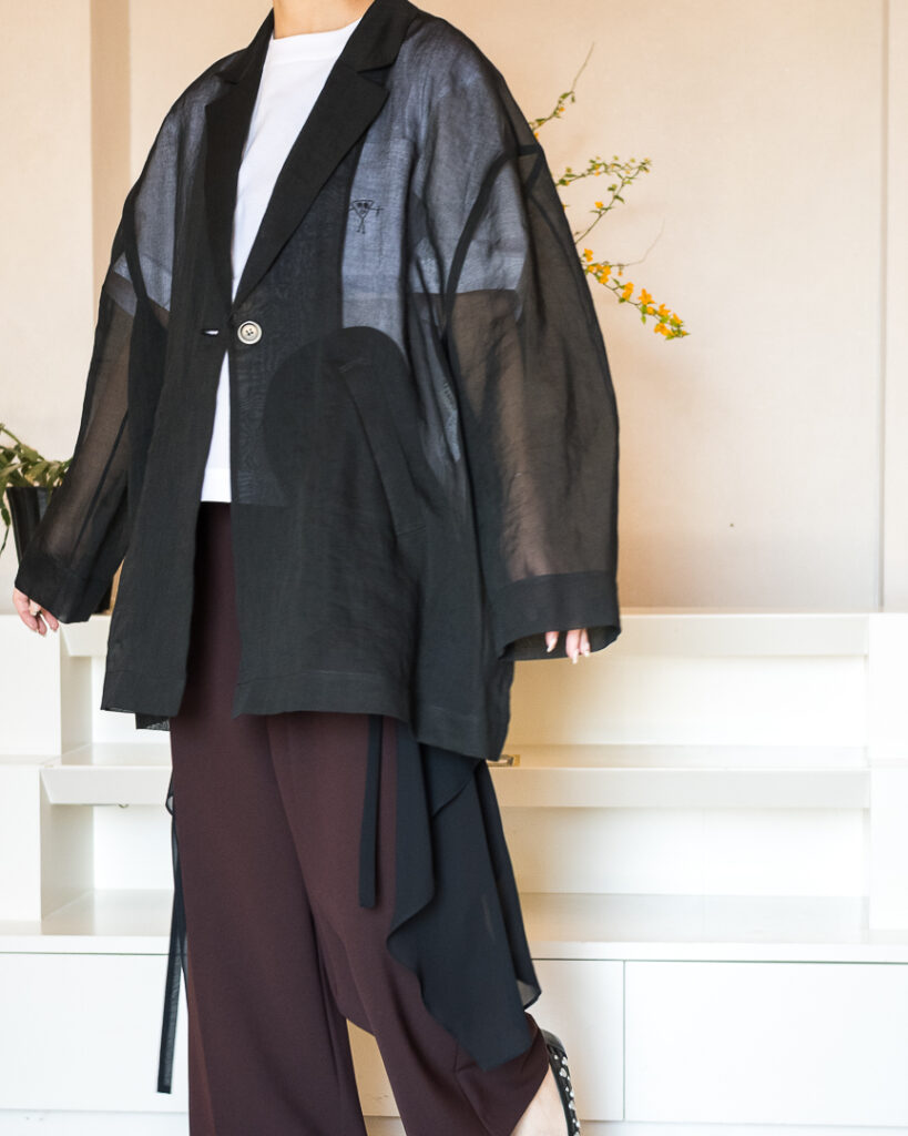 シアー素材を採用することで軽く羽織れることができ、スタイリングに抜け感とアクセントをプラスしてくれます。
